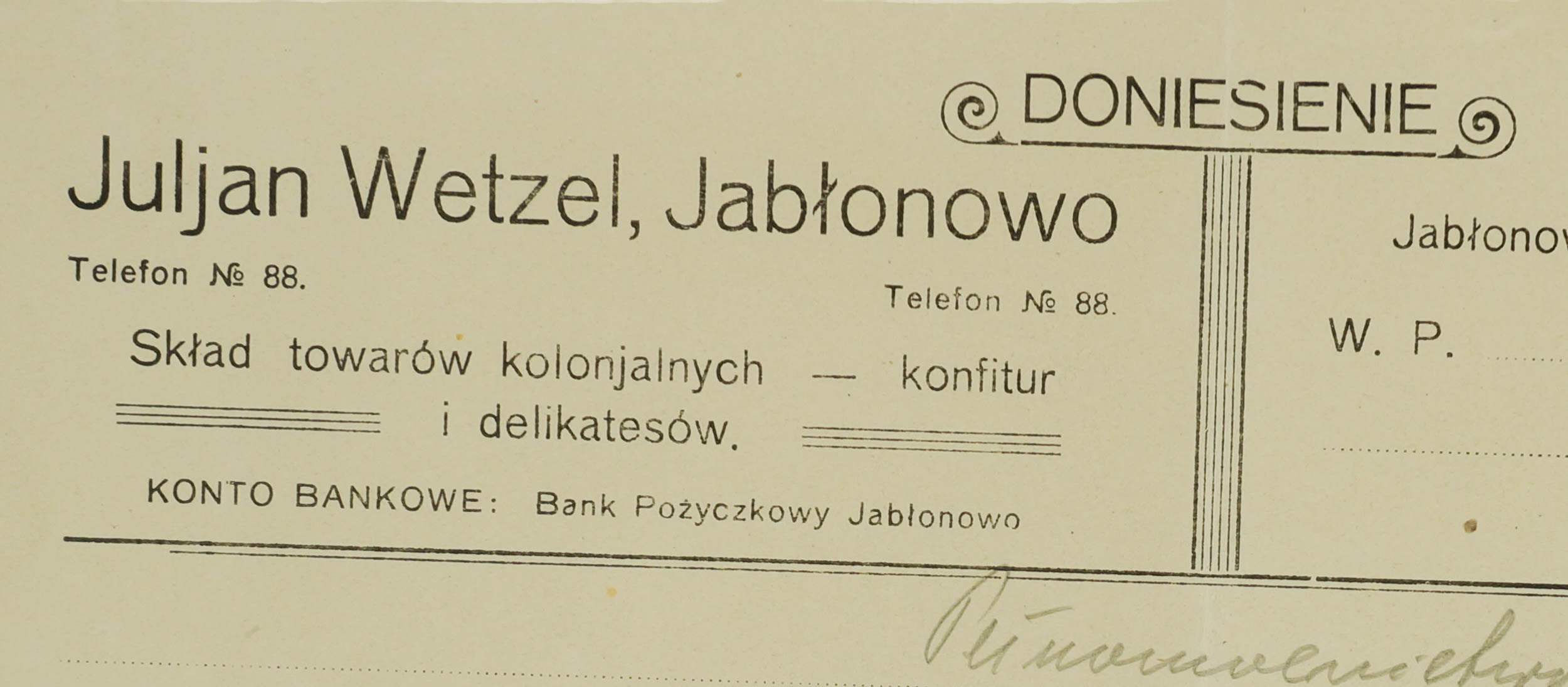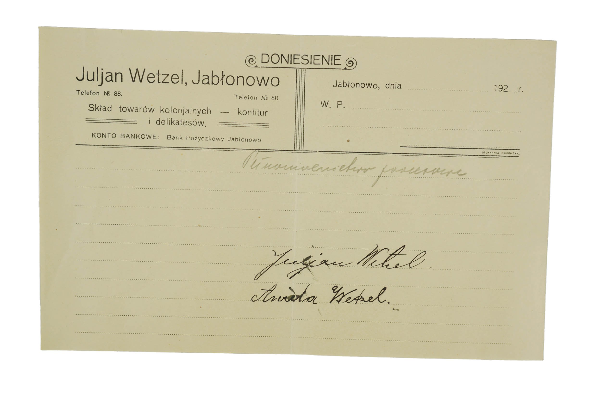 [JABŁONOWO] Julian Wetzel Skład towarów kolonialnych, konfitur i delikatesów, autografy właścicieli [przed 1930r.]