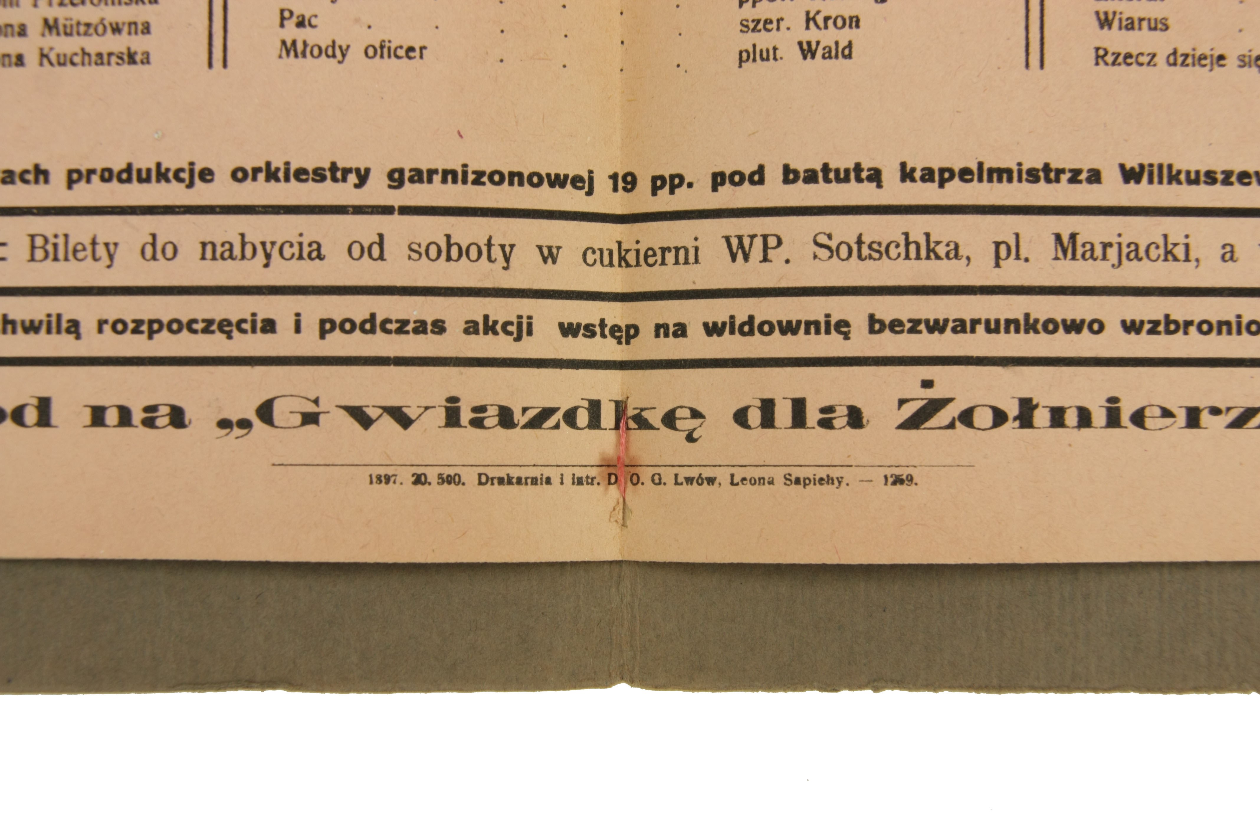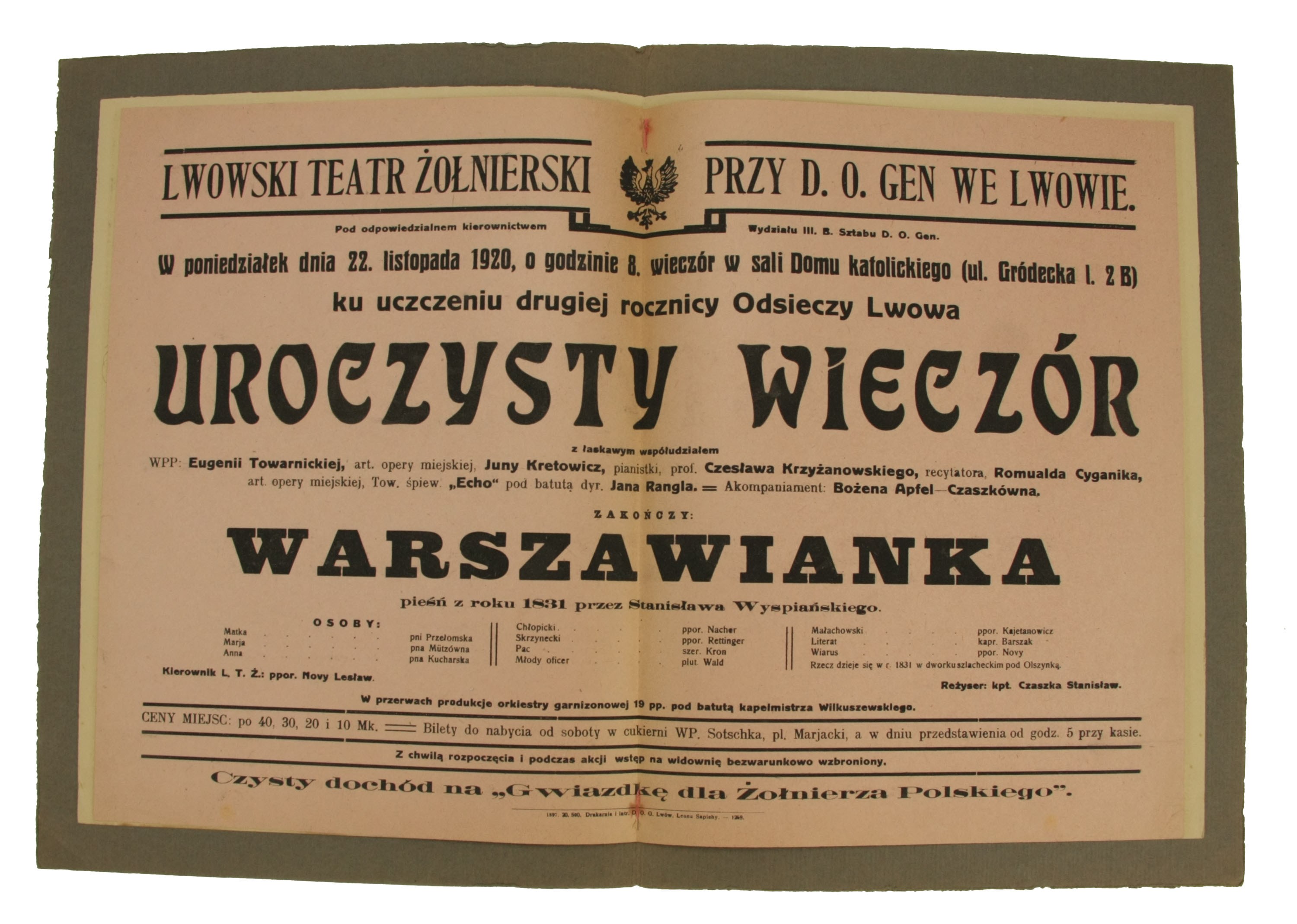 Józef Piłsudski, ozdobne artystyczne zaproszenie na Uroczysty Wieczór w 2 rocznice odsieczy Lwowa 1920 r. Okładki tekturowe 26 x 36 cm. Cztery strony, pierwsza strona malowana. Wym. 24 x 32 cm. Wewnątrz afisz teatralny 47 x 32 cm. Sygnatura artysty.