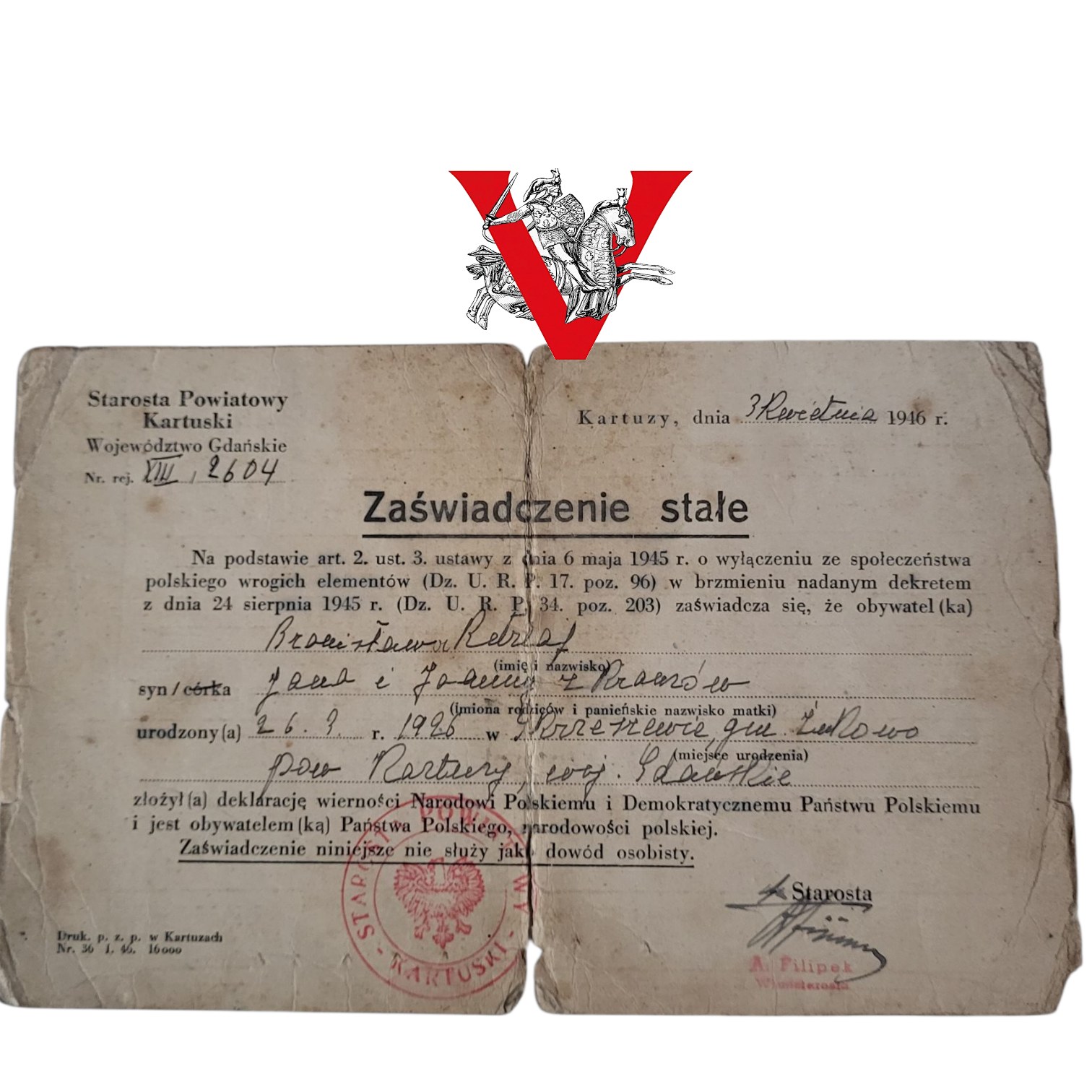 Dokument wydany na podstawie ustawy z 6 maja 1945 roku o wyłączeniu ze społeczeństwa polskiego elementów wrogich Państwu Polskiemu.
