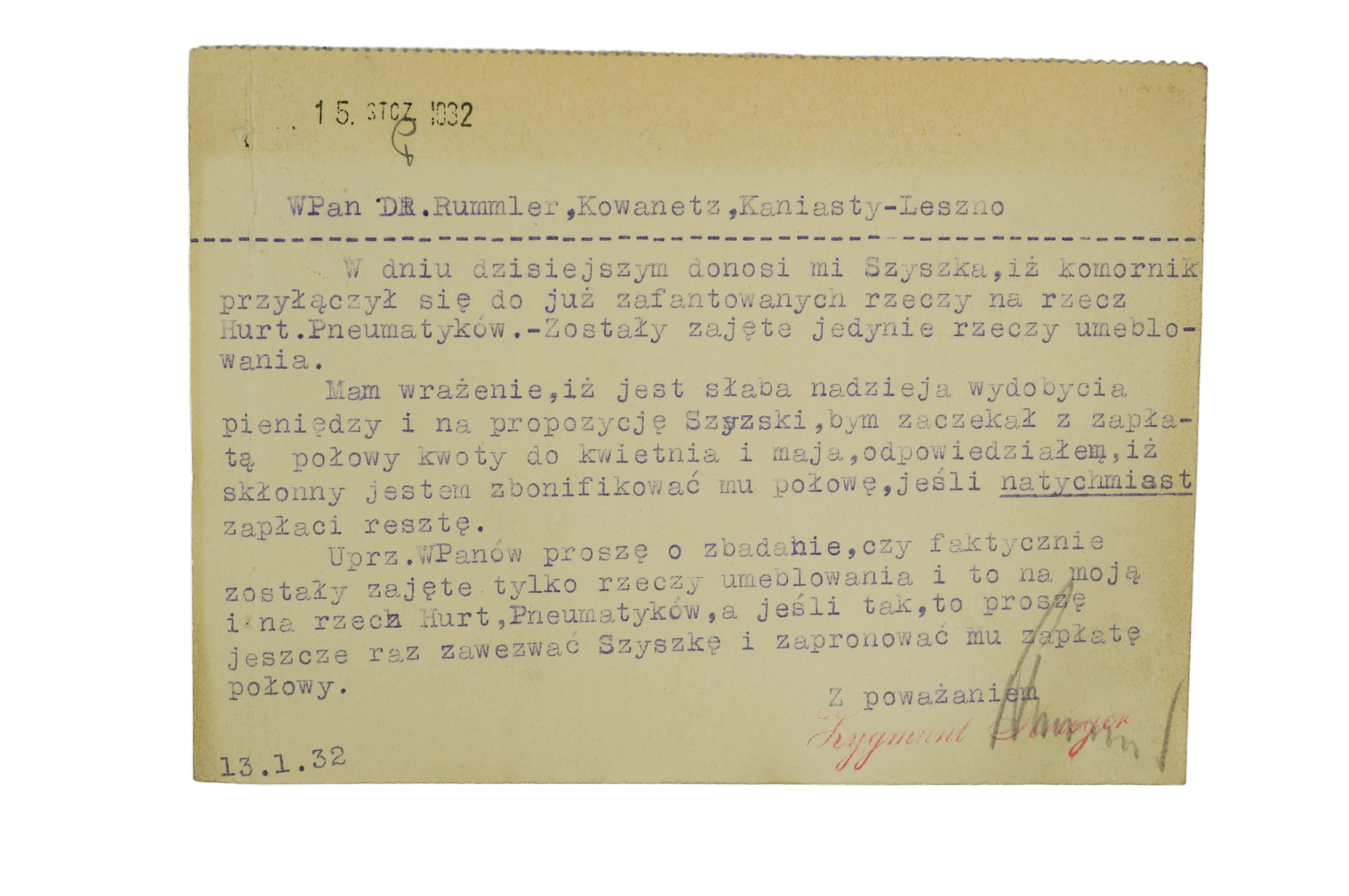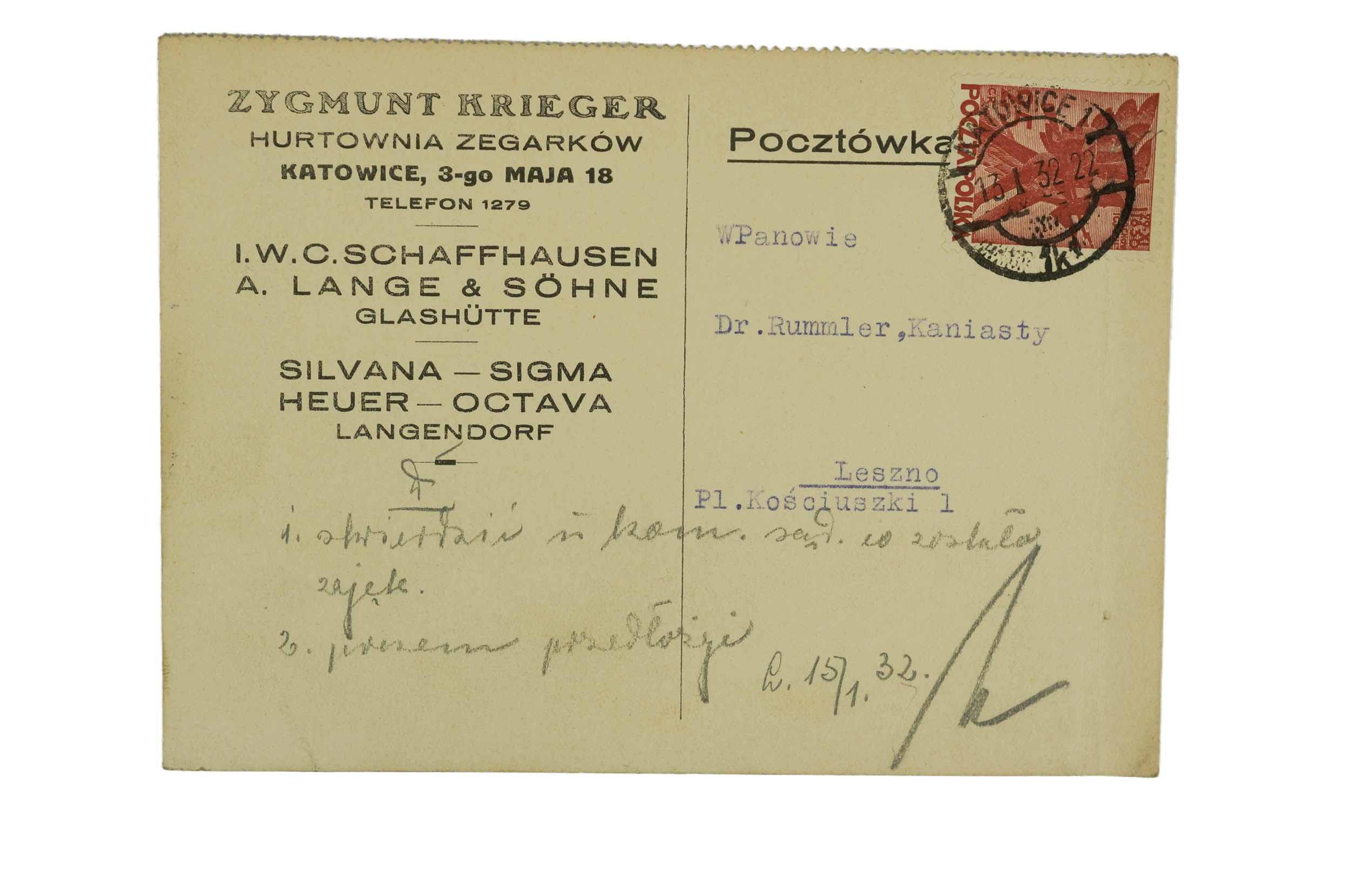 [KATOWICE] Zygmunt Krieger Hurtownia zegarków POCZTÓWKA z dnia 13.1.1932r., maszynopis w języku polskim na pocztówce z nagłówkiem firmy, f. 14,5x10,5cm