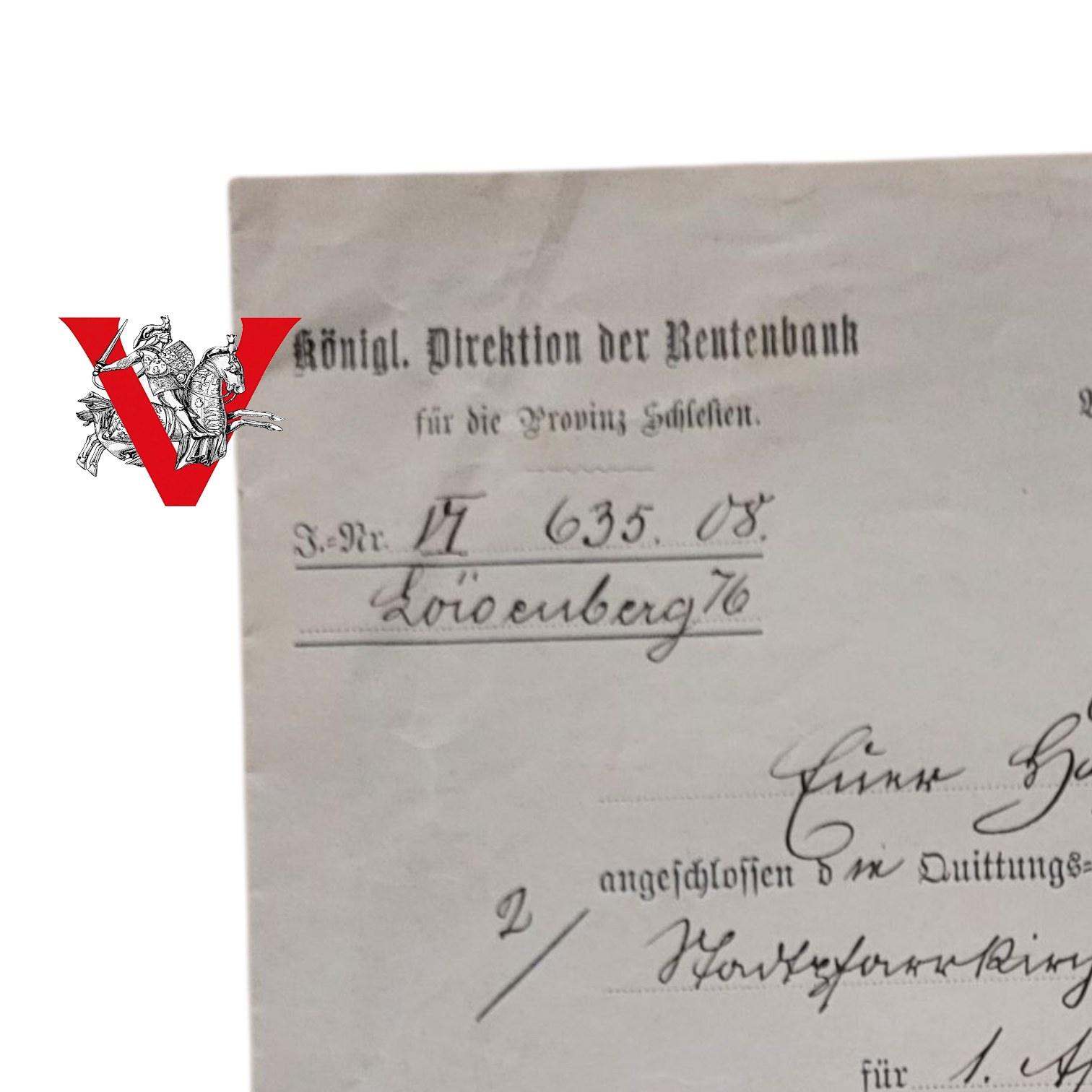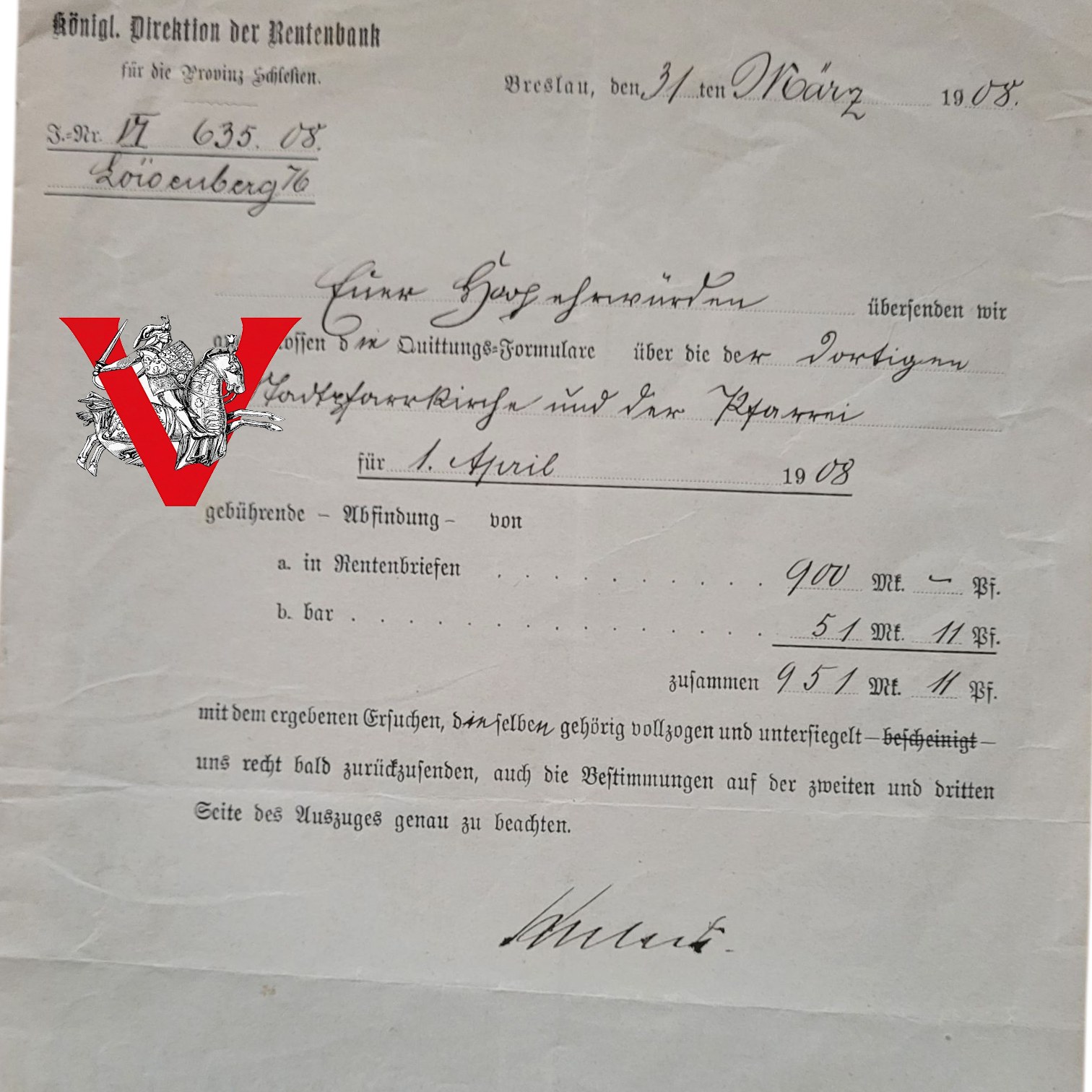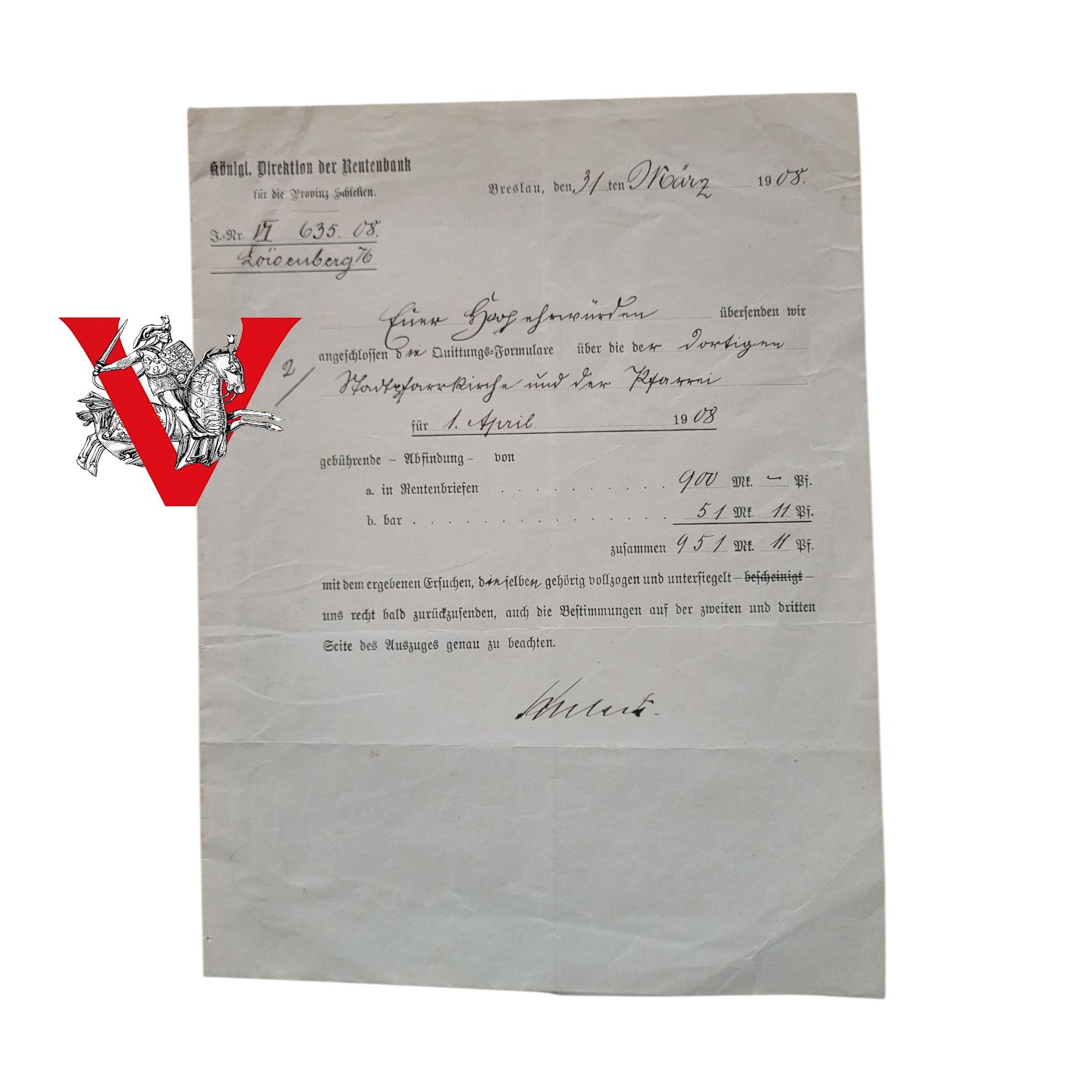 Oryginalny dokument bankowy wystawiony 31 marca 1908 roku przez Królewski Bank Rentenbank dla prowincji Śląsk z siedzibą w Breslau (Wrocławiu). Pismo dotyczy rozliczenia finansowego i przekazania środków w wysokości 951 marek i 11 pfennigów na adres Löwenberg (Lwówek Śląski). Zawiera numer sprawy IV 635/08 oraz odręczny podpis urzędnika bankowego.