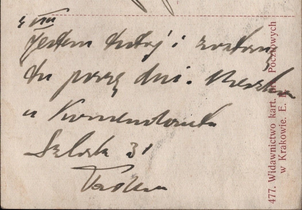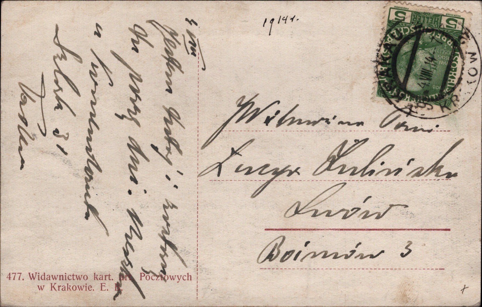 Pocztówka z widokiem Krakowa pisana przez Tadeusza Żulińskiego i wysłana z Krakowa do Lwowa 4 VIII 1914. W treści informacja o przybyciu do Krakowa i zamieszkaniu u Komendanta przy ul. Szlak 31.