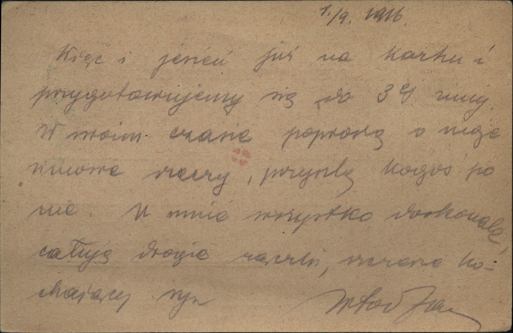 Polowa karta korespondencyjna (wym. 13,8 x 8,8 cm) datowana 1 IX 1916 pisana przez szefa sztabu Komendy Legionów Polskich kpt. Włodzimierza Zagórskiego. Adresowana do matki przebywającej wówczas w Wiedniu.