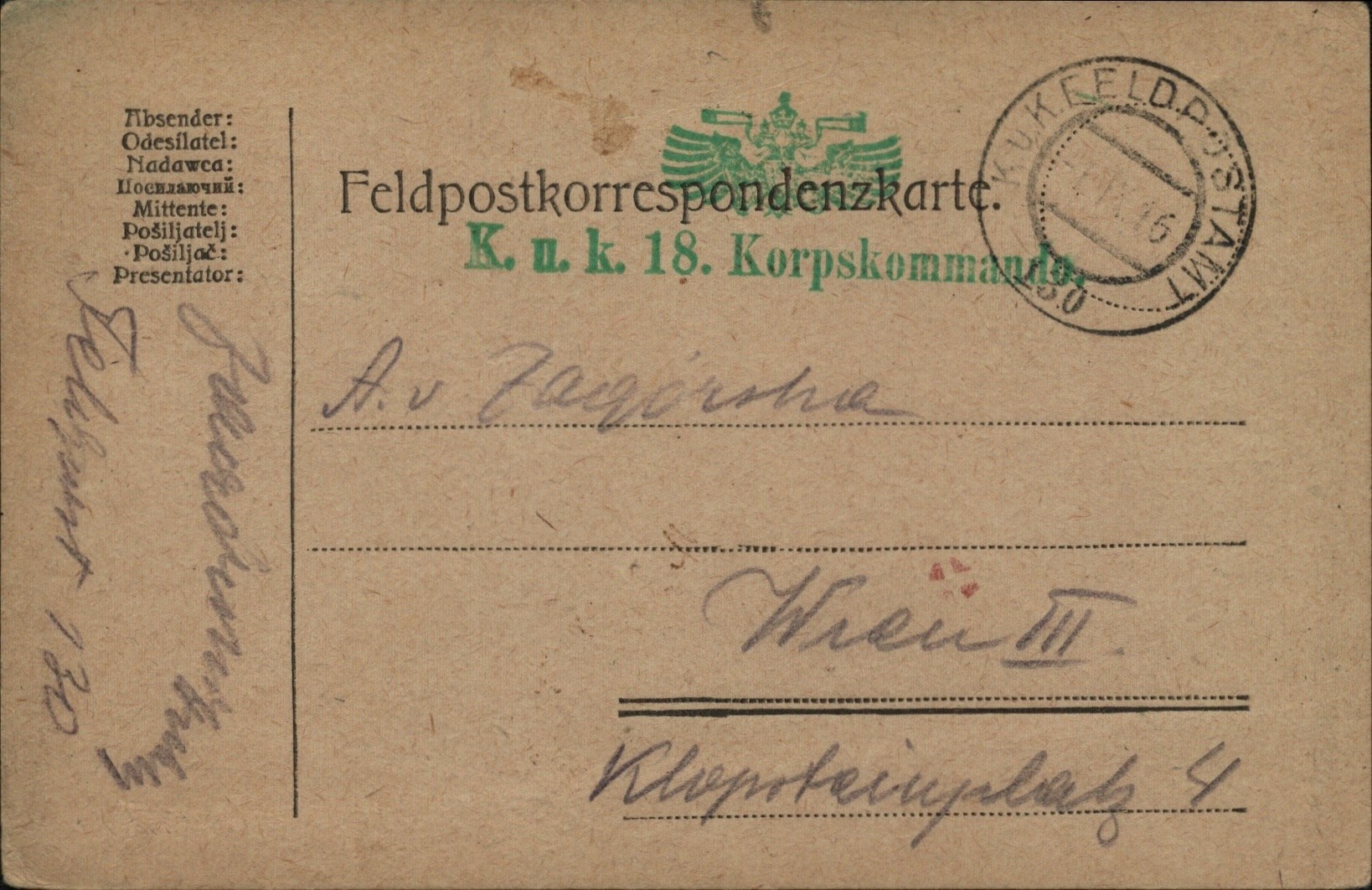 Datownik pocztowy c. i k. Urzędu Poczty Polowej, podłużna pieczątka c. i k. komendy 18. Korpusu. Minimalne zagniecenie i drobne zaplamienie.