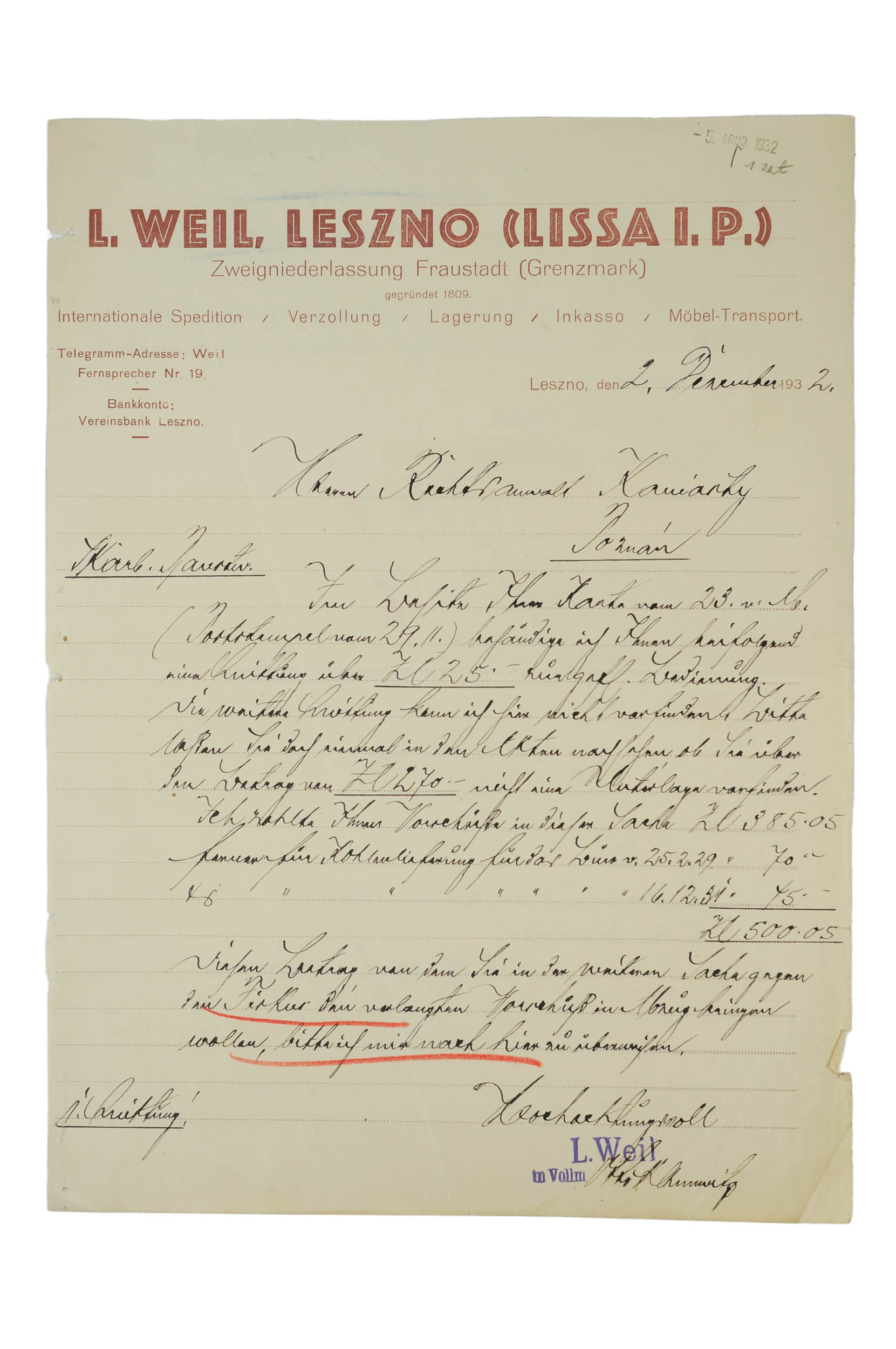 [LESZNO / WSCHOWA] L. Weil Spedycja międzynarodowa KORESPONDENCJA z 2 grudnia 1932r., rękopis w języku niemieckim na druku z nagłówkiem firmy, f. 21x29cm