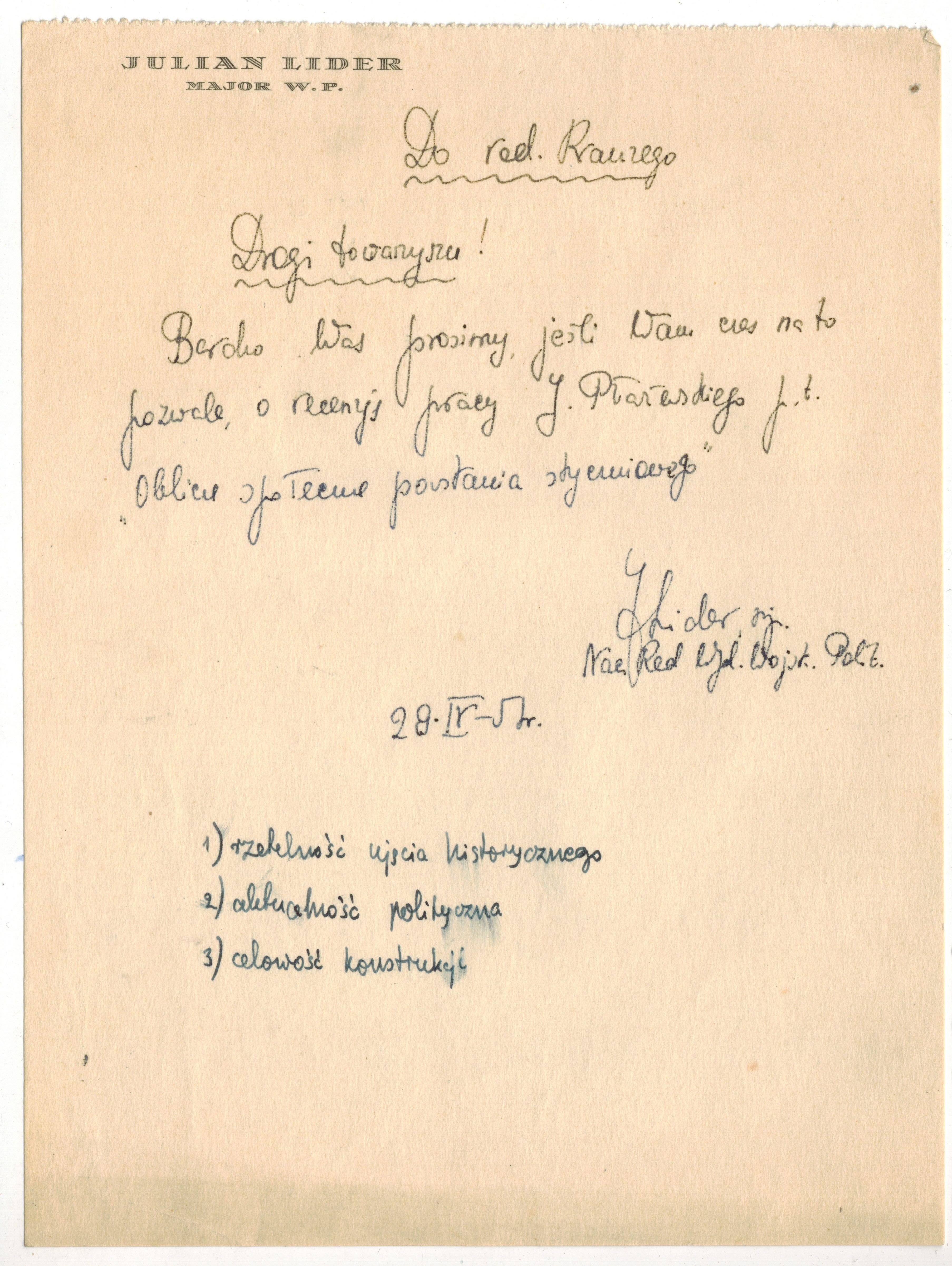 List, z dnia 28.IV.51r., zaadresowany: Do red. Krauzego. W treści prośba o recenzję pracy J. Płażewskiego p.t. Oblicze społeczne powstania styczniowego [praca magisterska Jerzego Płażewskiego, SGPiS, 1950 rok]. Podpis autora JLider mjr. Nacz.Red.Wyd.Wojsk.Polit.