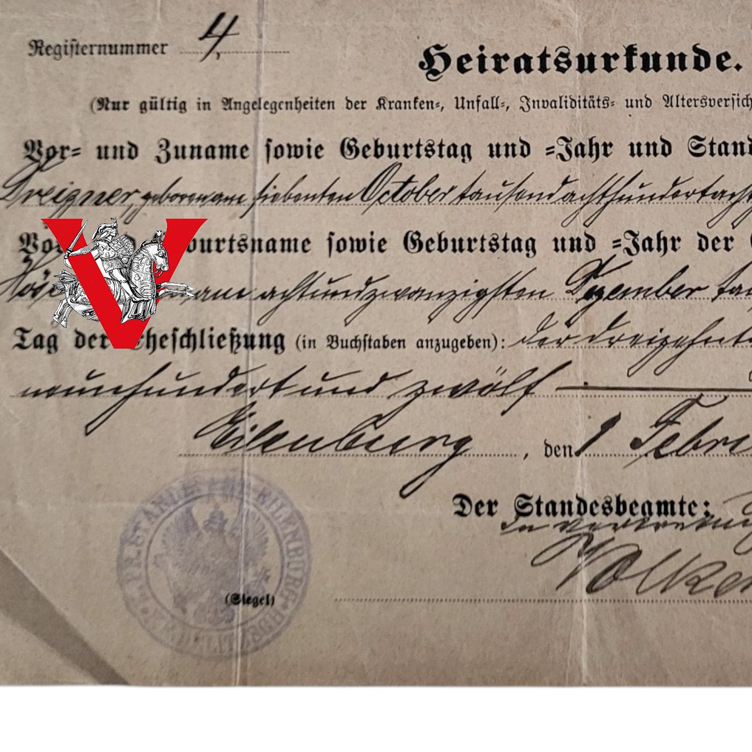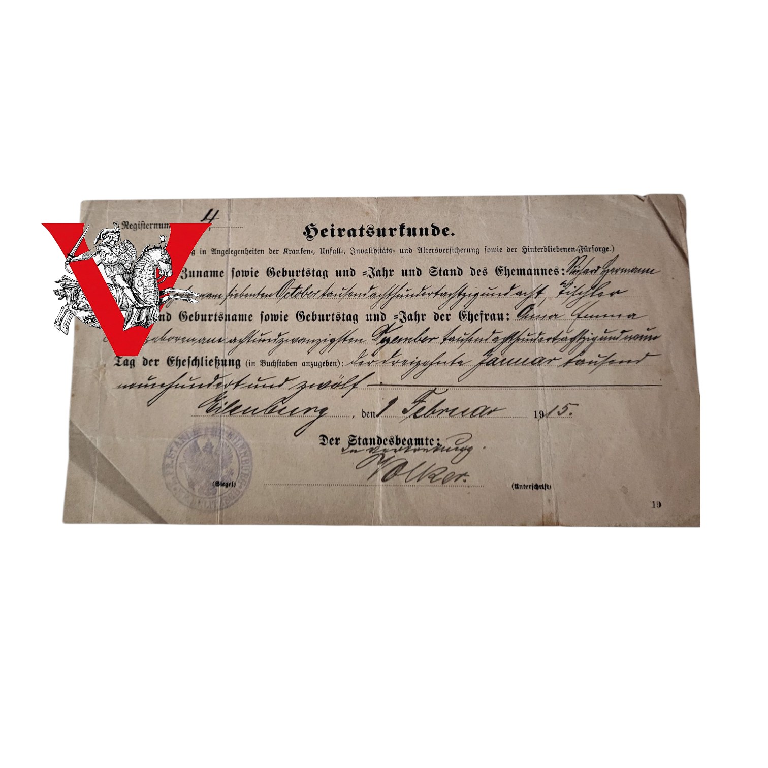 Oryginalny akt małżeństwa (Heiratsurkunde) wystawiony w 1915 roku w Lubinie (Lüben) na Śląsku. Dokument urzędowy sporządzony w języku niemieckim, wypełniony ręcznie gotyckim pismem. Zawiera dane małżonków, datę zawarcia małżeństwa oraz podpis urzędnika stanu cywilnego.