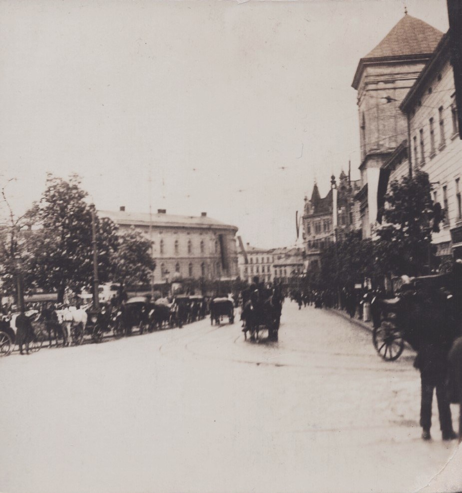 Orszak królewski dążący powozami przez plac Bernardyński na dekorację Króla Kurkowego. [Strzelanie Królewskie, Lwów, okres międzywojenny]
