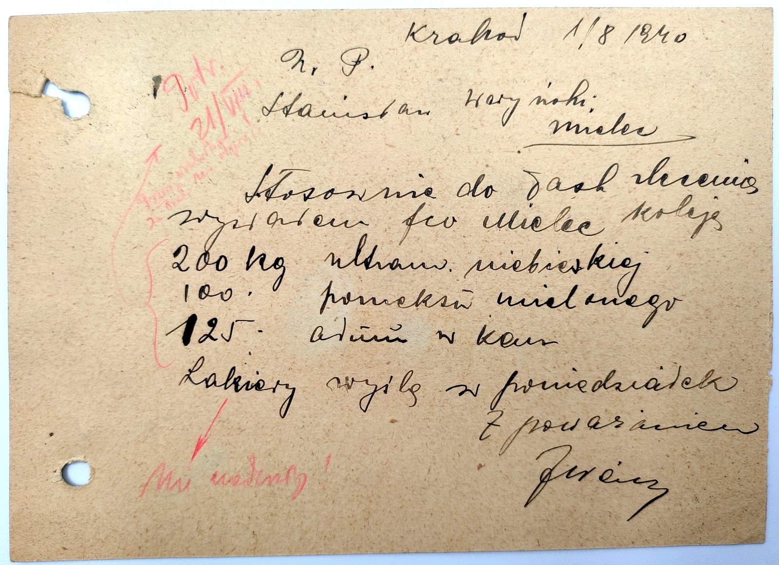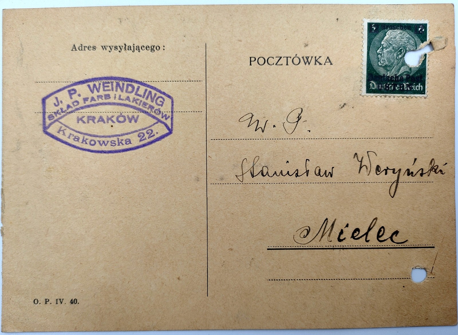 Karta pocztowa - stempel J.P.Weindling - skład farb i lakierów Kraków - adresat Weryński , Mielec