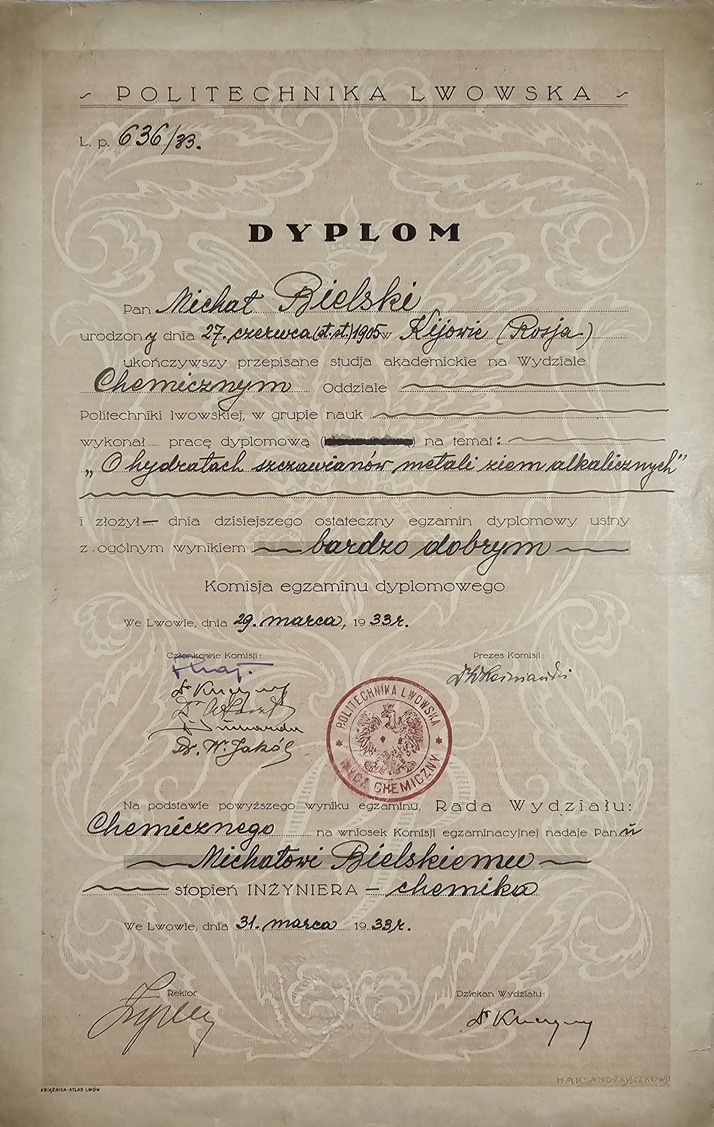 Dyplom na stopień inżyniera-chemika dla: Michał Bielski z Kijowa. Lwów, dn. 31 marca 1933 r. Bifolium, druk wypełniony o wym.: 35 x 22 cm, pieczęć, podpisy. Ślad złożenia, stan dobry.