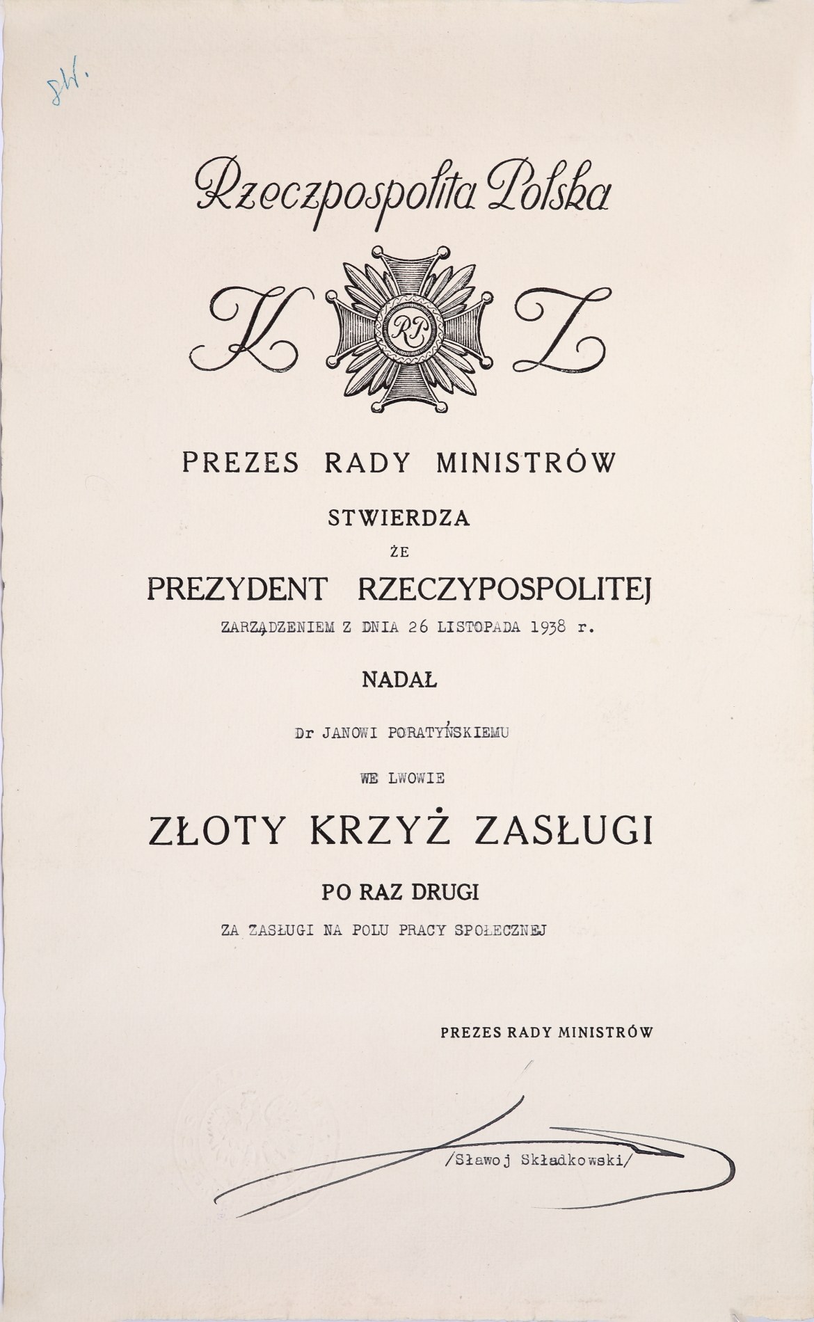 [PORATYŃSKI Jan] Dyplom nadania po raz drugi Złotego Krzyża Zasługi dla Dra Jana Poratyńskiego […] za zasługi na polu pracy społecznej. Dat. 26 listopada 1938 roku.