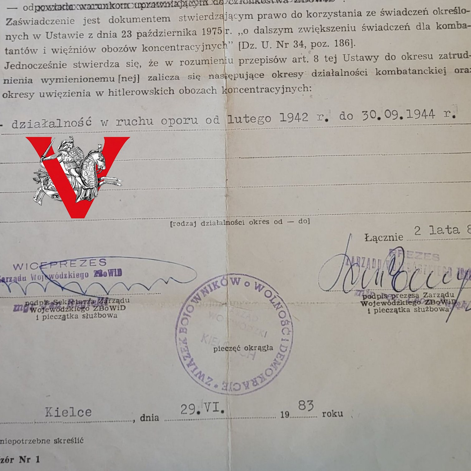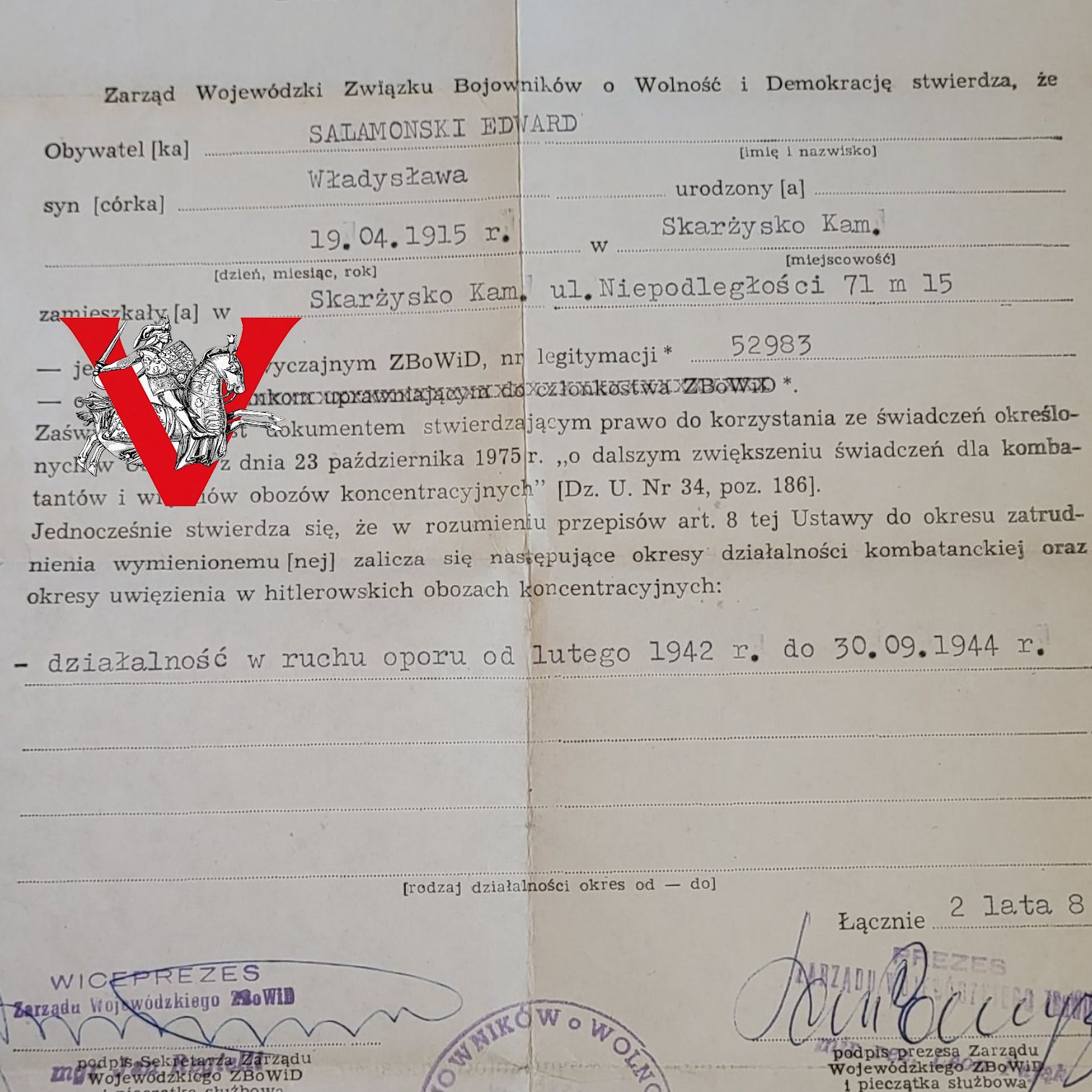 Oryginalne zaświadczenie wydane przez Zarząd Wojewódzki Związku Bojowników o Wolność i Demokrację (ZBoWiD) w Kielcach w 1983 roku. Dokument potwierdza działalność konspiracyjną Edwarda Sałamońskiego, ur. 1915 r. w Skarżysku-Kamiennej, który brał udział w ruchu oporu w latach 1942–1944.