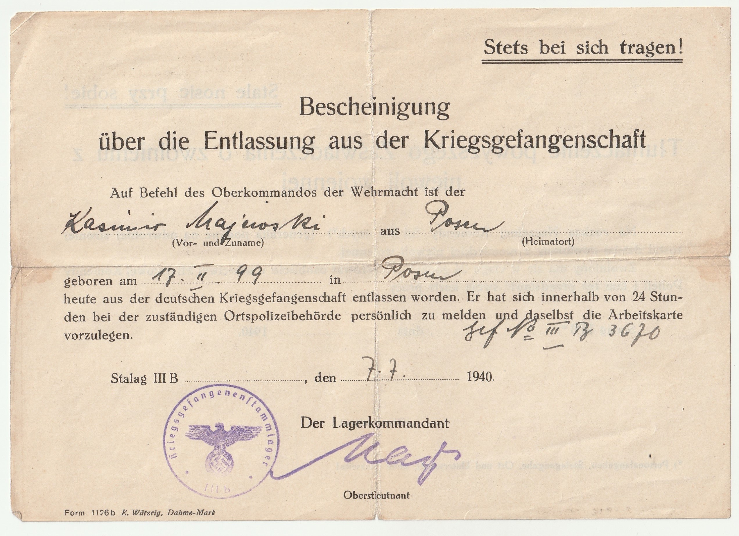 POZNAŃ. Dokument zwalniający z niewoli w Stalagu III B Kazimierza Majewskiego z Poznania, 7.07.1940; podpis komendanta obozu i stempel, druk dwustronny w jęz. niem. i pol.; ślady złożeń i rozdarcia w miejscach złożeń, drobne zagięcia narożników, wym. ok. 210x148 mm.