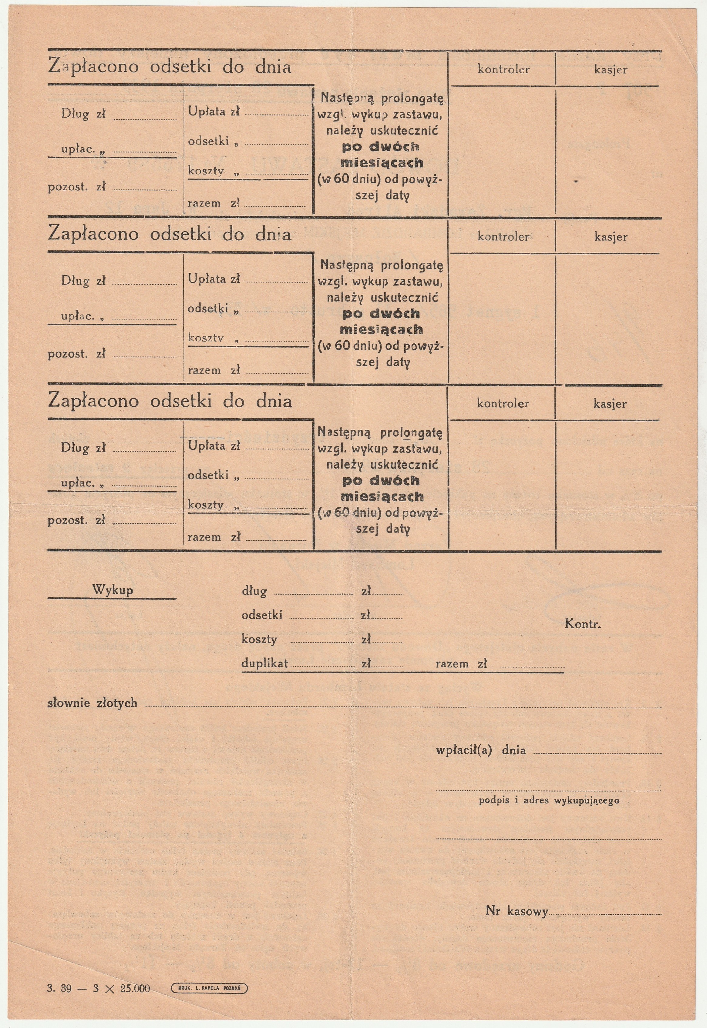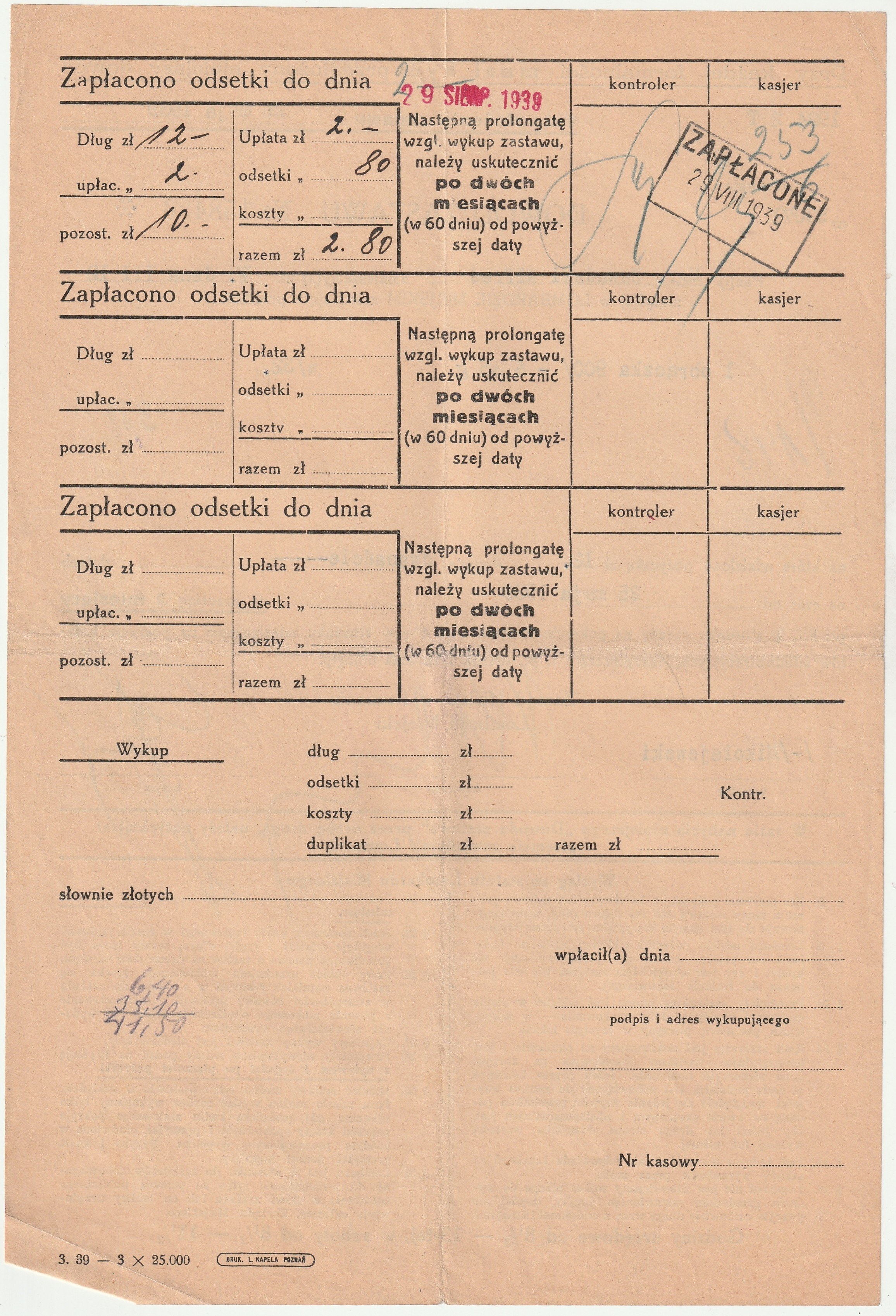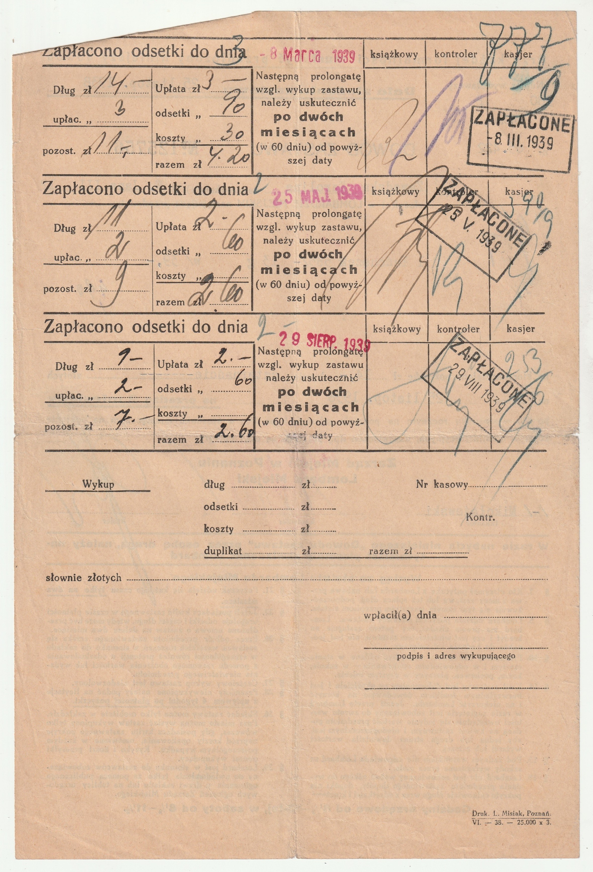 Pokwitowania na zastawy: 1) 25.11.1938: łańcuszek, pożyczka 14 zł; 2) 08.03.1939 broszka i naszyjnik, 17 zł; 3) 25.05.1939 obrączka 12 zł; 4) 26.08.1939 pierścień z brylantem, 30 zł; 5) 28.08.1939 sygnet, 30 zł; 6) 29.08.1939 łańcuszek, 8 zł; 7) 31.08.1939 sygnet, 20 zł.