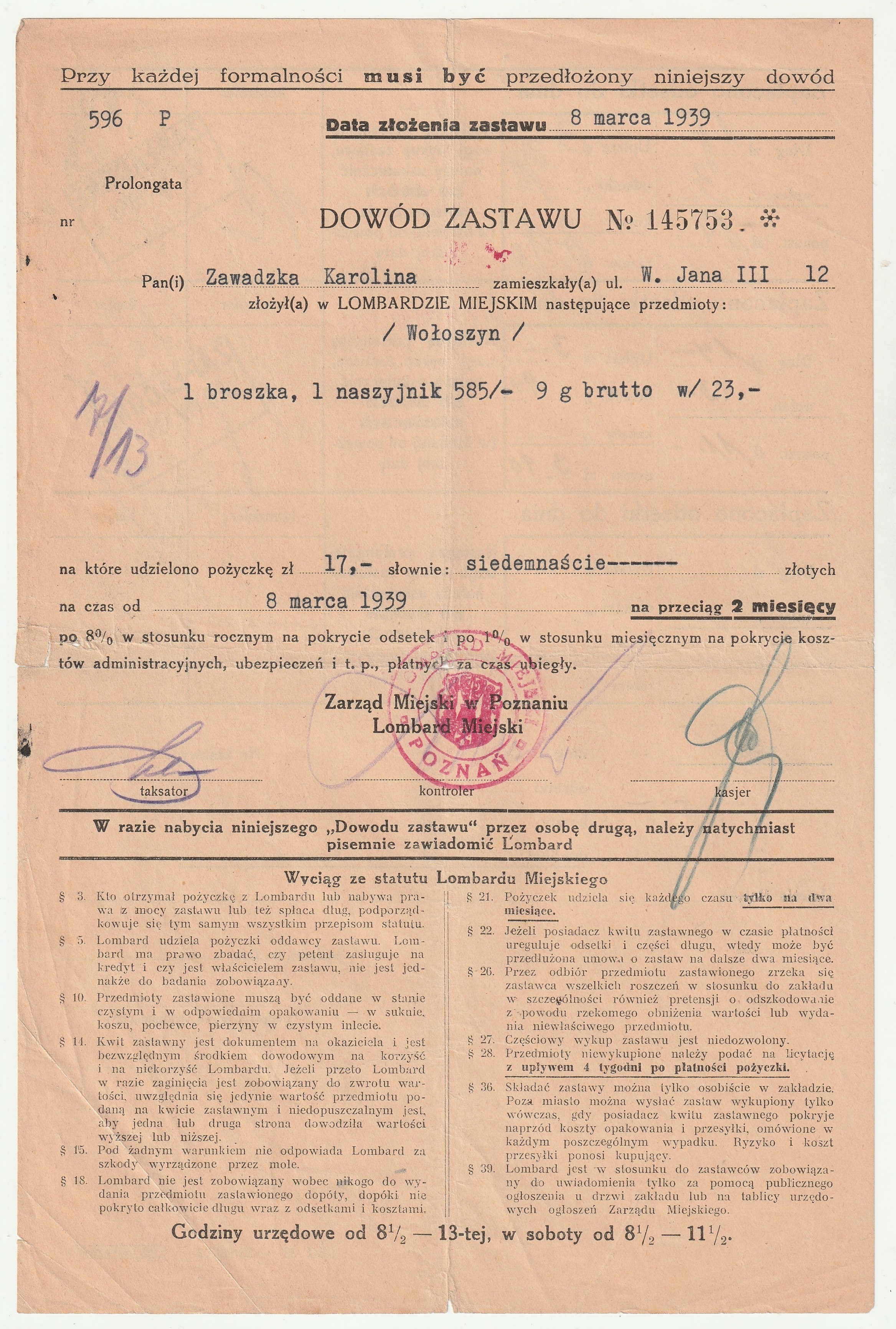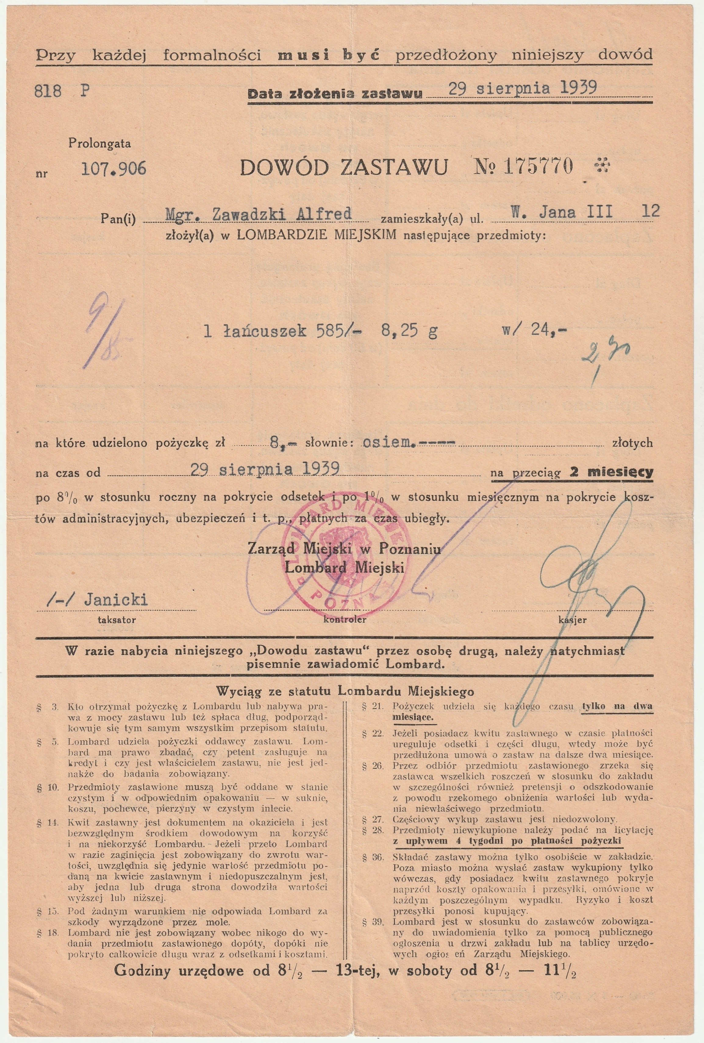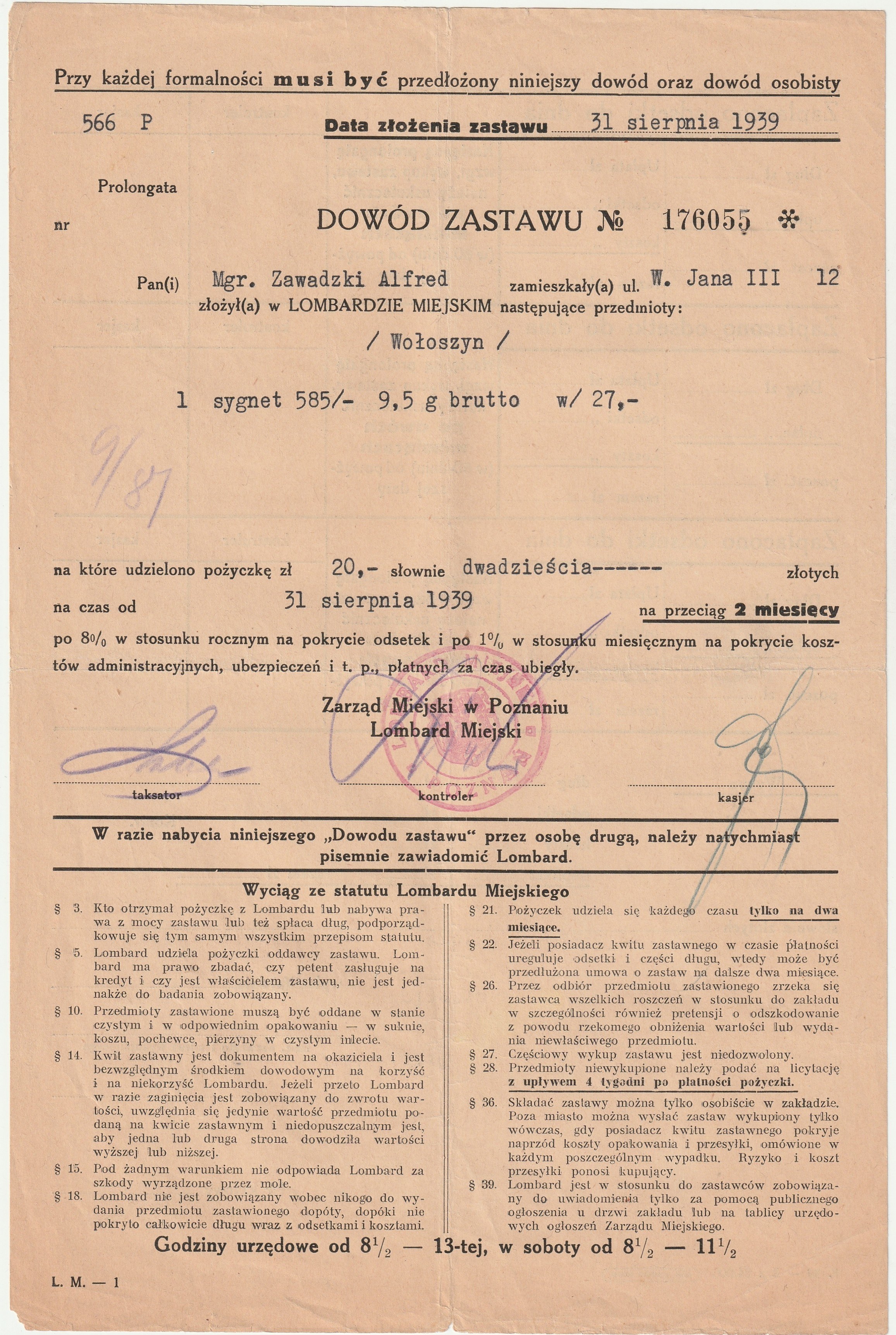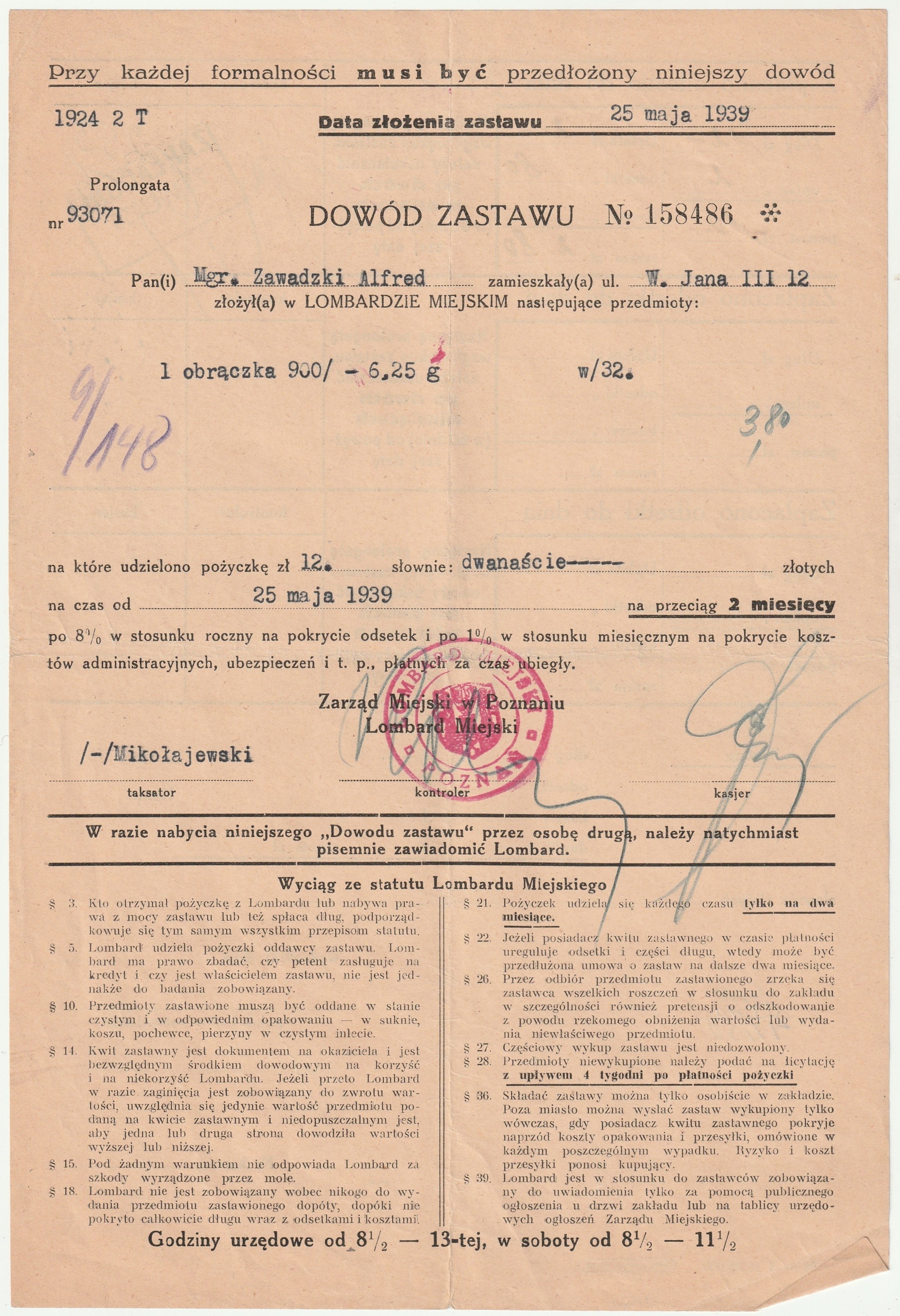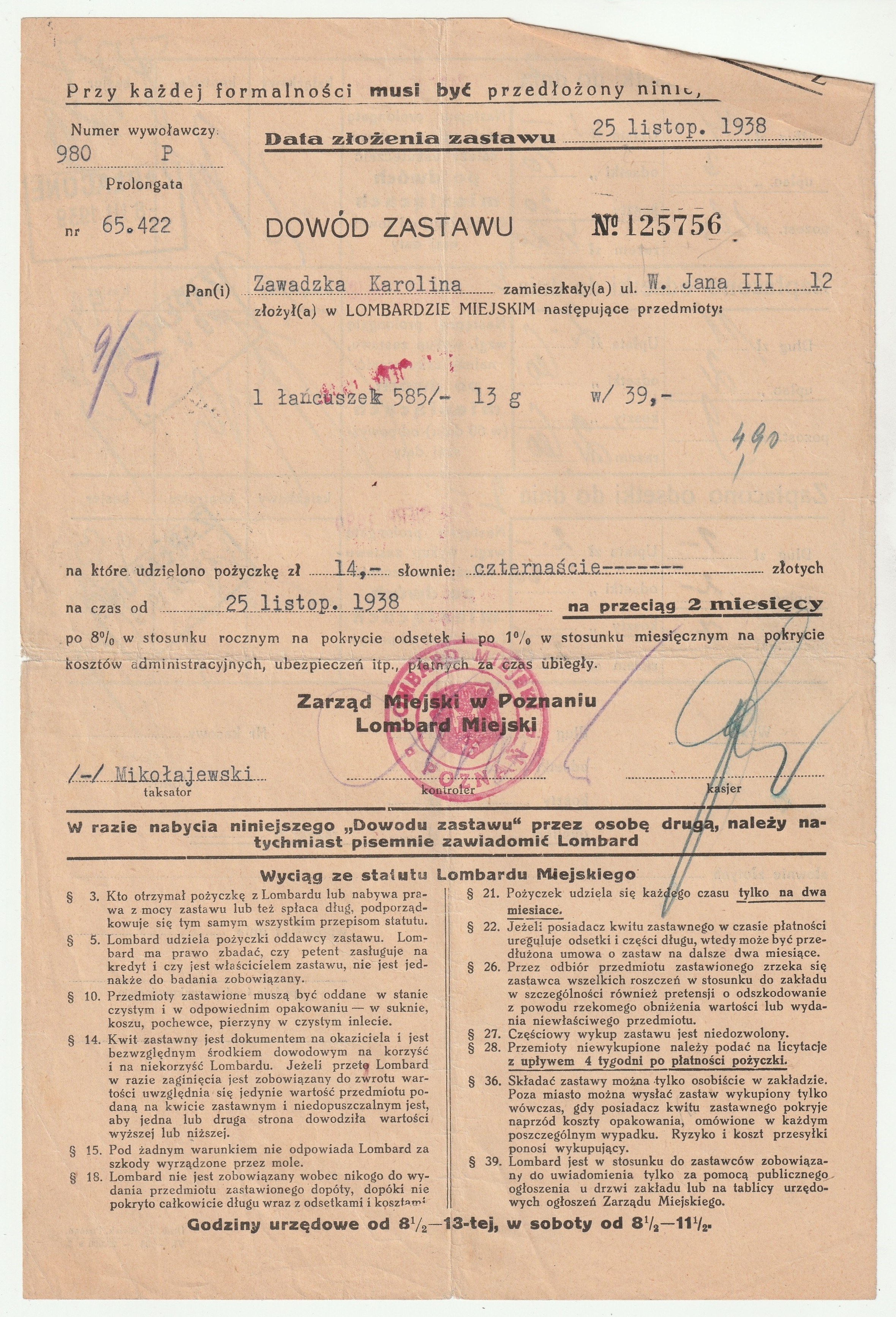 POZNAŃ. Dowody zastawów Karoliny i Alfreda Zawadzkich w Lombardzie Miejskim z lat 1938–1939; druki dwustronne, stemple lombardu, podpisy kontrolera i kasjera, ślady złożeń, rozdarcia, zagięcia narożników, wym. ok. 190x285 mm.