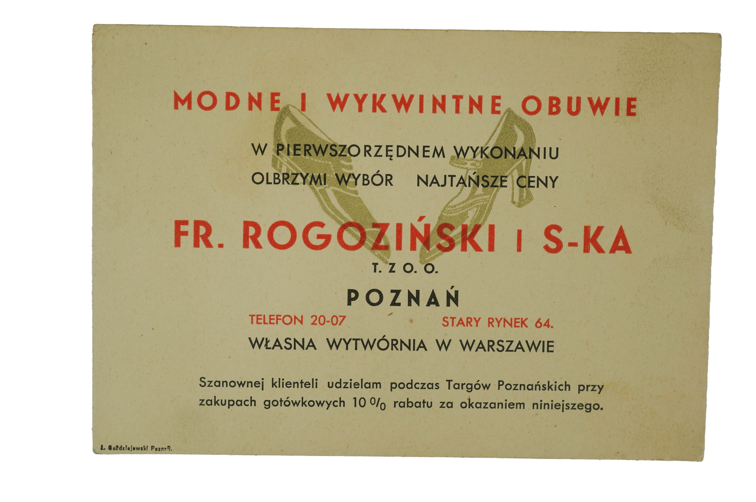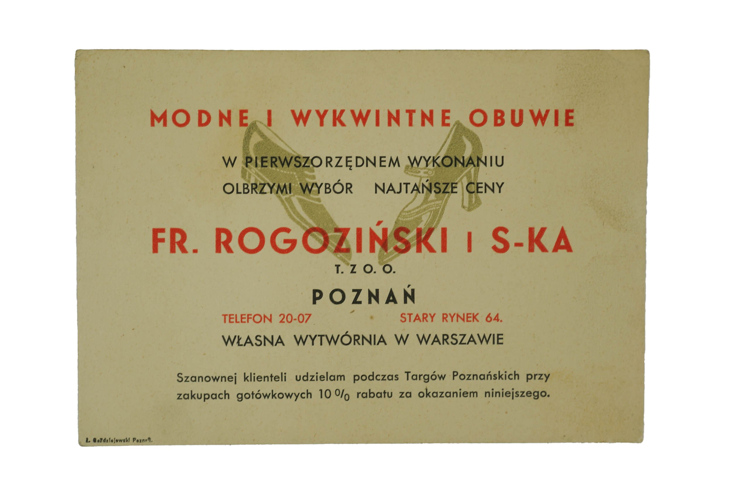 Modne i wykwintne obuwie w pierwszorzędnym wykonaniu , olbrzymi wybór, najtańsze ceny Fr. Rogoziński S-ka T. Z O.O. Poznań Stary Rynek 64, f. 14,5x10,2cm