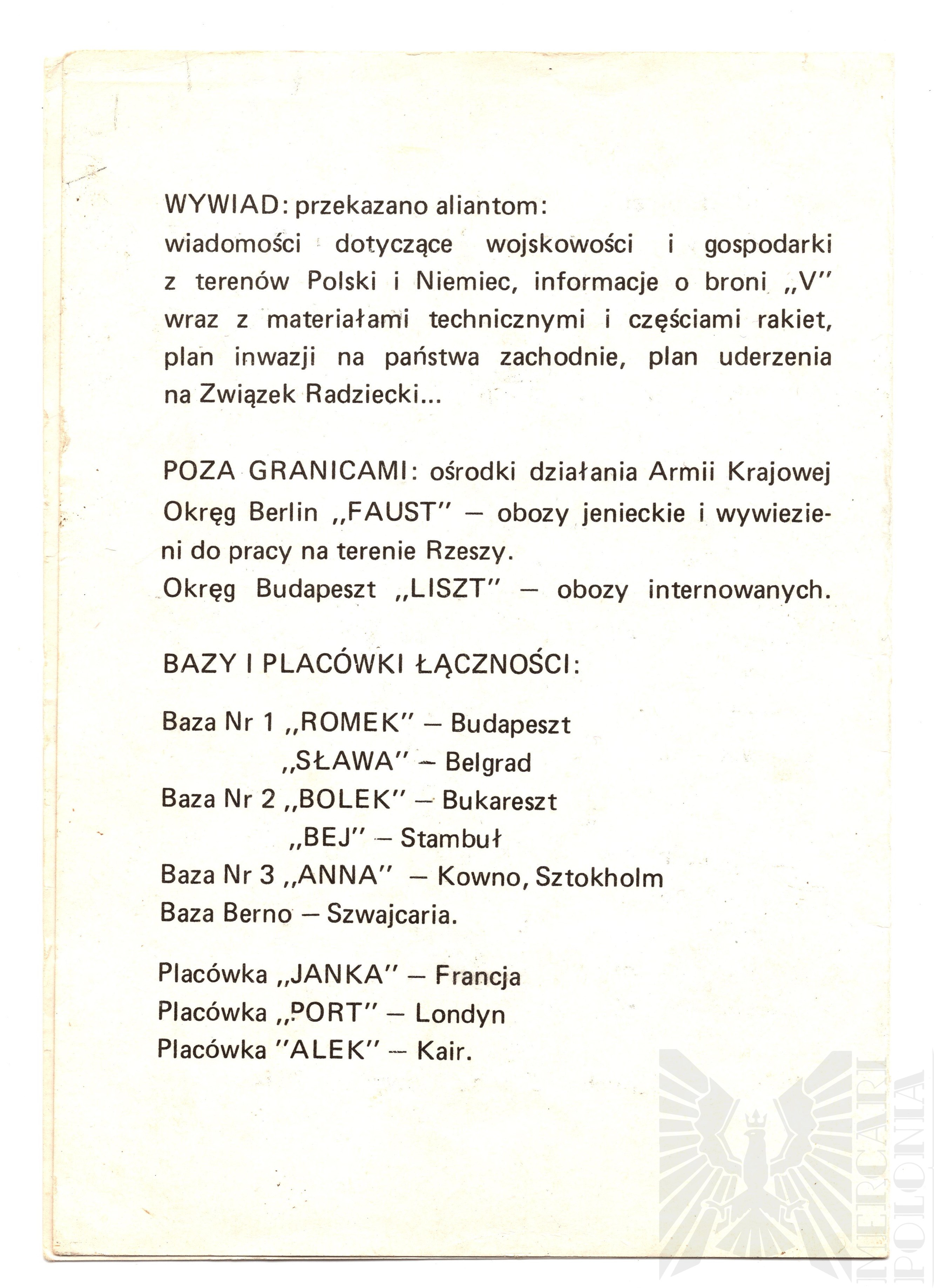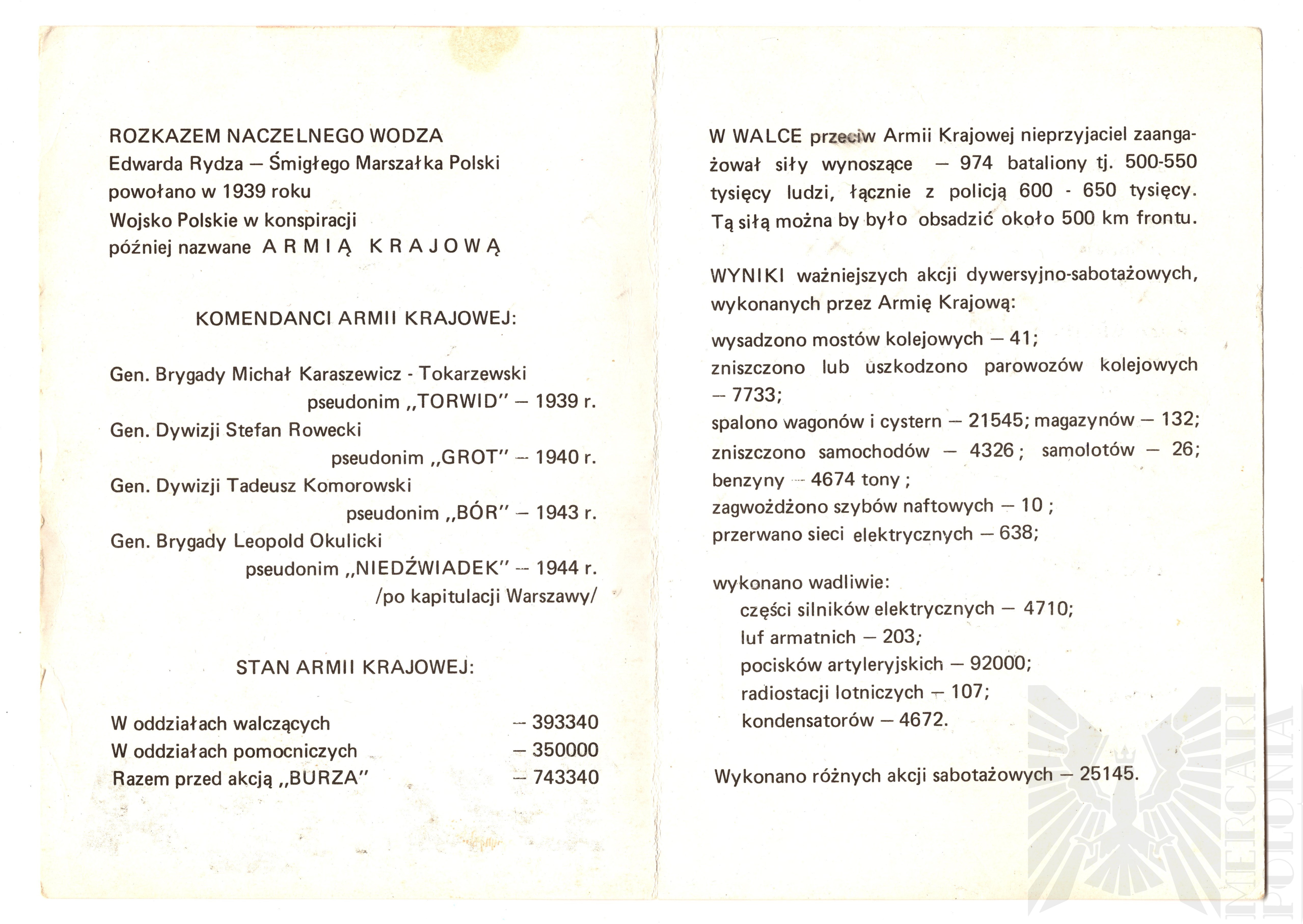 Broszura przedstawia powstanie i działalność Armii Krajowej, utworzonej w 1939 roku na rozkaz Naczelnego Wodza Edwarda Rydza-Śmigłego. Wymienia kolejnych komendantów AK (Tokarzewski, Rowecki, Komorowski, Okulicki) oraz podaje liczebność – ponad 740 tys. ludzi przed akcją „Burza”. Przedstawia skalę walki z okupantem, główne wyniki akcji dywersyjnych i sabotażowych, a także szeroką działalność wywiadowczą przekazywaną aliantom, w tym informacje o broni V. Wspomina również o zagranicznych ośrodkach AK i bazach łączności działających w Europie.