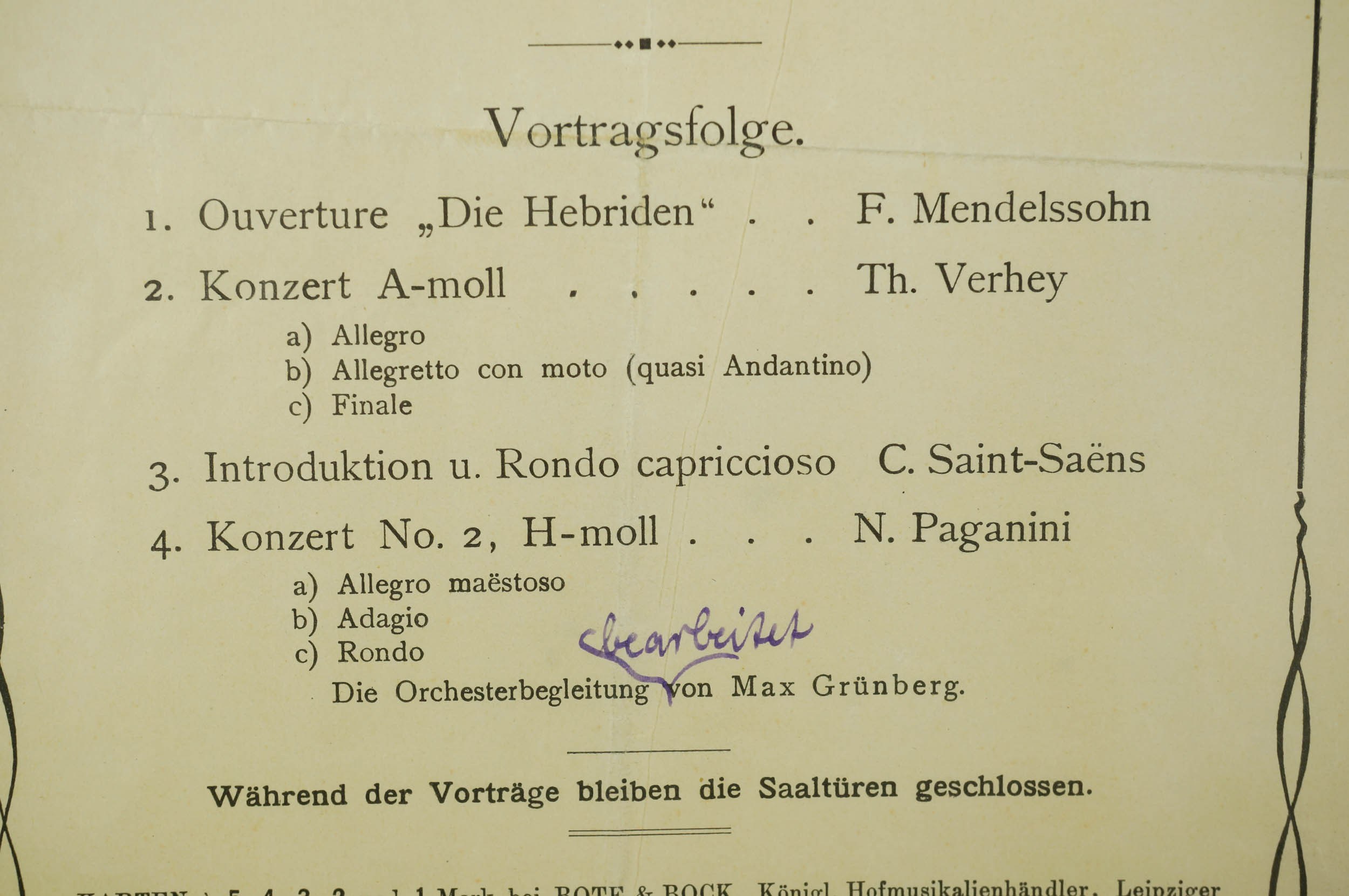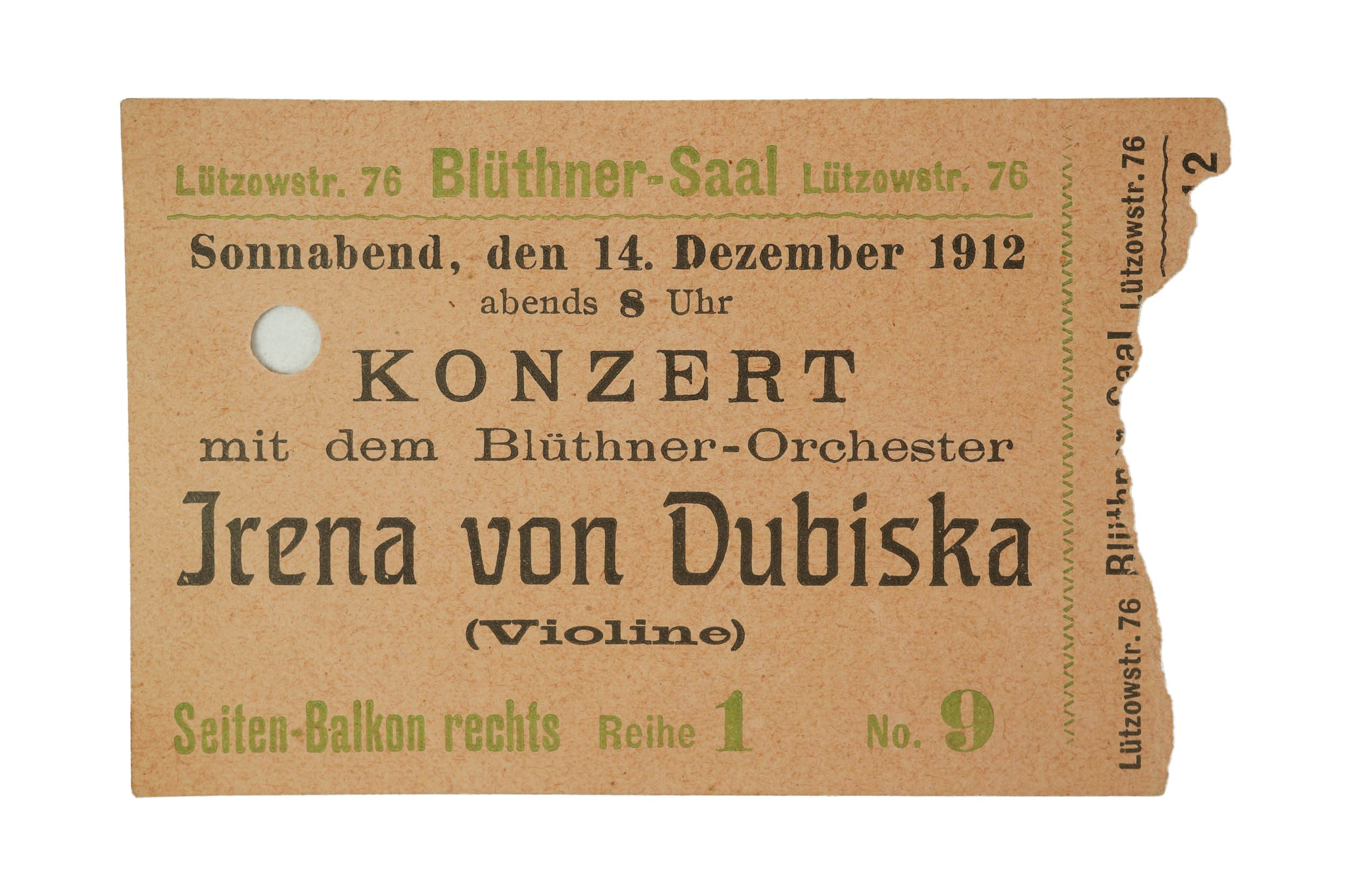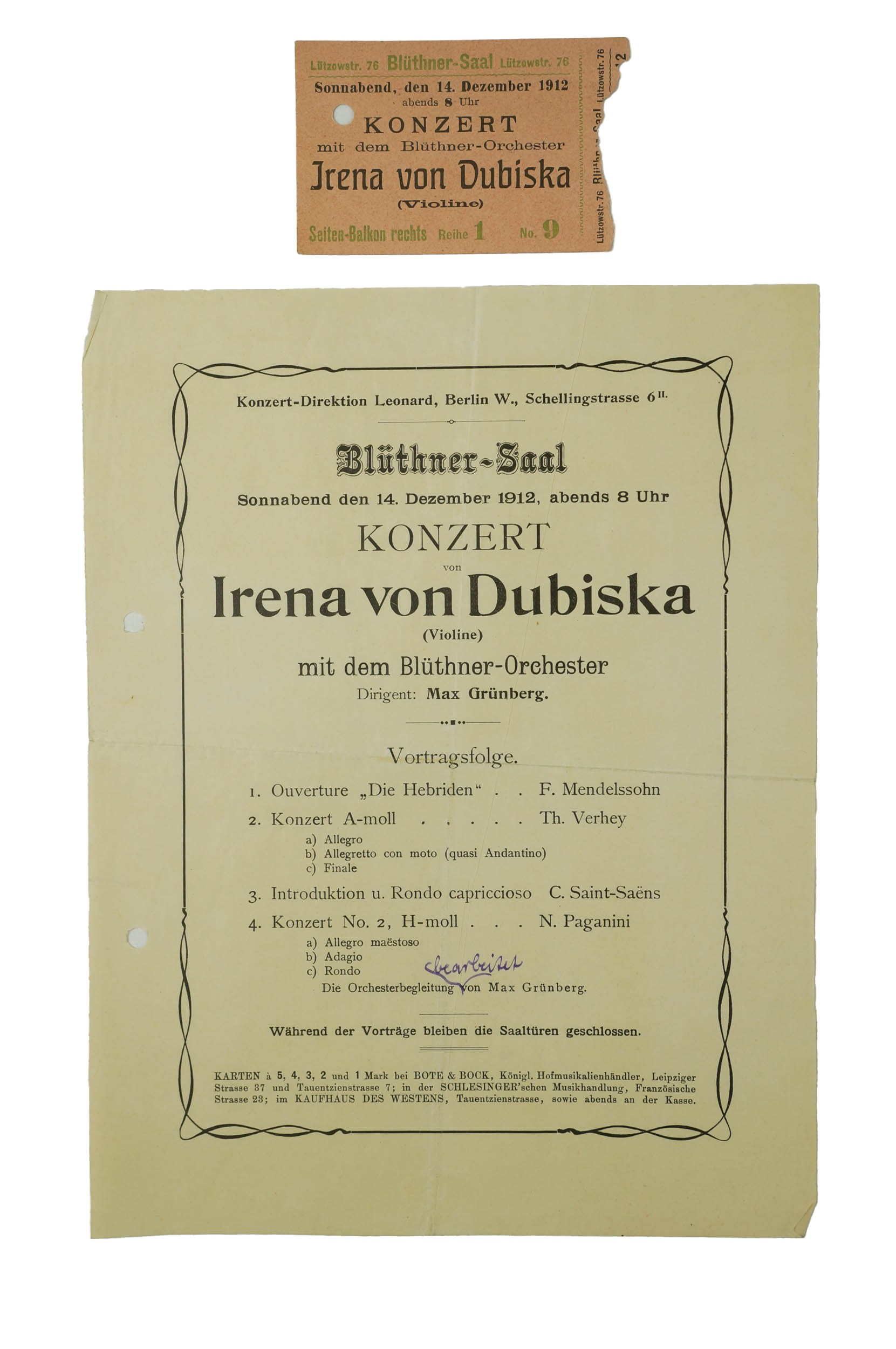 Oryginalny program koncertu oraz bilet wstępu na koncert niespełna 13-letniej wówczas polskiej, wybitnej skrzypaczki: Irena Dubiska [1899-1989], która ukończyła w roku koncertu Konserwatorium Muzyczne im. Juliusza Sterna uzyskując dyplom ze złotym medalem. Skrzypaczce towarzyszyła orkiestra pod batutą Maxa Grünberga, koncert odbył się 14.12.1912r., w programie były utwory Mendelhsonna, Herhey'a, Saint-Saens'a i Nicolo Paganiniego. Program w języku niemieckim, f. 19x25cm [program], 8x5,5cm [bilet], BARDZO RZADKIE