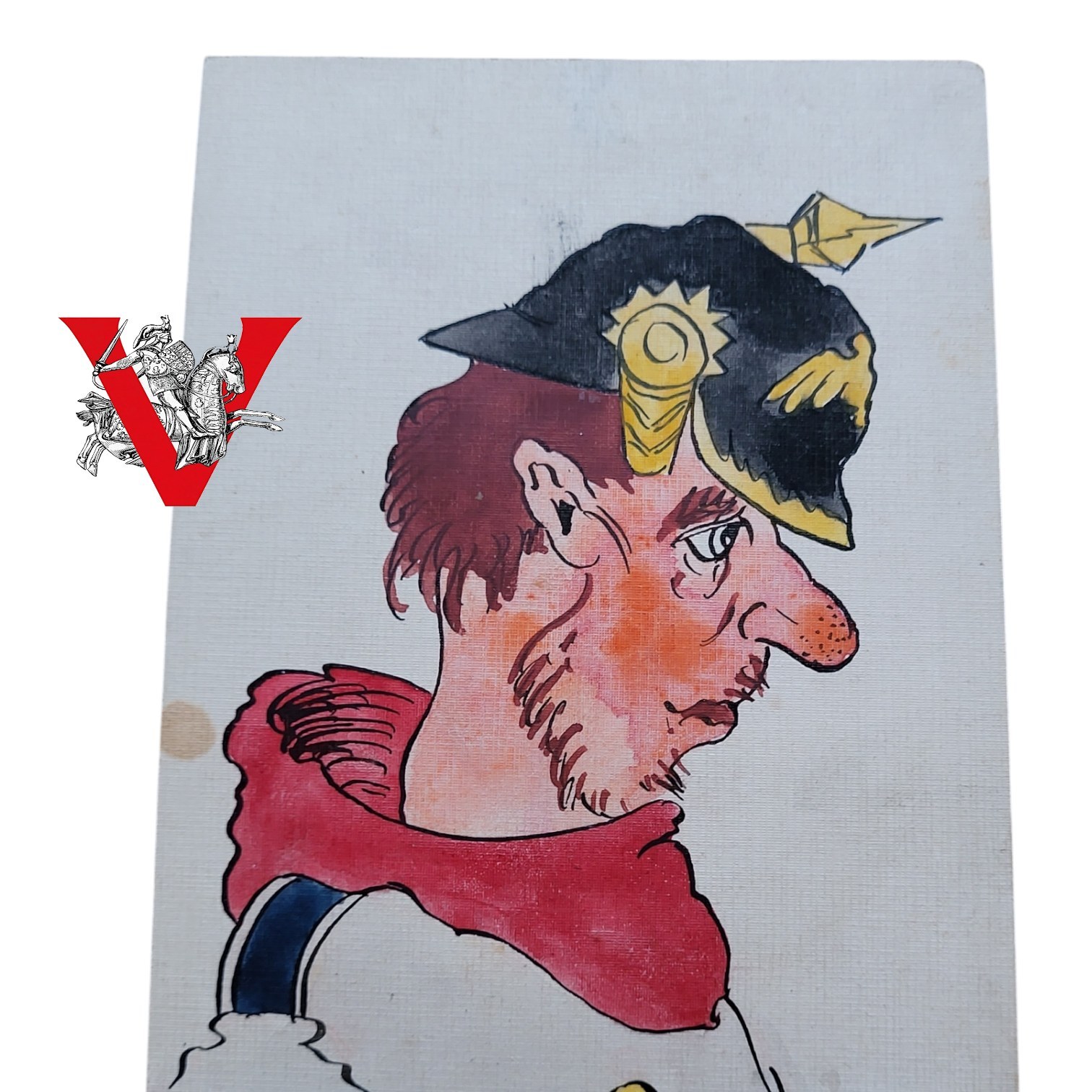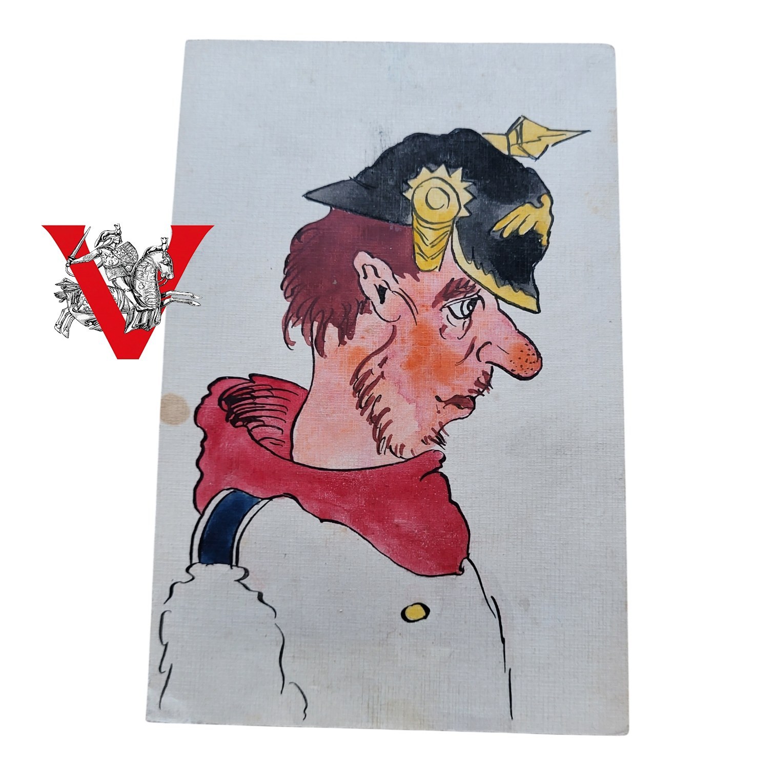 Oryginalna ręcznie malowana karta przedstawiająca pruskiego żołnierza w pickelhaubie – charakterystycznym hełmie z kolcem. Praca utrzymana w formie karykatury satyrycznej, ukazującej żołnierza w sposób humorystyczny, z typową dla epoki ironią wobec pruskiego militaryzmu.