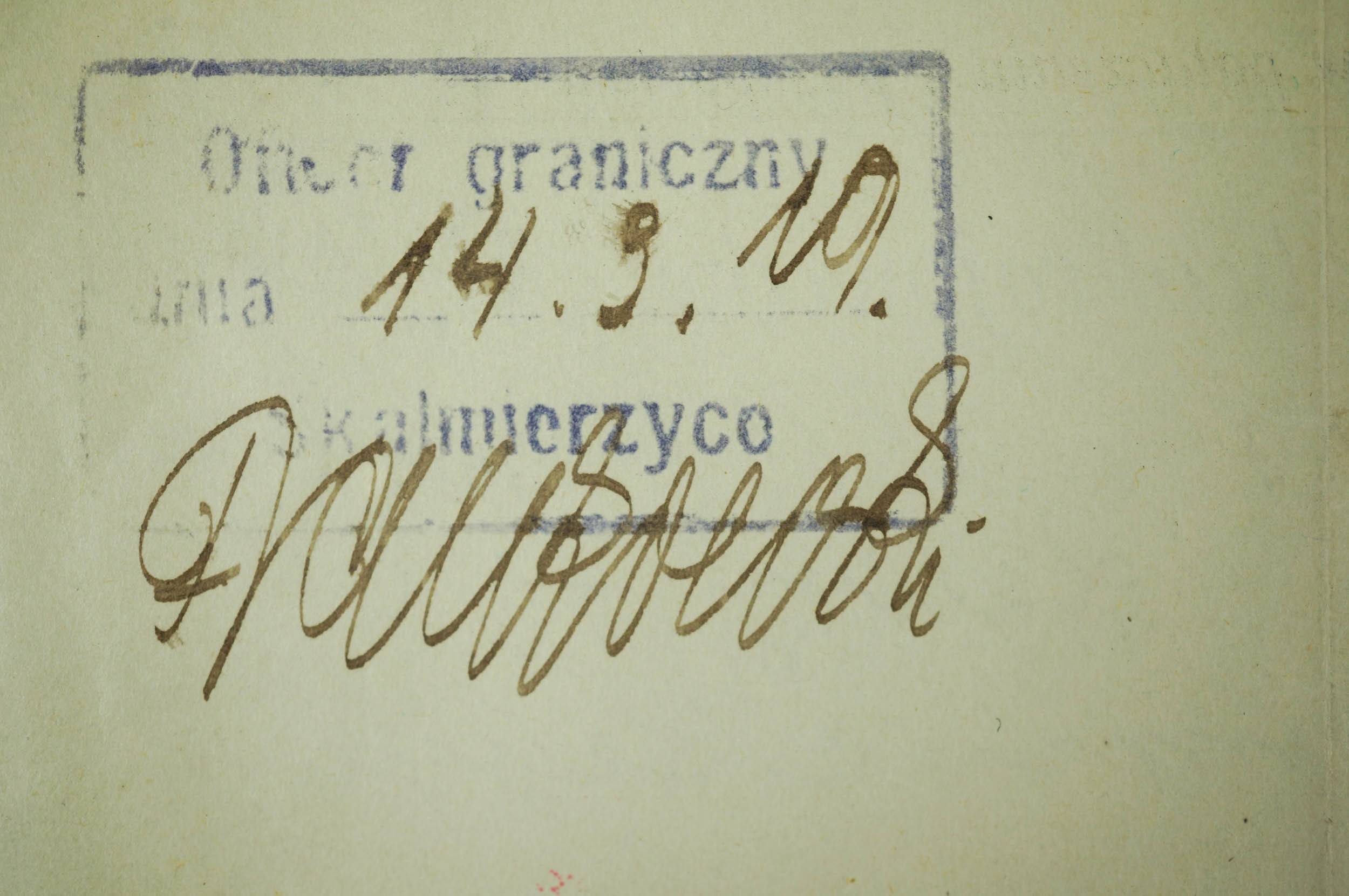 PRZEPUSTKA dla obcokrajowców nr 49603, ważna od dna 14.3 do dnia 15.3.1919r. na przejazd z Ostrowa do Kalisza dla Zdzisława Manna z Kalisza. Ważna w połączeniu z paszportem nr 5. Stempel: "Starostwo Powiatu Ostrowskiego, Ostrów 14.3.1919r." oraz "1 baon 12 pułku strzelców Wielkopolskich", Dowództwo VII okręgu wojskowego, na odwrocie stempel: "oficer graniczny dnia 14.3.1919 Skalmierzyce", f. 17 x 10
