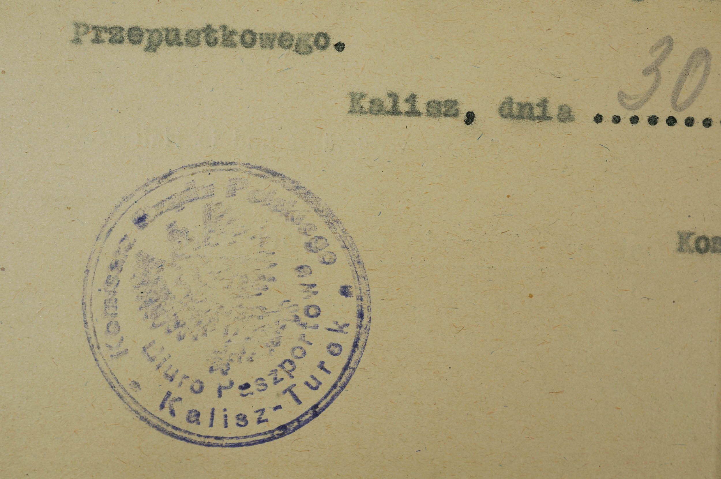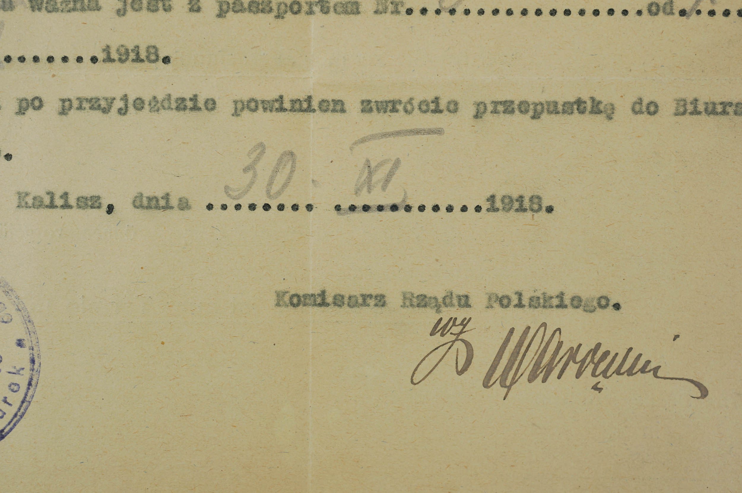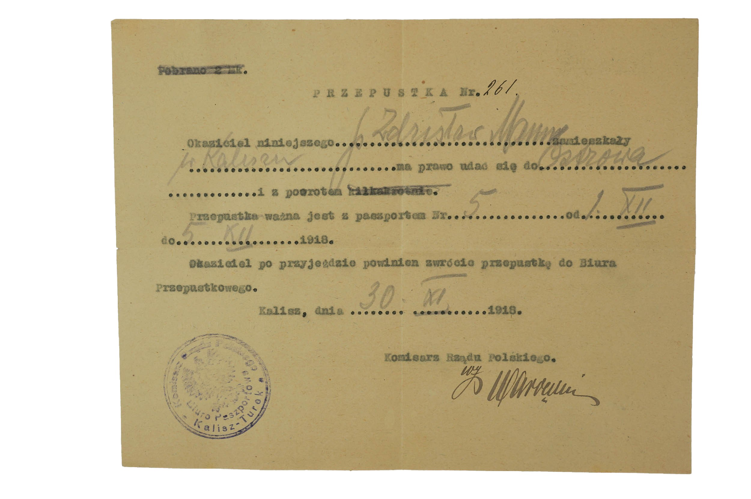 PRZEPUSTKA na przejazd do Ostrowa i z powrotem ważna do 2.XII do 5.XII.1918r. stempel Komisarz Rządu Polskiego Biuro Paszportowe Kalisz - Turek, maszynopis w języku polskim, uzupełniany odręcznie [ołówek], f. 21 x 16,5cm