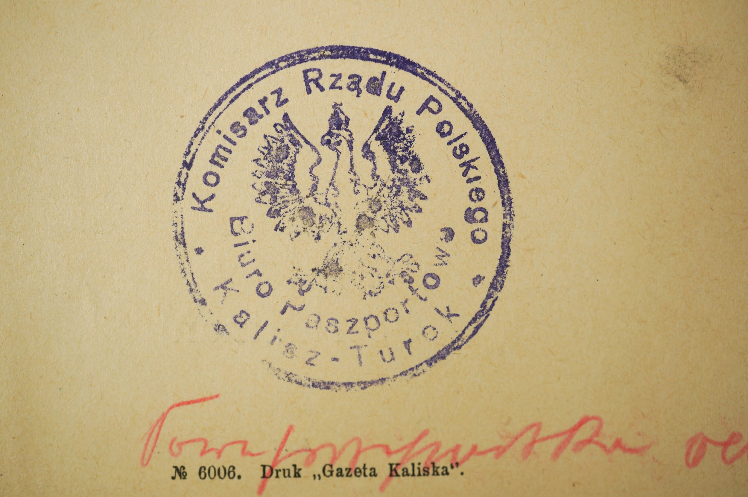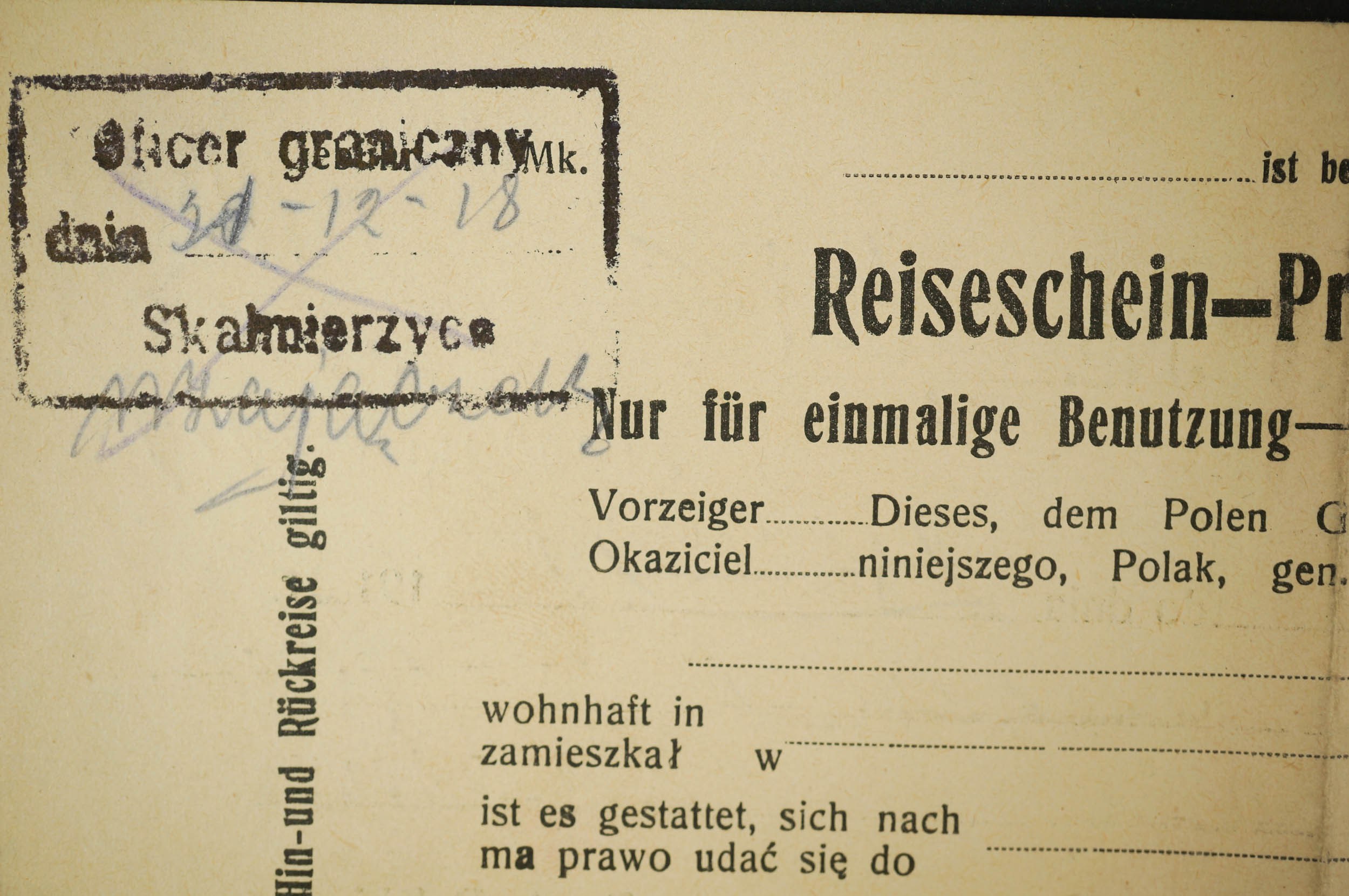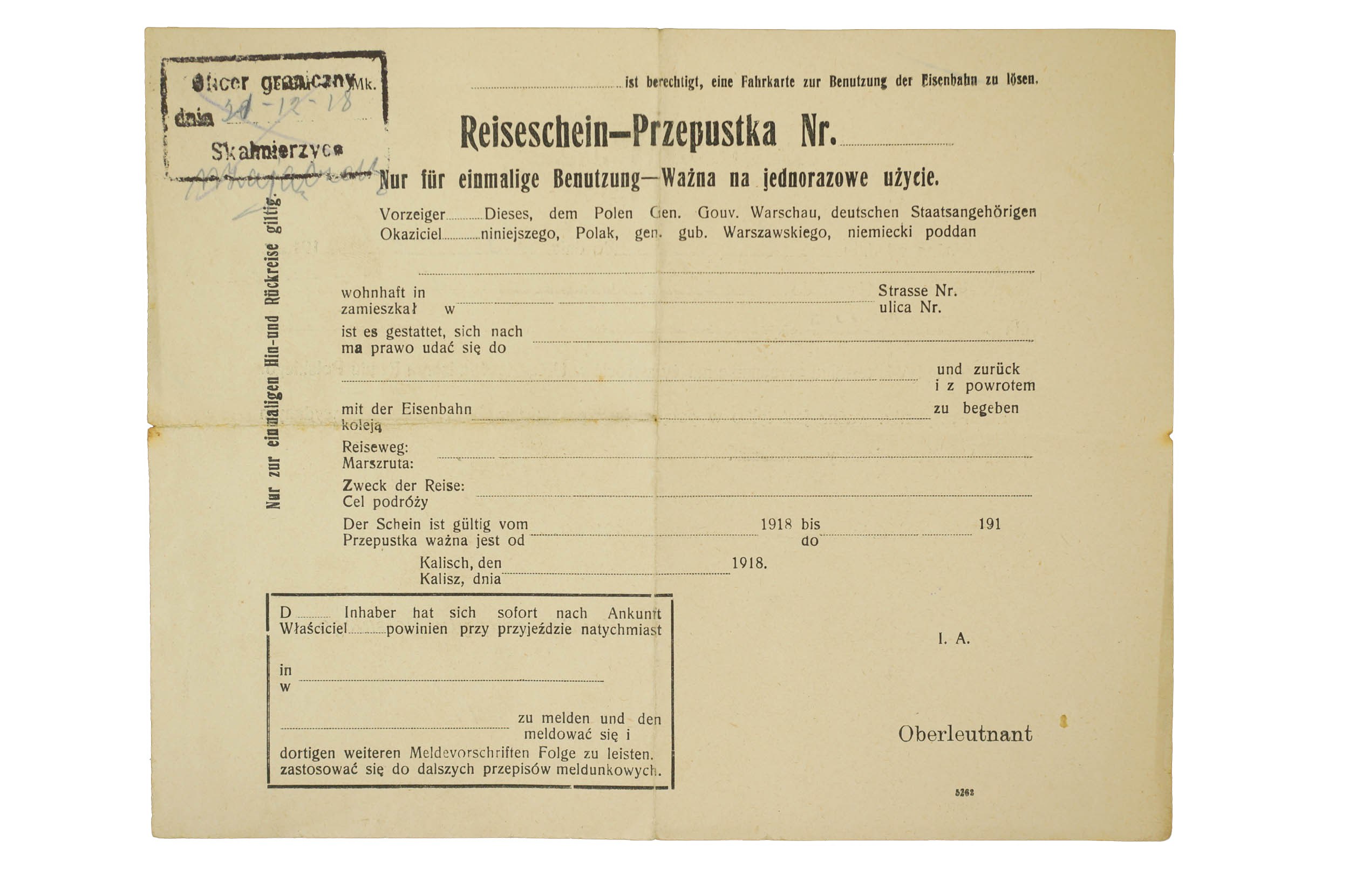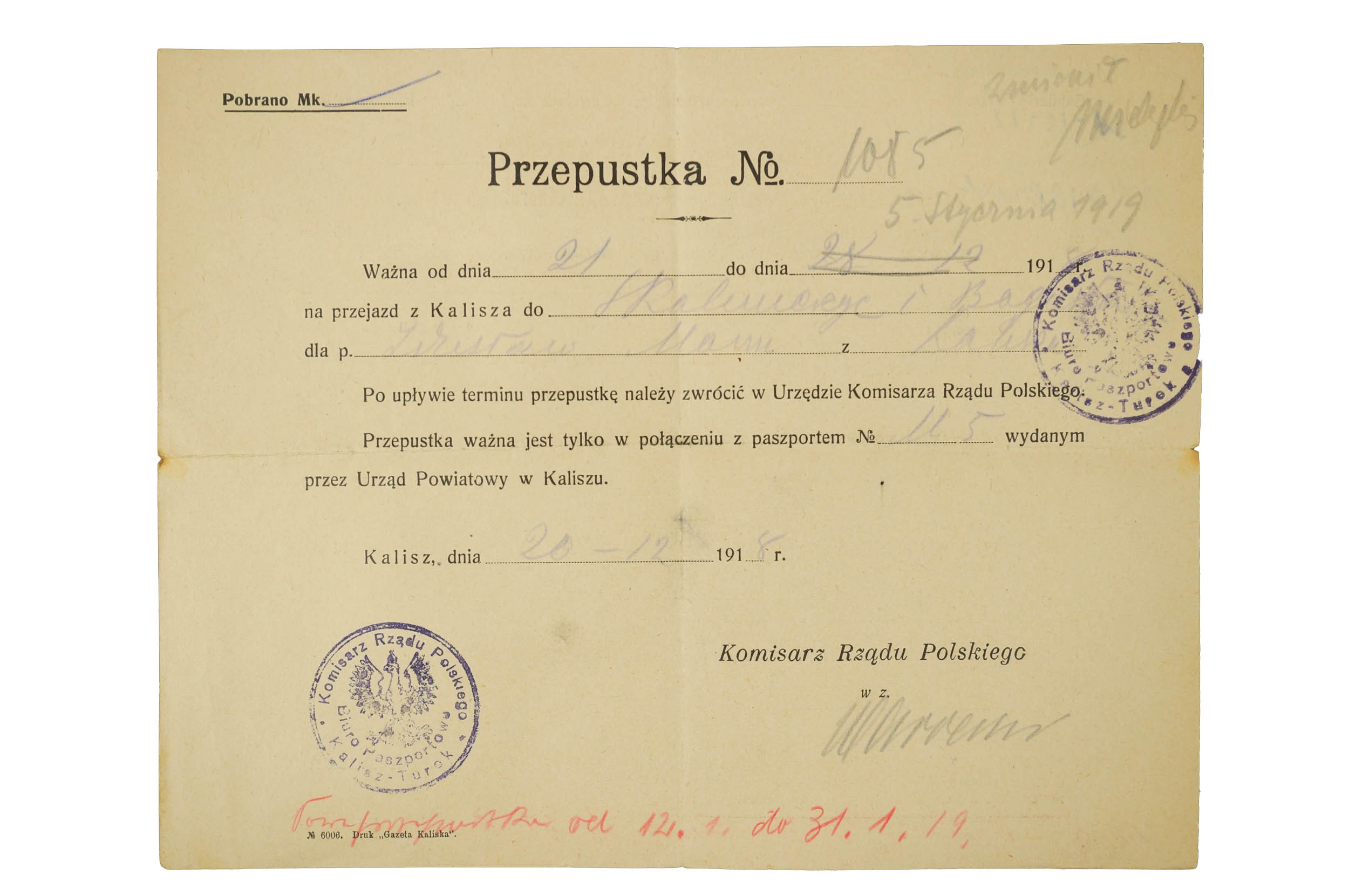 PRZEPUSTKA nr 1085 na przejazd z Kalisza do Skalmierzyc, Komisarz Rządu Polskiego 5.1.1919r., druk w języku polskim uzupełniany odręcznie, stemple: "Komisarz Rządu Polskiego Biuro Paszportowe Kalisz - Turek, przepustka ważna w terminie 21.12.1918 - 5.1.1919r. z dopiskiem "nowa przepustka od 12.1 do 31.1.1919r.". Na odwrocie druk niemiecko-polski [czysty] ze stemplem "oficer graniczny dn. 31.12.1918r.", f. 23,5 x 19cm