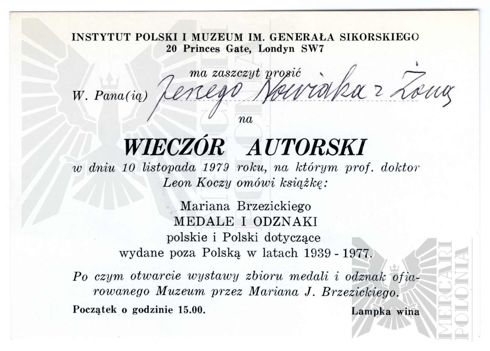 Zaproszenie na Wieczór Autorski Książki Mariana Brzezickiego (Medale i Odznaki) Instytut Polski i Muzeum im. Generała Sikorskiego. Zaproszenie dla Pana Jerzego Nowaka z Żoną.