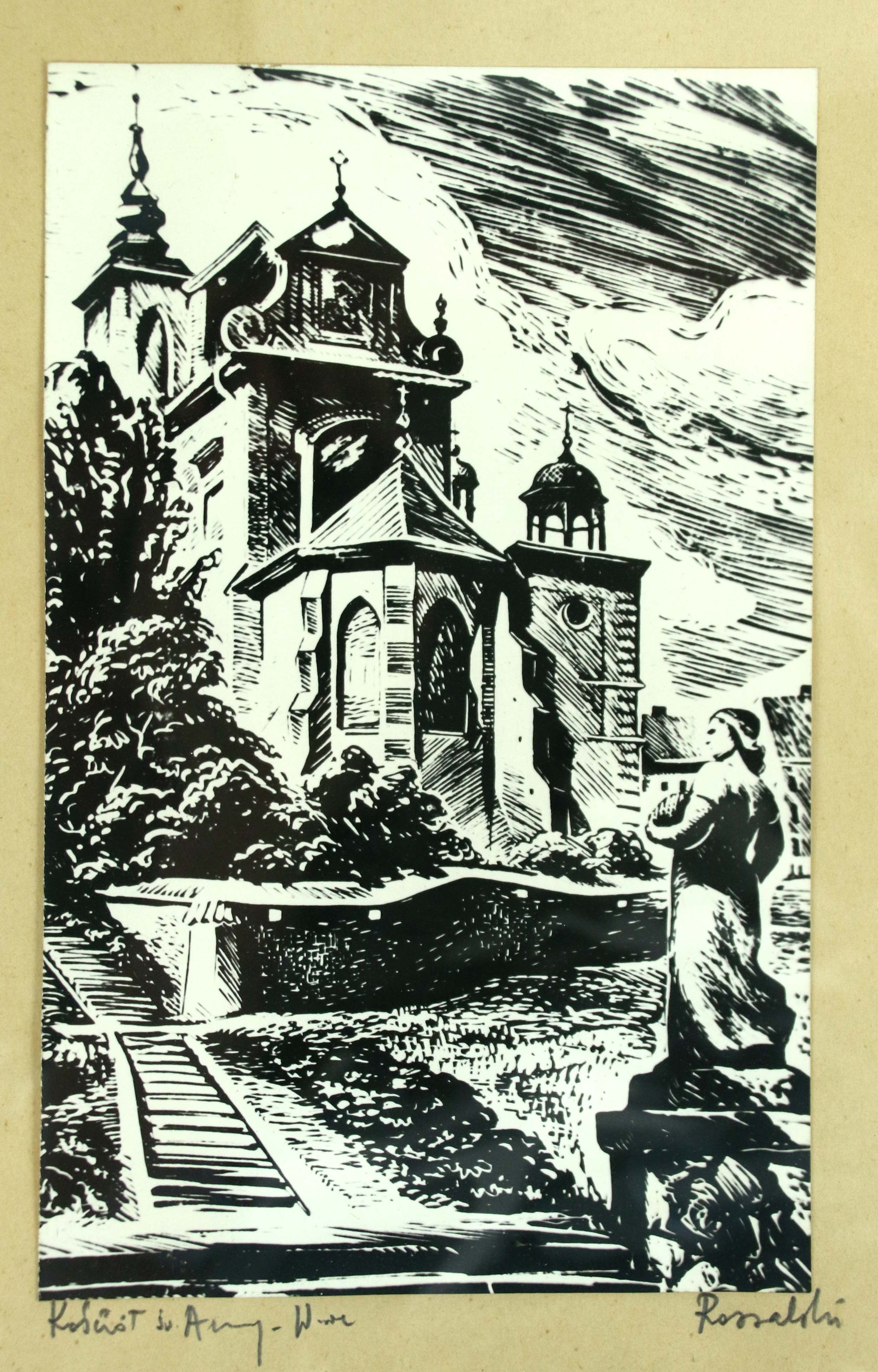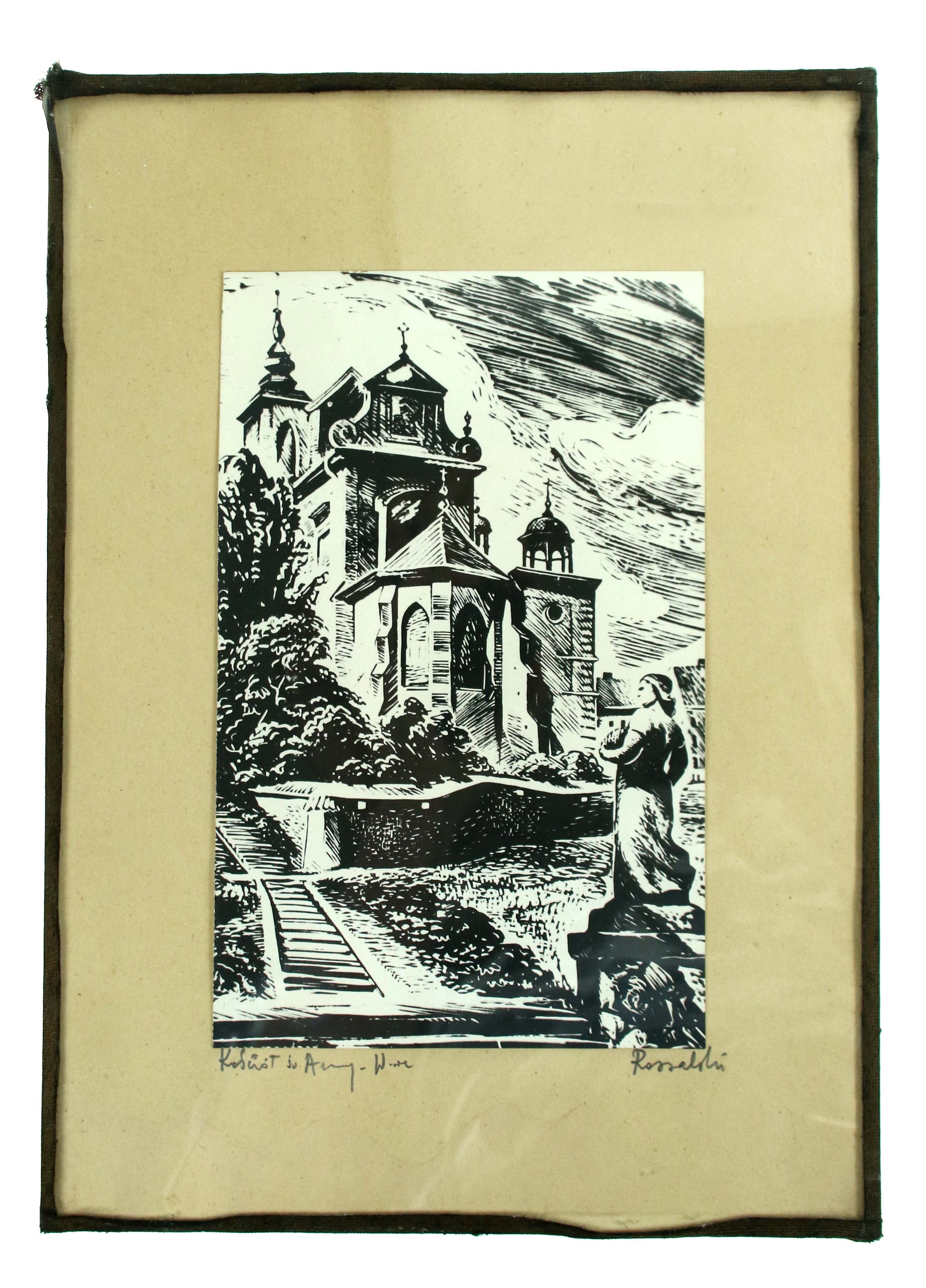Rogalski ? - Kościół św. Anny w Warszawie. Drzeworyt. Wym 24 x 15 cm, rama 35 x 25 cm. Szkło