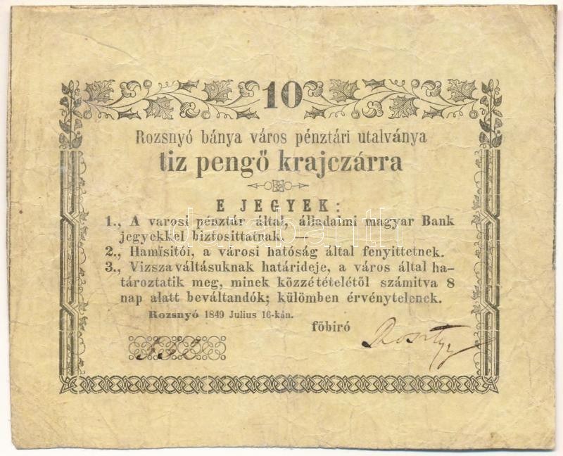 Rozsnyó 1849. július 16.10kr "Rozsnyó bánya város pénztári utalványa", "VIZSZA" sajtóhiba, "552" sorszámmal T:F ...