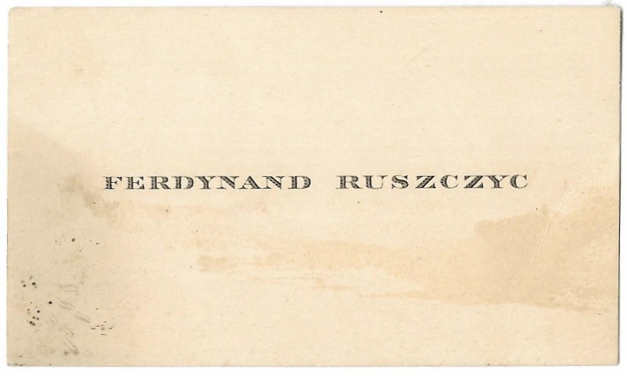 Bilet wizytowy form. 5,6x9,5 cm. Na odwrocie ołówkowy napis identyfikujący: "(1870-1936) malarz, scenograf, 1904 prof. Szk. Sztuk Pięk. w W-wie, 1907 Akademii Sztuk Pięknych w Krakowie, 1919 Uniw. Stef. Batorego w Wilnie, malował gł. krajobrazy wileńszczyzny (568) 798. Organizator życia artyst. na wieleńszczyźnie (gł. w Wilnie)". Miejscowe zaplamienia na licu, poza tym stan dobry.