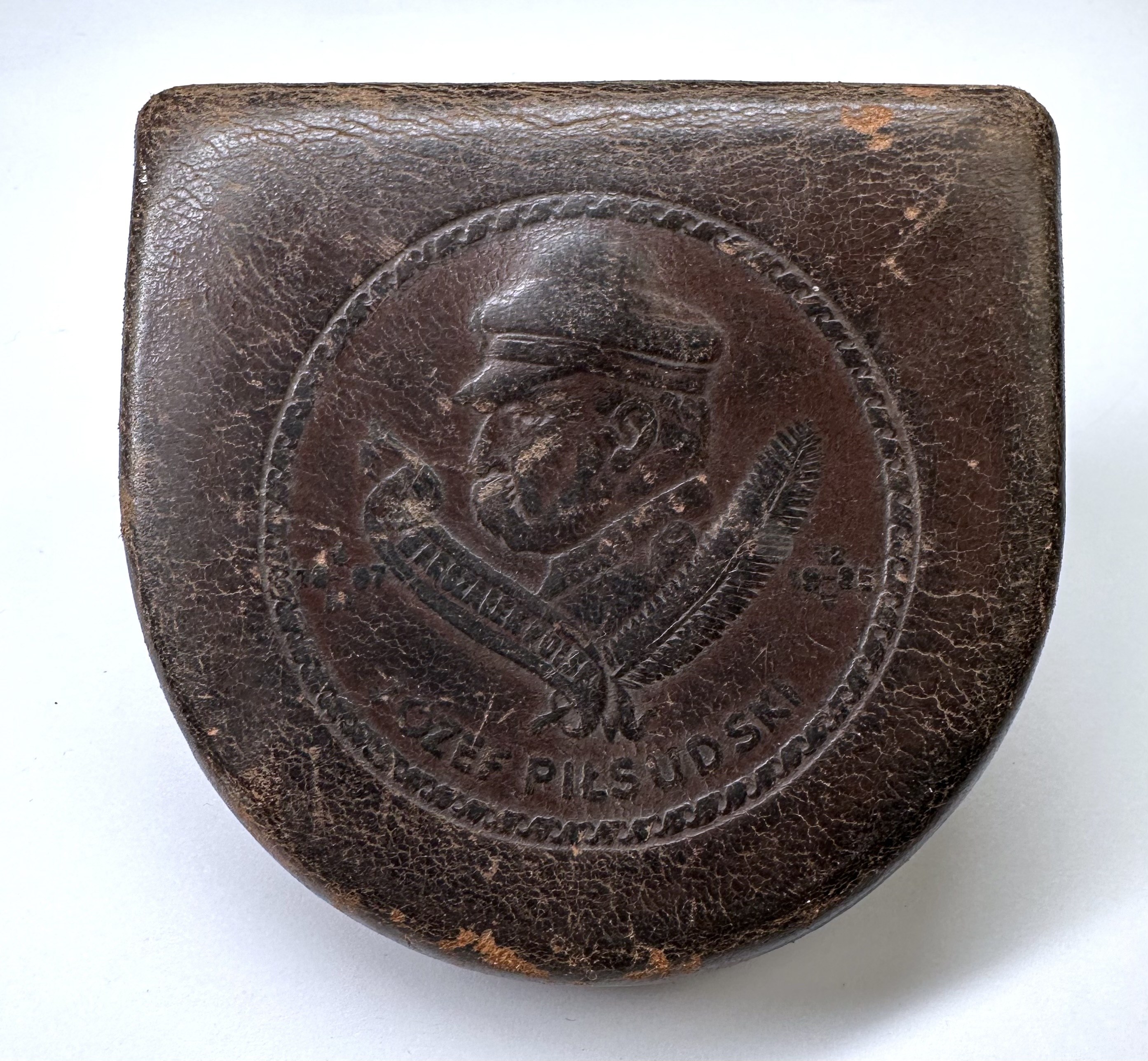 Wykonany w latach 30. skórzany portfelik na bilon, wymiary 8x8,5 cm, po rozłożeniu 16x,8,5 cm. Na licu wytłoczona głowa Marszałka Piłsudskiego w maciejówce, pod wizerunkiem element florystyczny oraz szarfa z napisem Marszałek Polski, u dołu w półkolu napis: Józef Piłsudski. Obok kompozycji wytłoczone daty życia Marszałka: 5 XII 1867 – 12 V 1935.