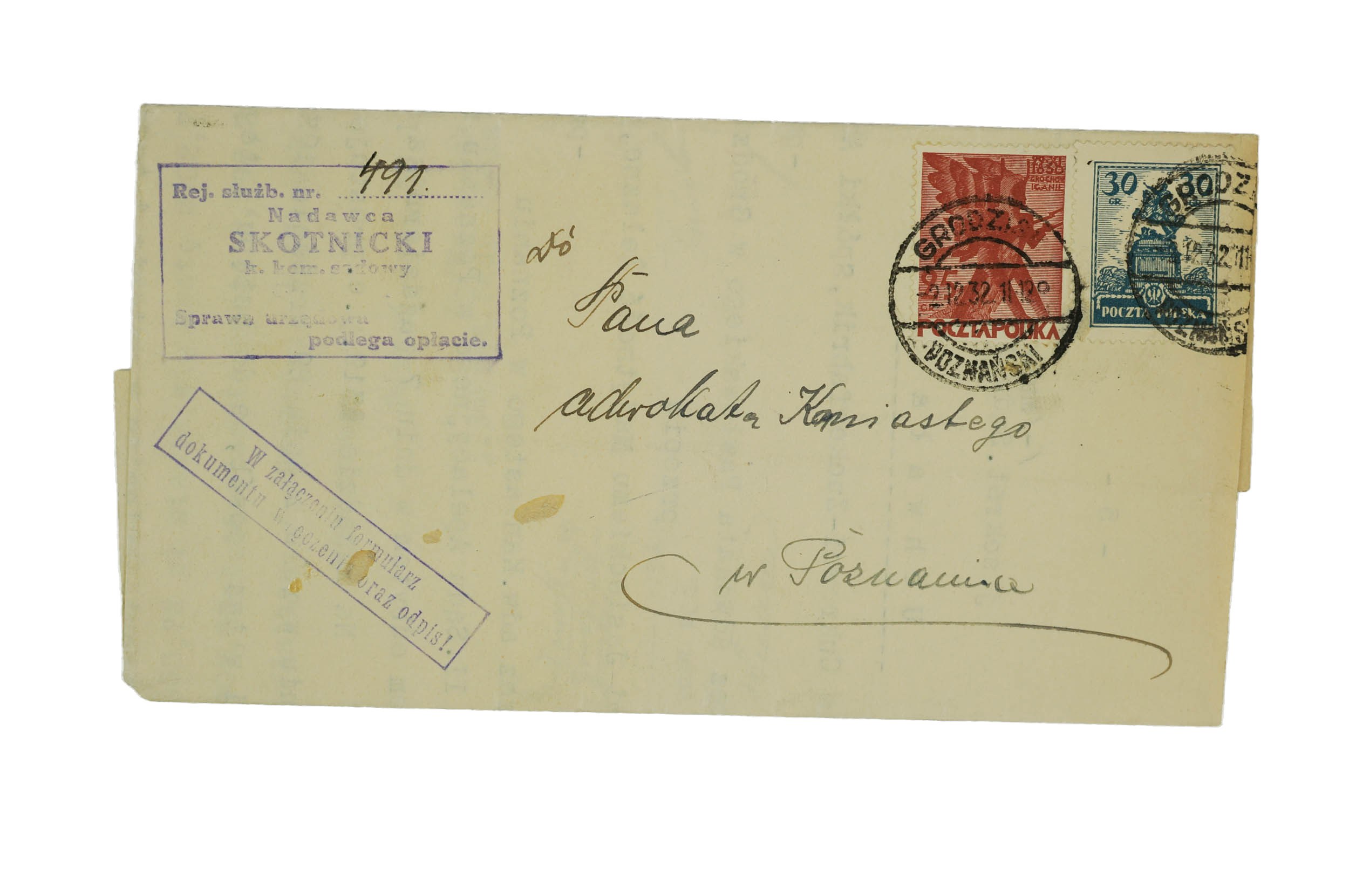SKOTNICKI komornik sądowy GRODZISK - nieotwierana korespondencja do adwokata, stemple, znaczki opłaty, f. 17,5x9,5cm