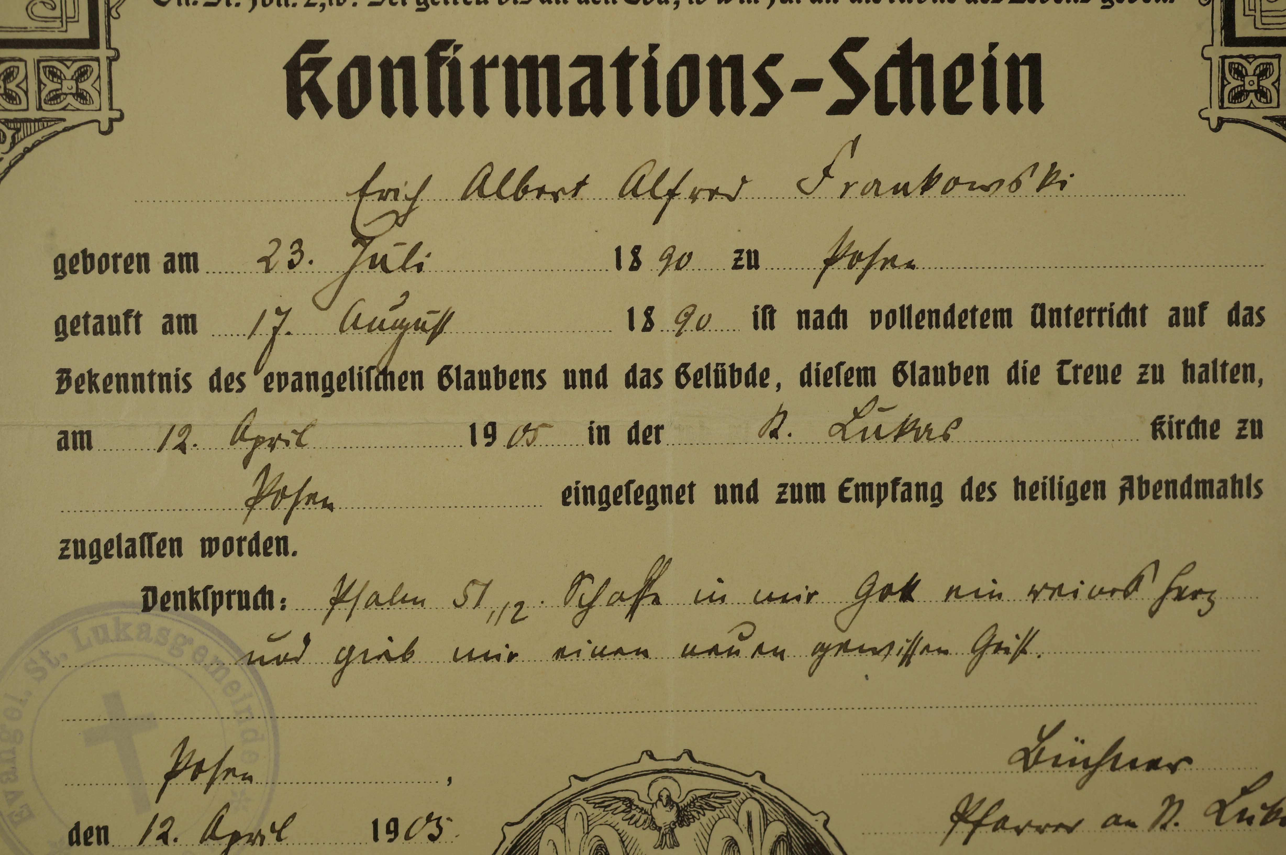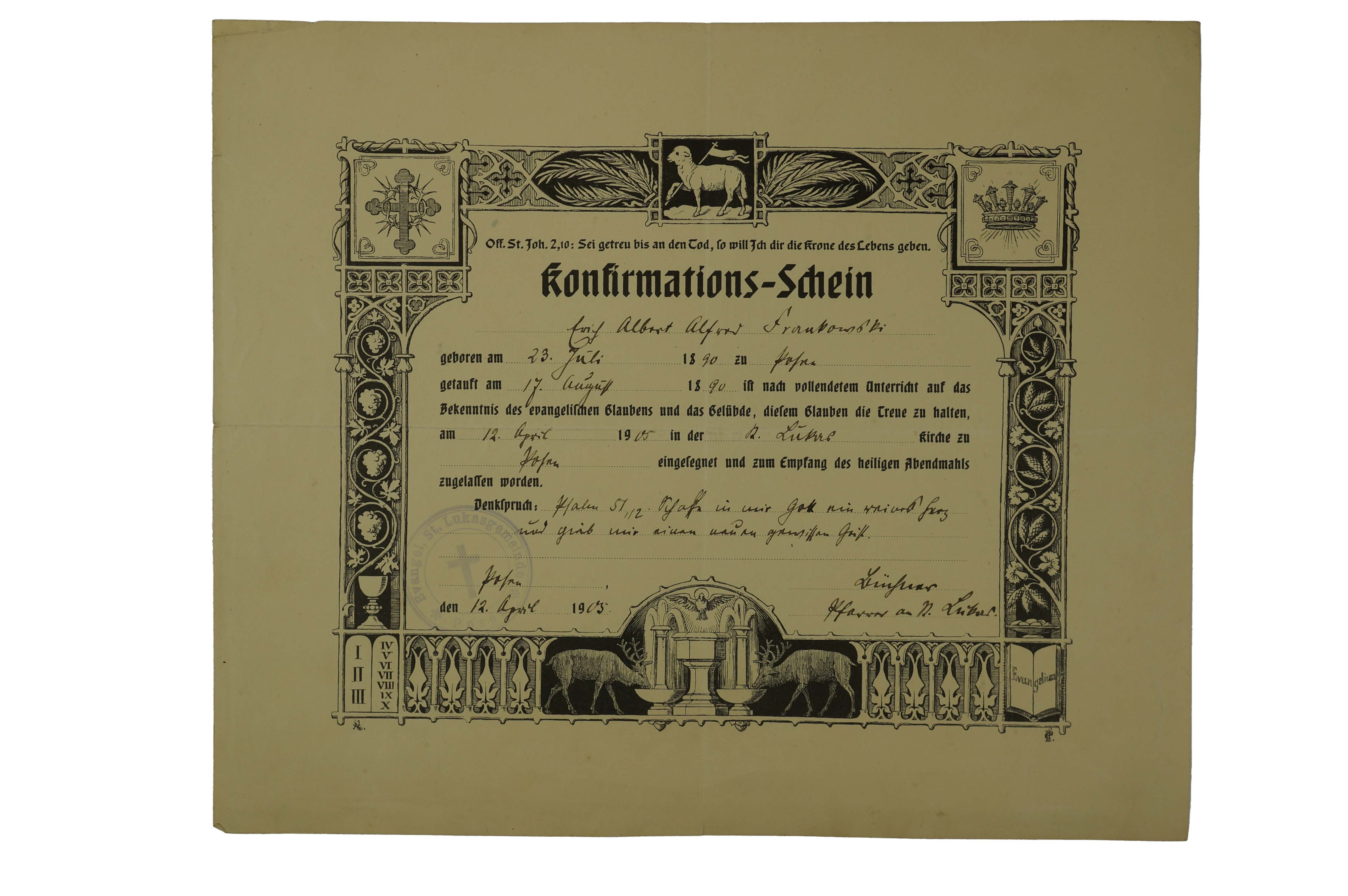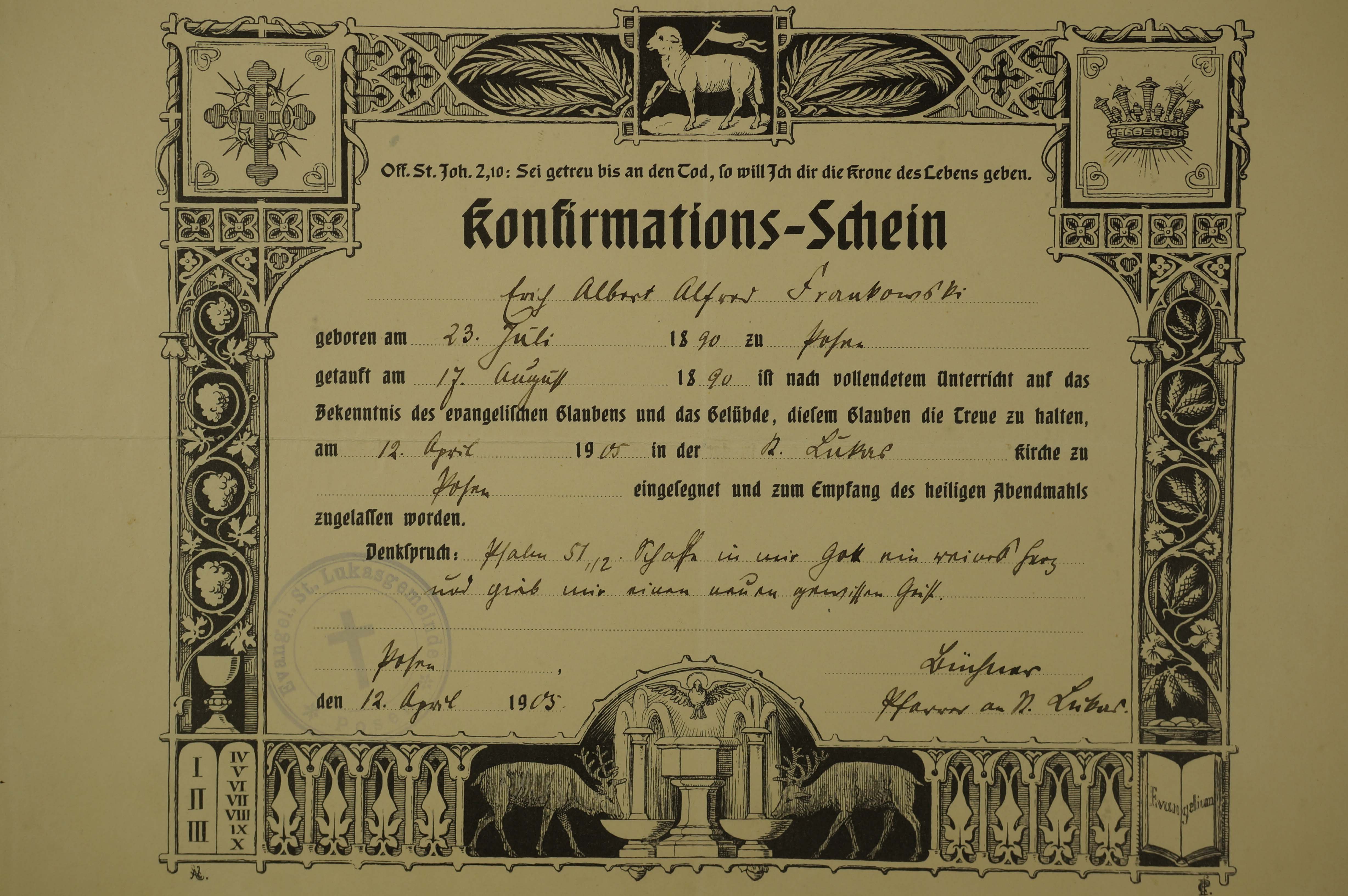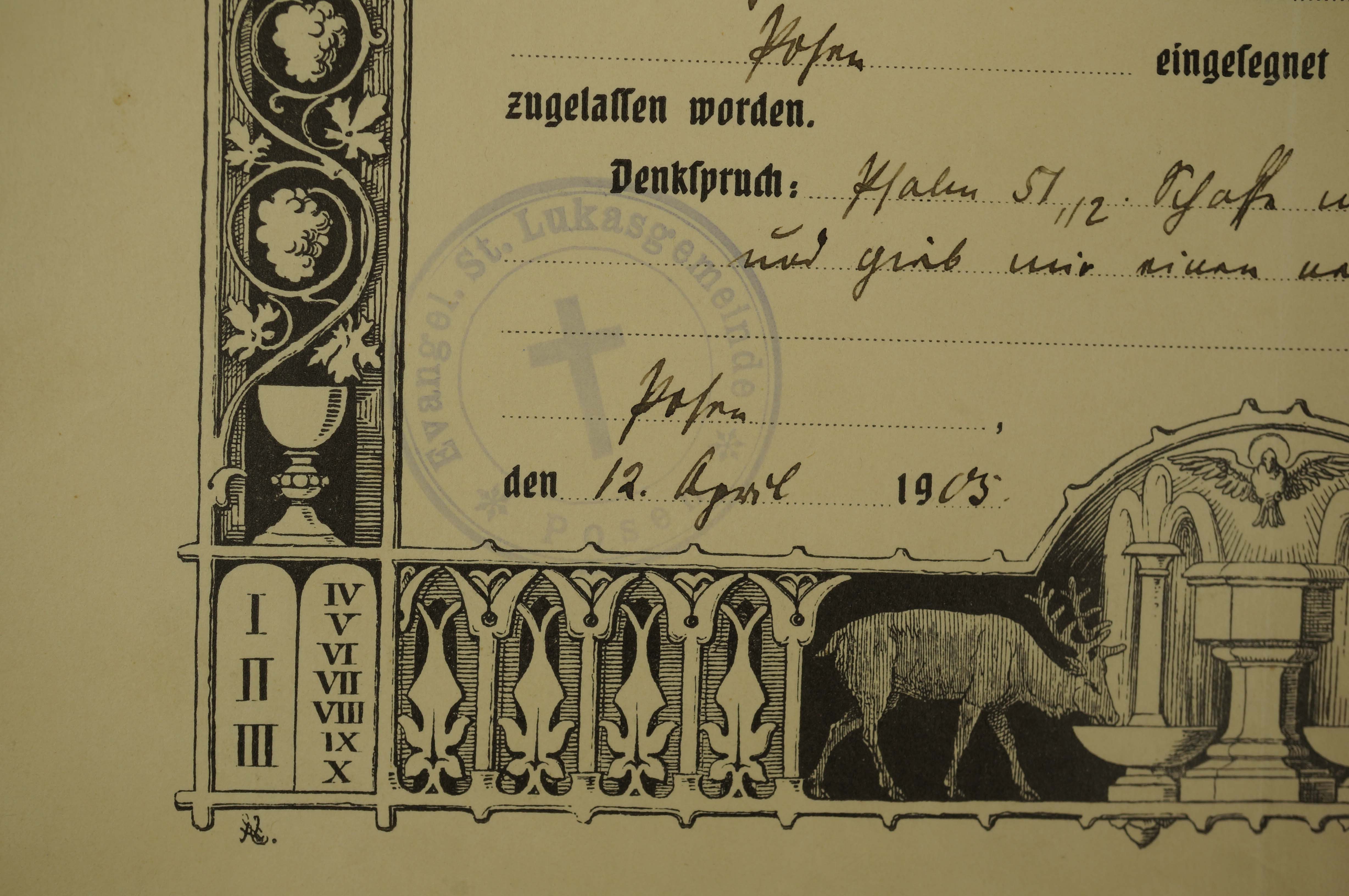 Świadectwo konfirmacji [bierzmowania] / [Konfirmations Schein], datowane 12.IV.1905r., druk w języku niemieckim, wypełniany odręcznie, f. 25x21cm