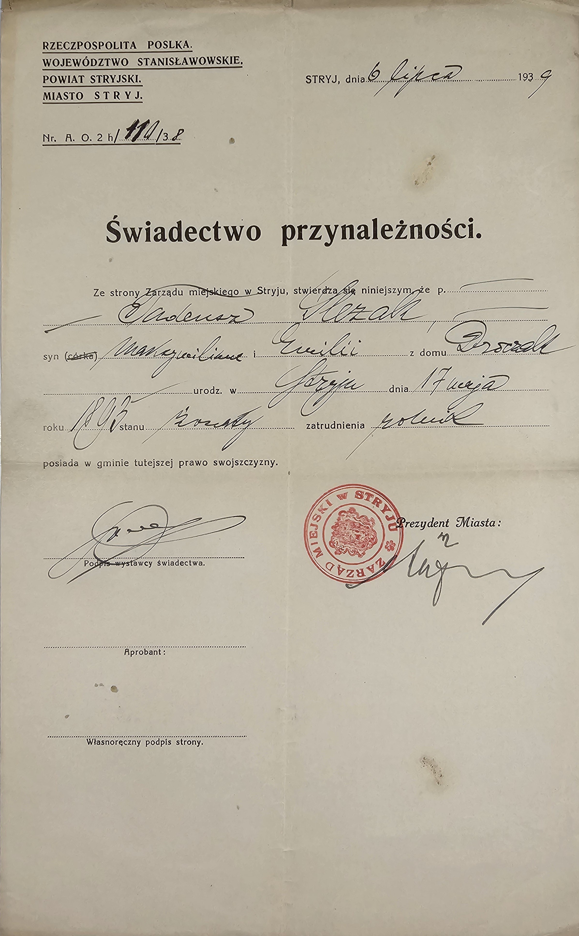 Świadectwo dla Tadeusz Śleżak, potwierdzające gminne prawo swojszczyzny. Stryj, dn. 6 lipca 1939 r., pieczęć miejska i podpis. Karta papier., wym.: 33 x 22 cm. Stan dobry.