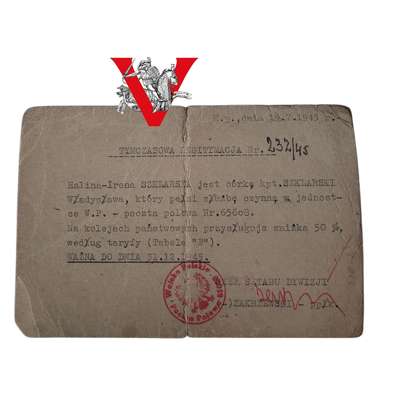 Tymczasowa legitymacja wojskowa wystawiona w dniu 10 lipca 1945 roku dla Haliny Ireny Szklarskiej, córki kapitana Władysława Szklarskiego, pełniącego czynną służbę w 13 Dywizji Piechoty Wojska Polskiego (poczta polowa nr 65608).