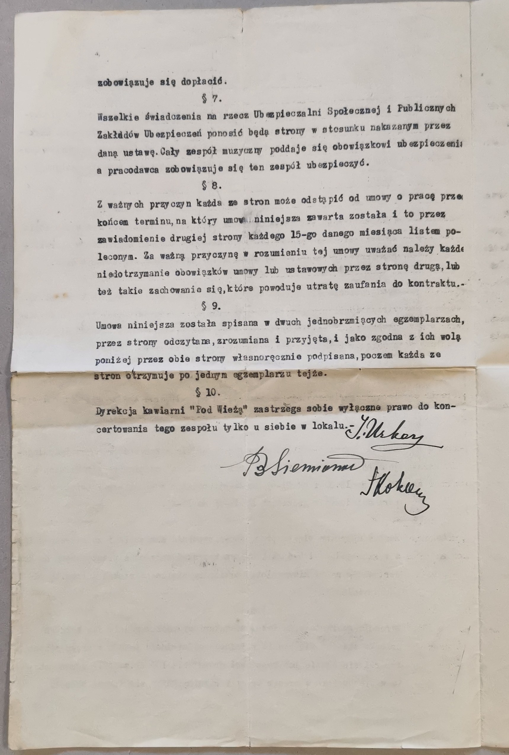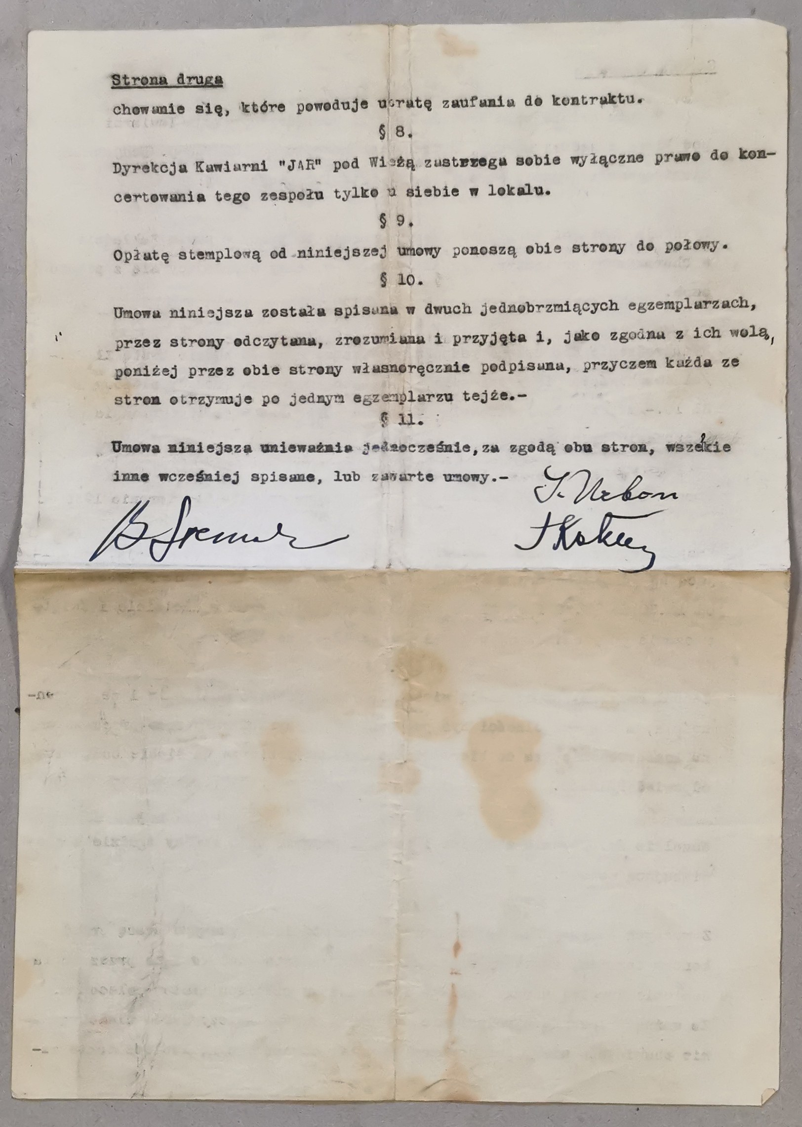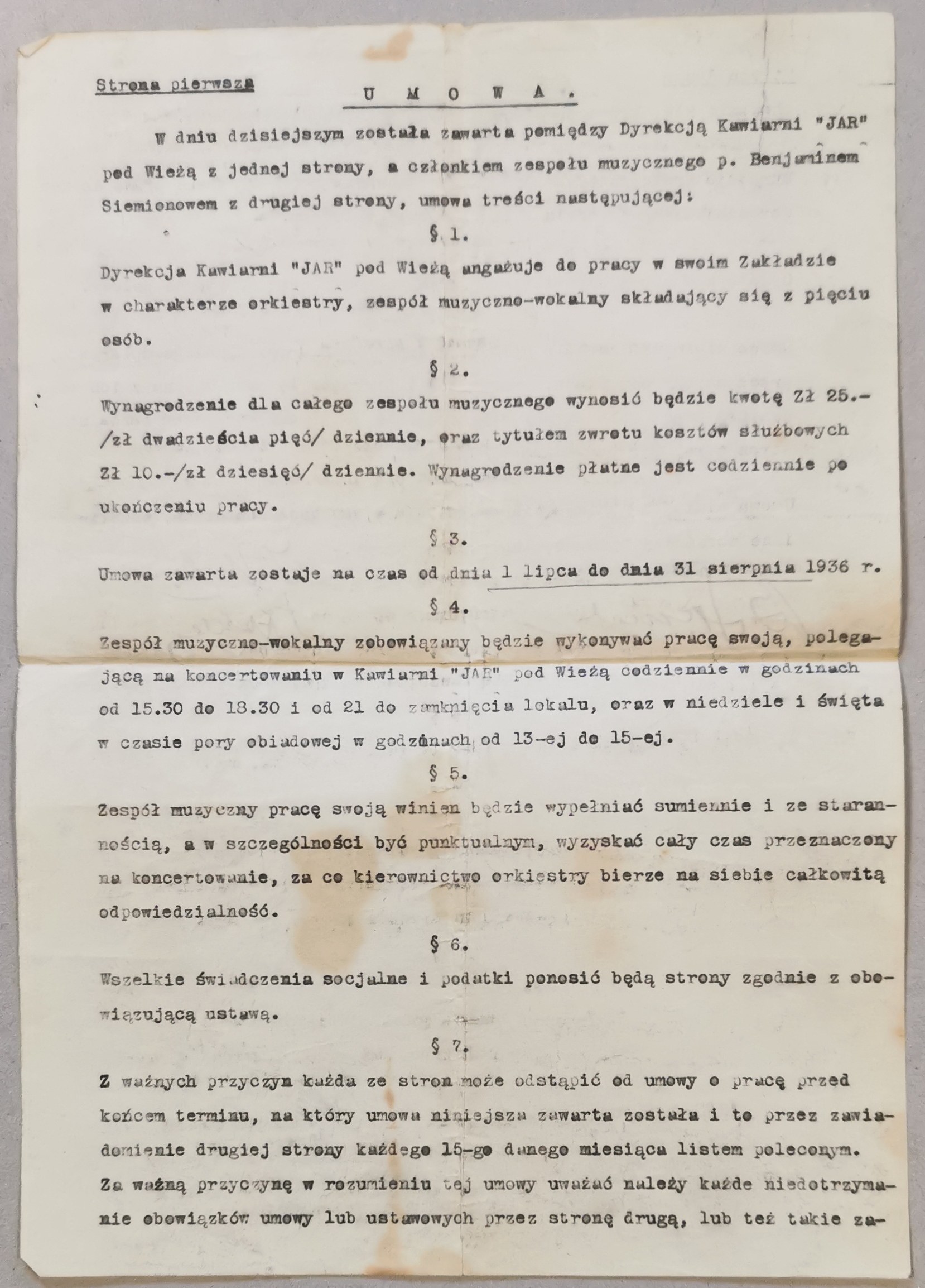 b) Umowa pomiędzy Dyrekcją Kawiarni „Jar” pod Wieżą a Benjaminem Siemionowem, na okres od 1 lipca do 31 sierpnia 1936 (podpisy jak w w.w. poz.; z zespołu odeszła 1 osoba i z tego względu pewnie nastąpiła korekta). Maszynopis 2 str., format 29,7 x 20,9 cm.