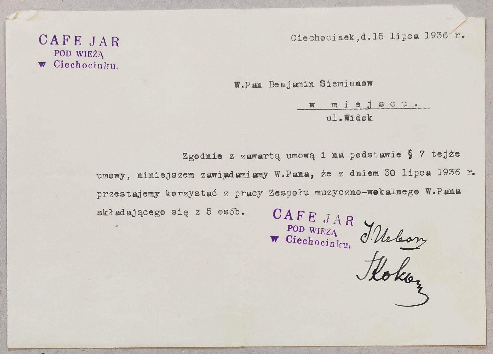 c) Wypowiedzenie umowy, druk z dwiema pieczątkami Cafe Jar pod Wieżą w Ciechocinku, z 15 lipca 1936r., podpisany przez (w.w. właścicieli), z zawiadomieniem o rozwiązaniu umowy z dniem 30 lipca 1936r. Maszynopis, 1 str., format 14,9 x 20,9 cm.