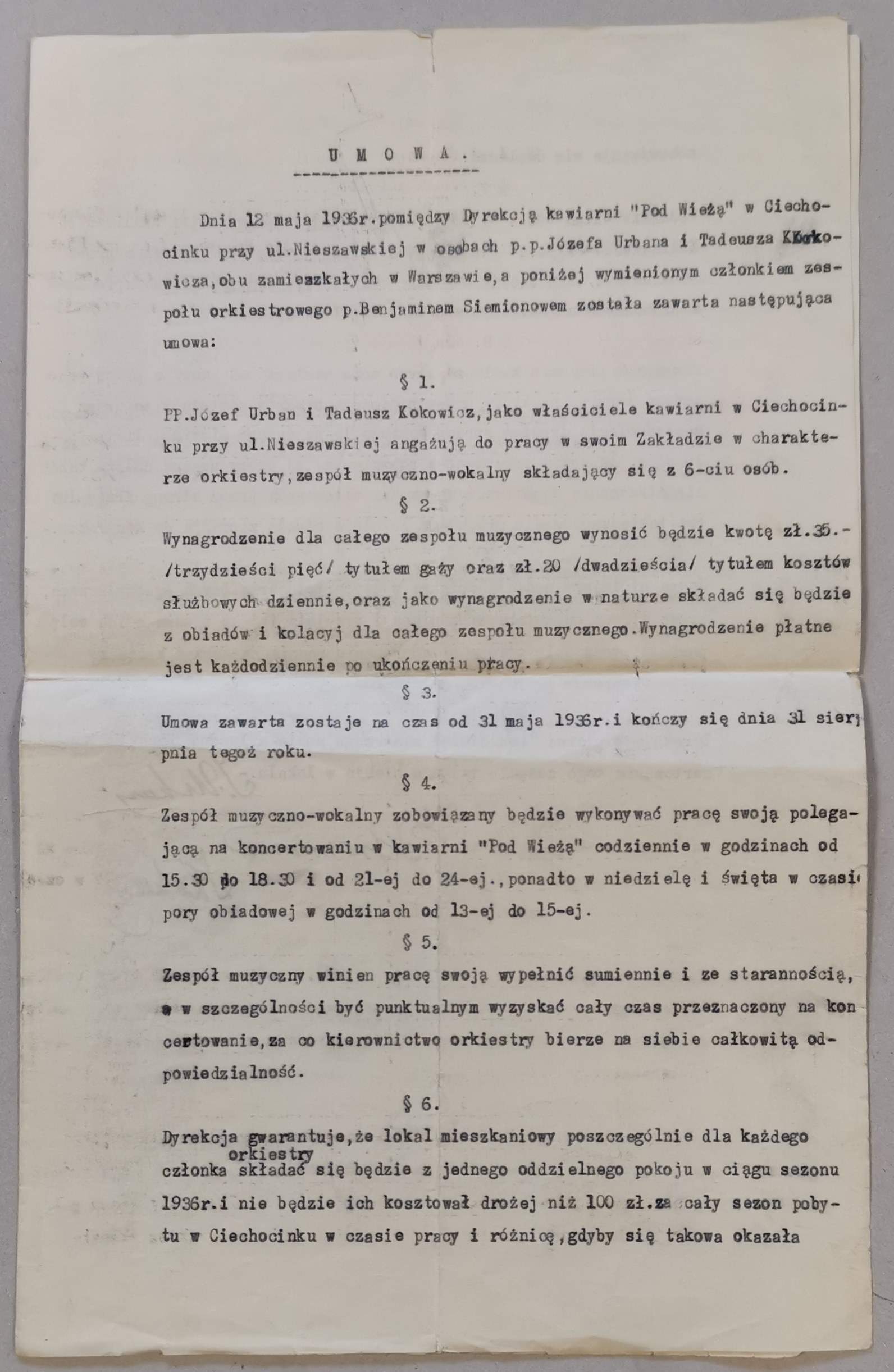 a) Umowa z 12 maja 1936 pomiędzy Dyrekcją kawiarni „Pod wieżą” w Ciechocinku przy ul. Nieszawskiej (reprezentowanej przez Józefa Urbana i Tadeusza Korkowicza) a Benjaminem Siemionowem (podpisy wszystkich trzech na końcu dokumentu), na okres od 31 maja 1936, do 31 sierpnia 1936. Maszynopis, tekst na stronach 1/2 (z 4), format 35,4 x 22,3 cm.