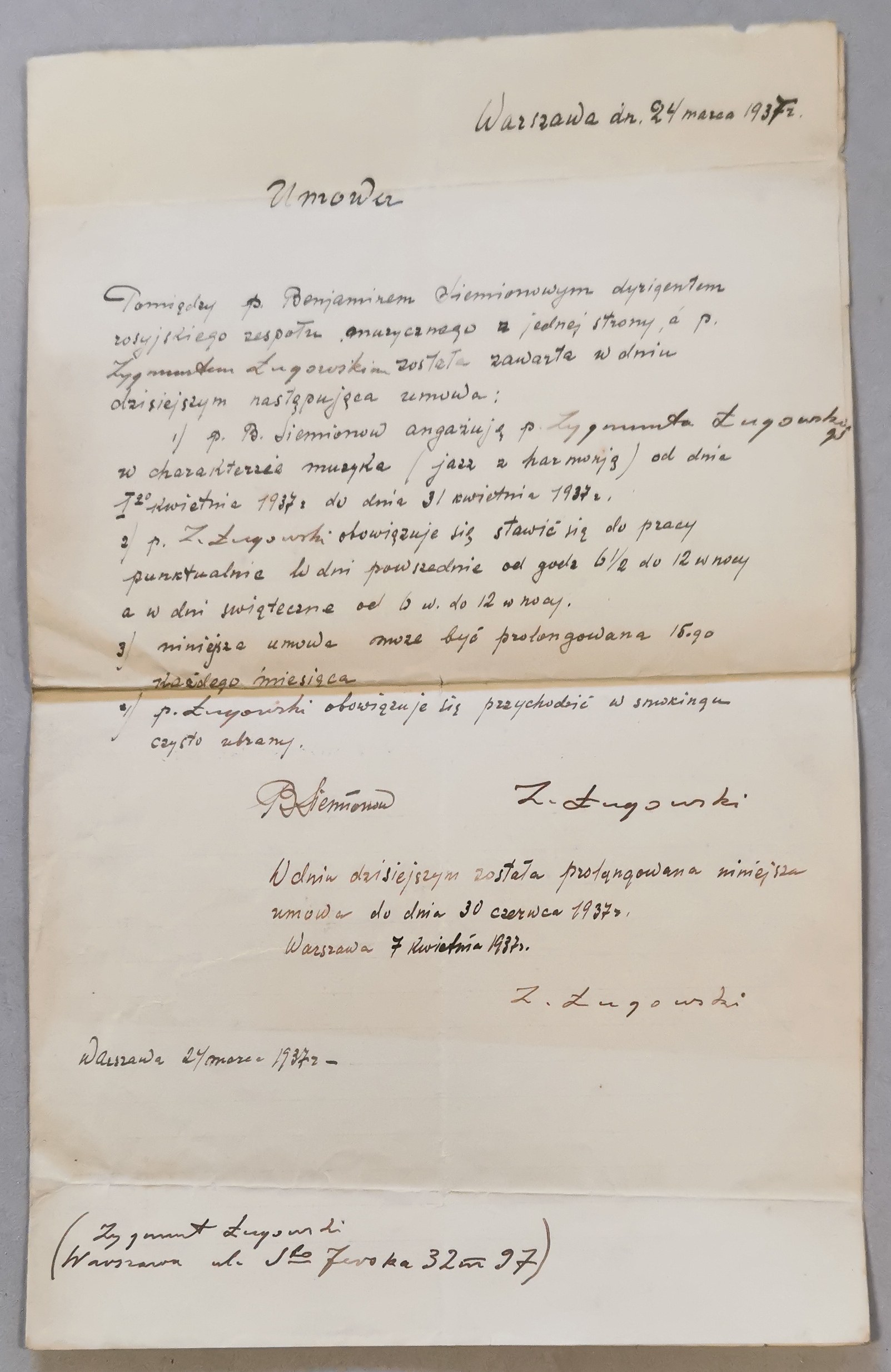 d) Odręcznie napisana umowa z 24 marca 1937 pomiędzy Benjaminem Siemionowem, dyrygentem rosyjskiego zespołu muzycznego, a Zygmuntem Ługowskim, muzykiem (jazz z harmonją), na okres od 1 do 31 kwietnia 1937. Poniżej dopisek z prolongatą tej umowy na okres do 30 czerwca. Podpisy Siemionowa i Ługowskiego. Zapisana 1 strona(z 4), format arkusza 35,5x 22,3 cm.
