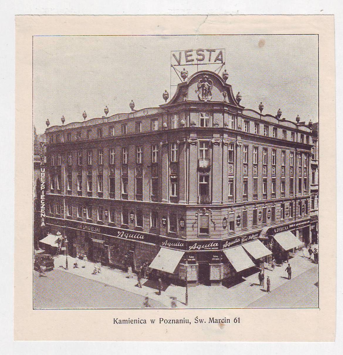 VESTA, przedwojenny widok kamienicy w Poznaniu, wyklejka na kartonie. Poznań