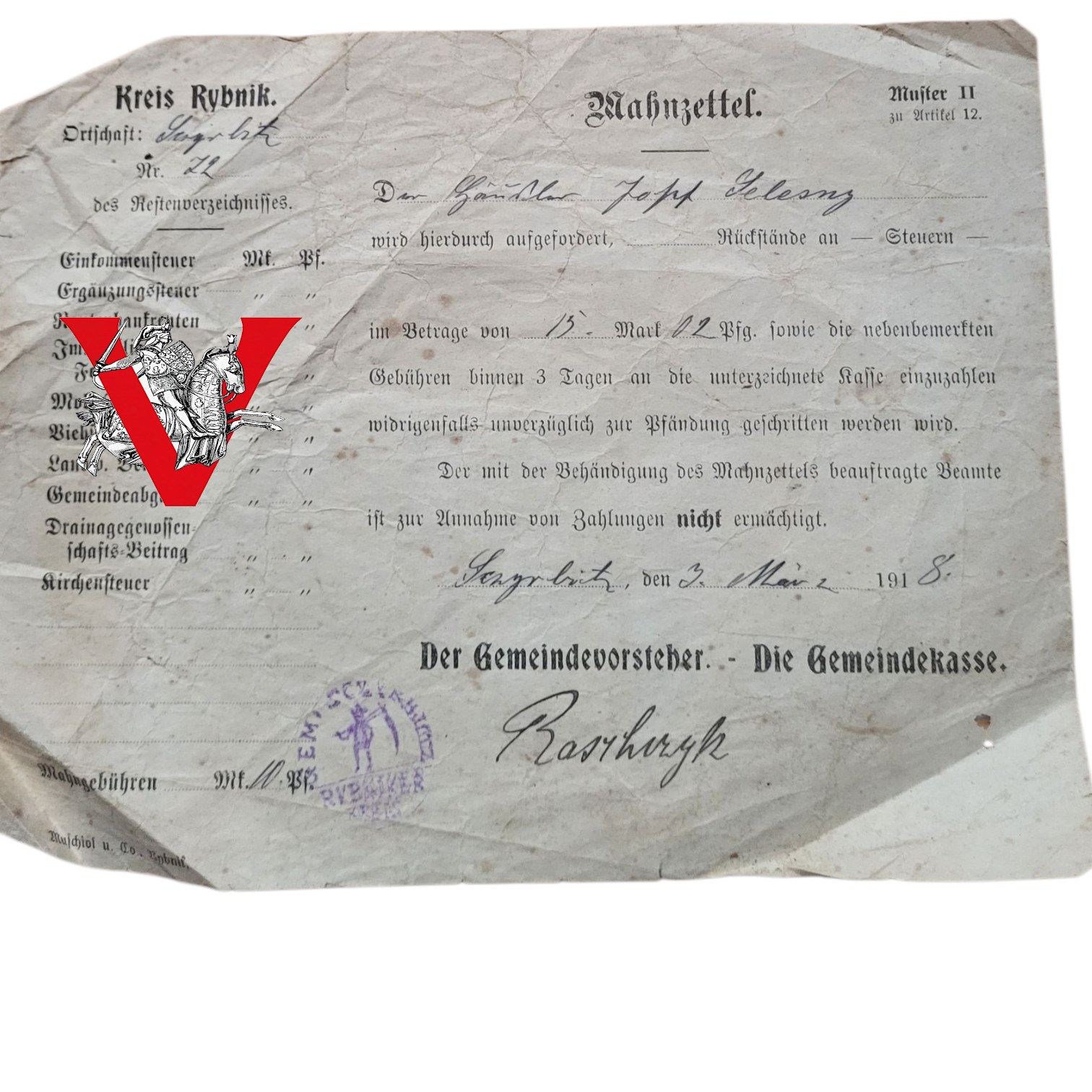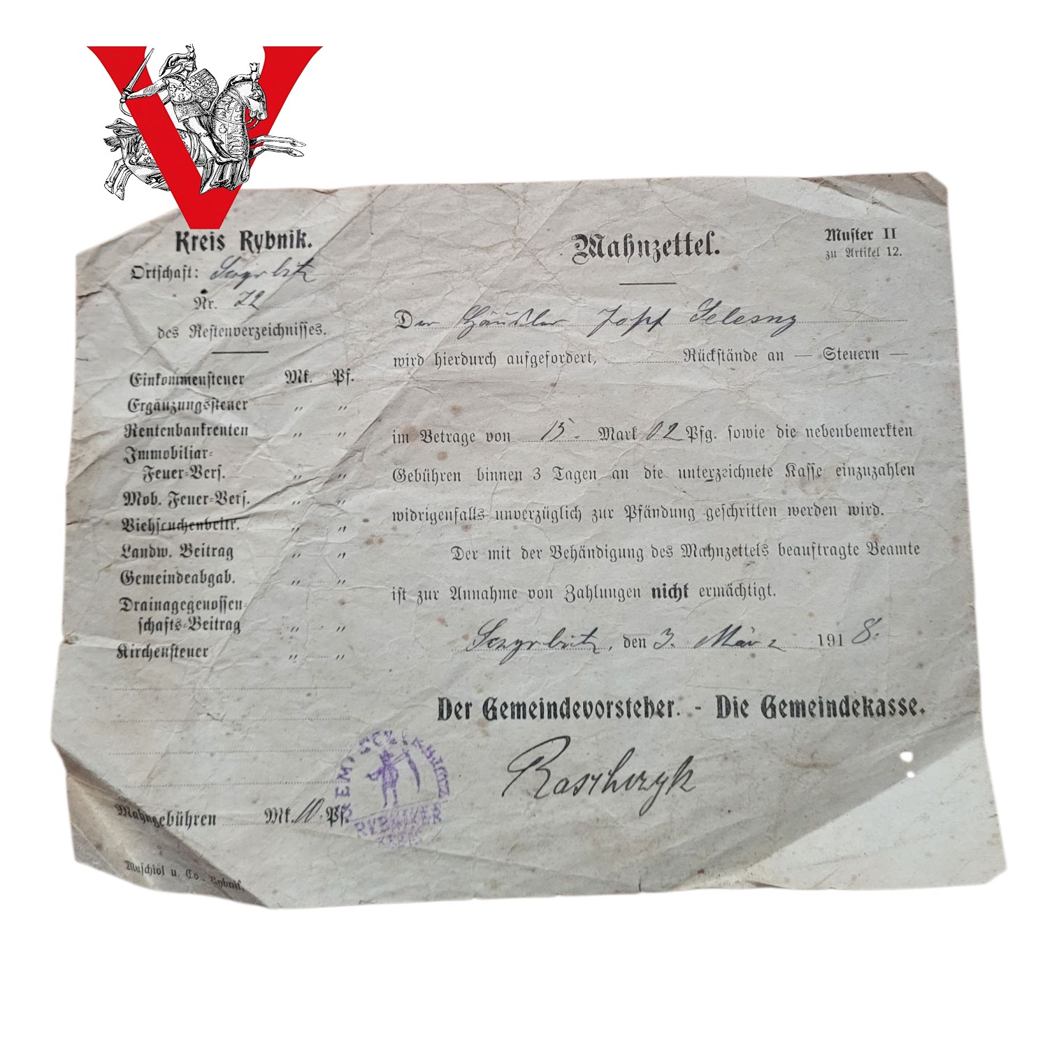 Dokument urzędowy z 1918 roku – „Mahnszettel” (wezwanie do zapłaty zaległych podatków) wystawiony przez administrację powiatową Kreis Rybnik dla miejscowości Gołkowice (niem. Gaschütz). Zawiera pieczęć urzędową oraz podpis przedstawiciela gminy Rasthaupt