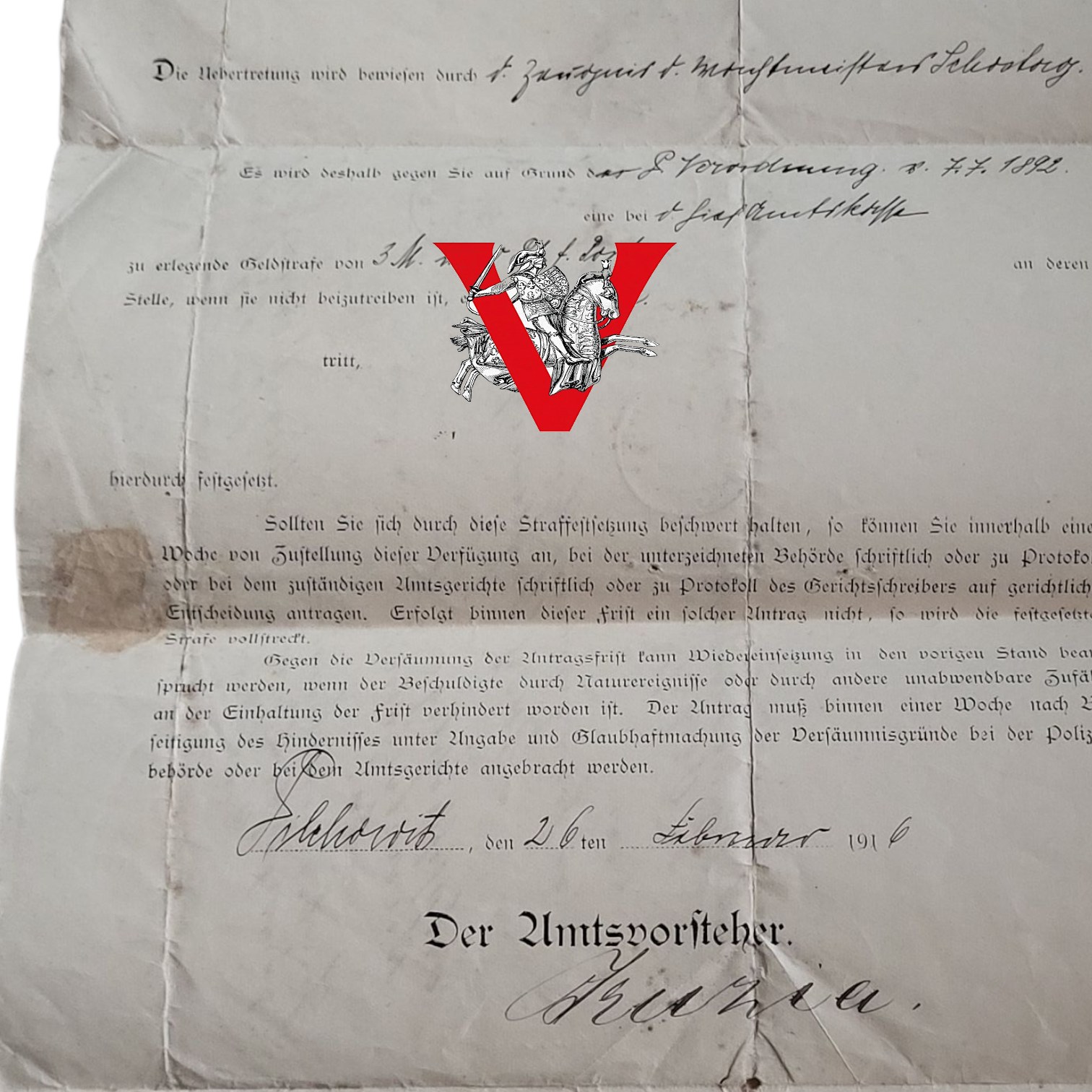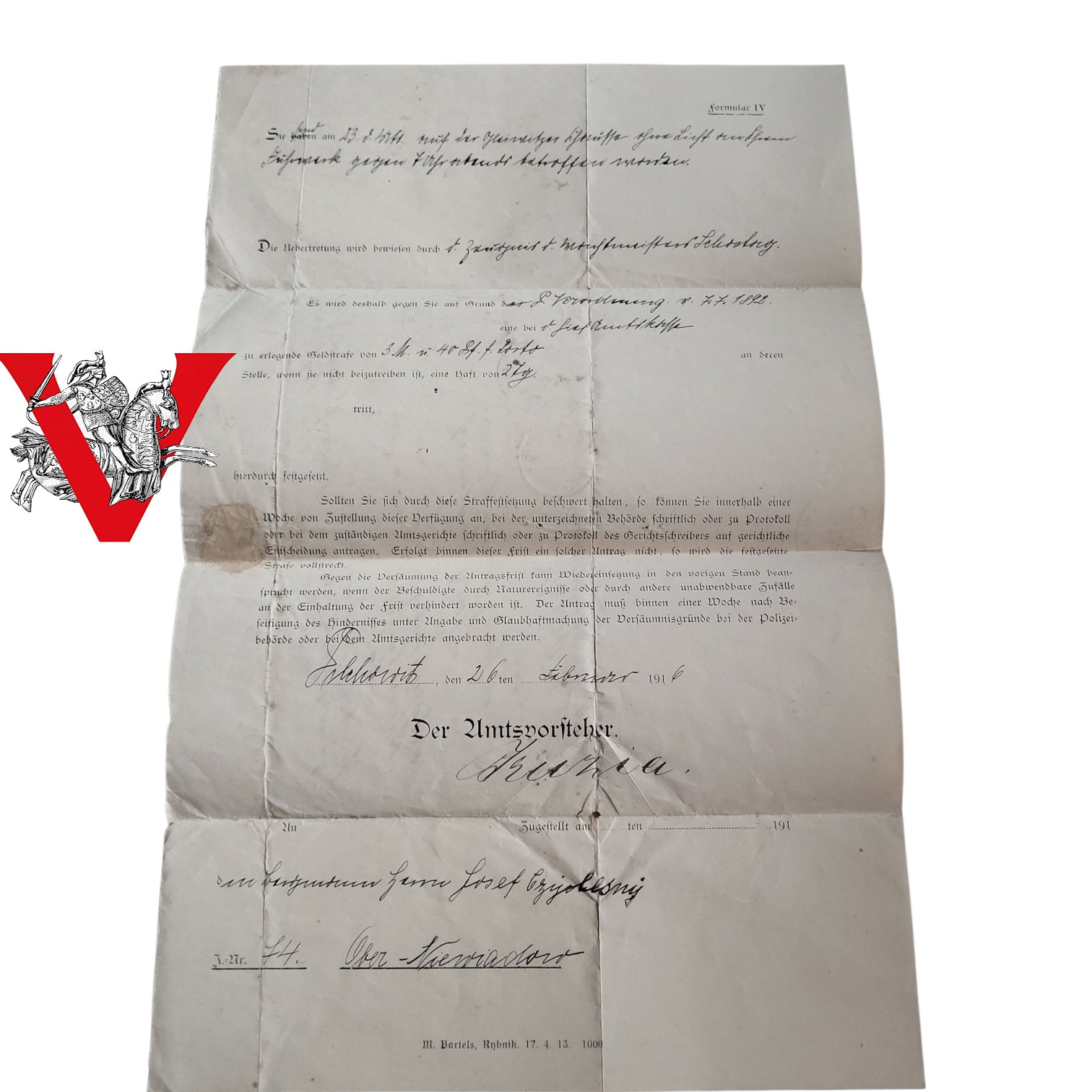 Wezwanie urzędowe Pilchowice 1916 - dokument urzędowy z czasów I wojny światowej, Górny Śląsk
