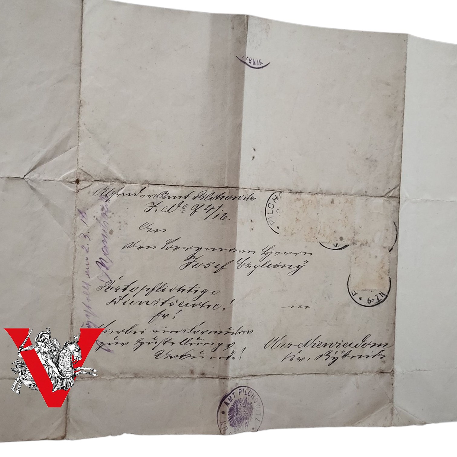 Na odwrocie widoczne pieczęcie urzędowe i datownik z miejscowości Pilchowitz.
