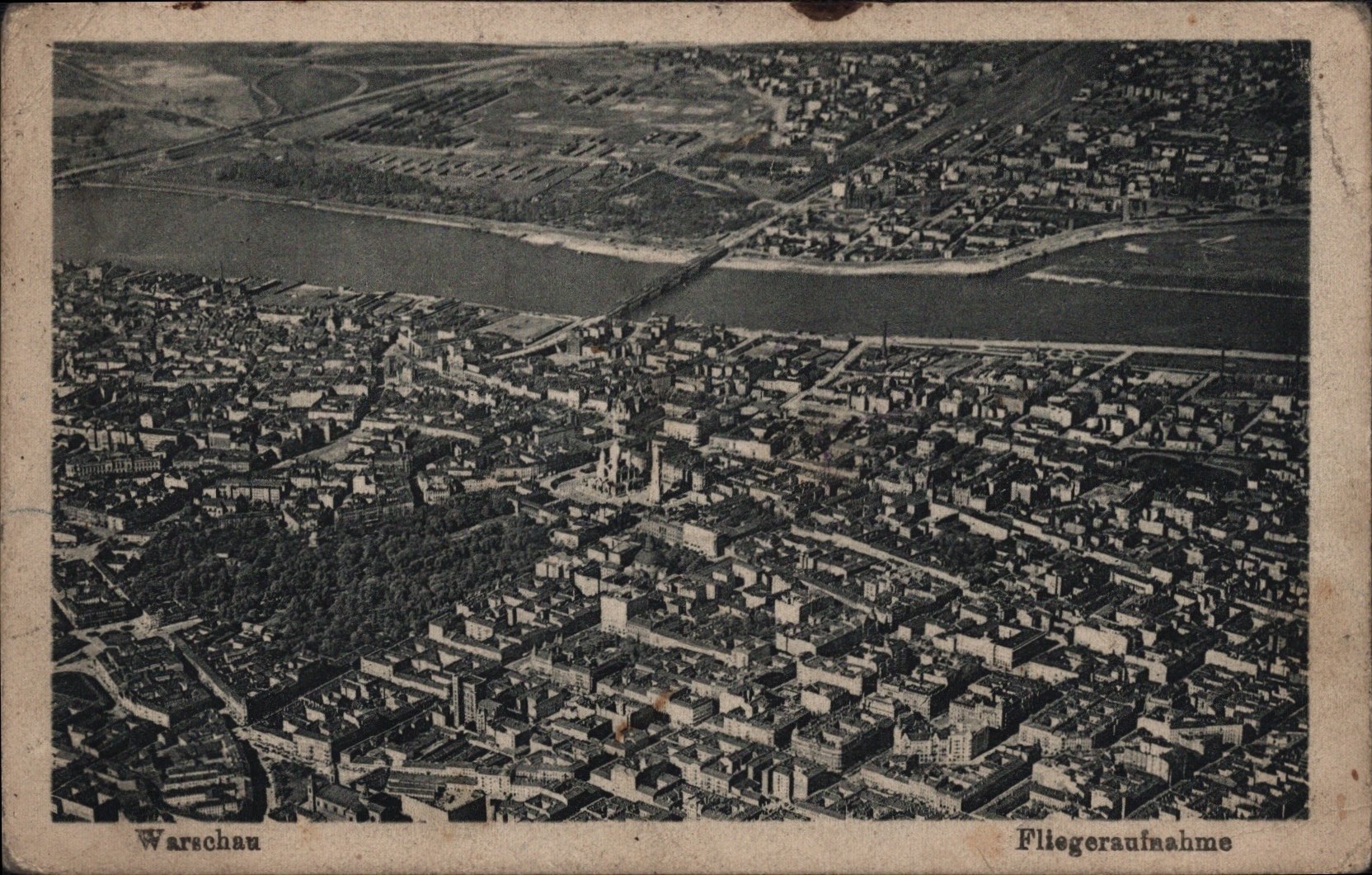 Pocztówka o wym. 14 x 9 cm, z widokiem Warszawy z lotu ptaka, wydana w okresie I wojny światowej.