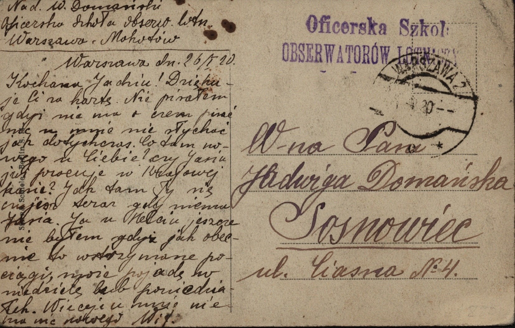 Na odwrocie korespondencja datowana Warszawa 26 V 1920, datownik pocztowy oraz podłużna pieczątka: Oficerska Szkoła Obserwatorów Lotnictwa. Nadawca: W. Domański.