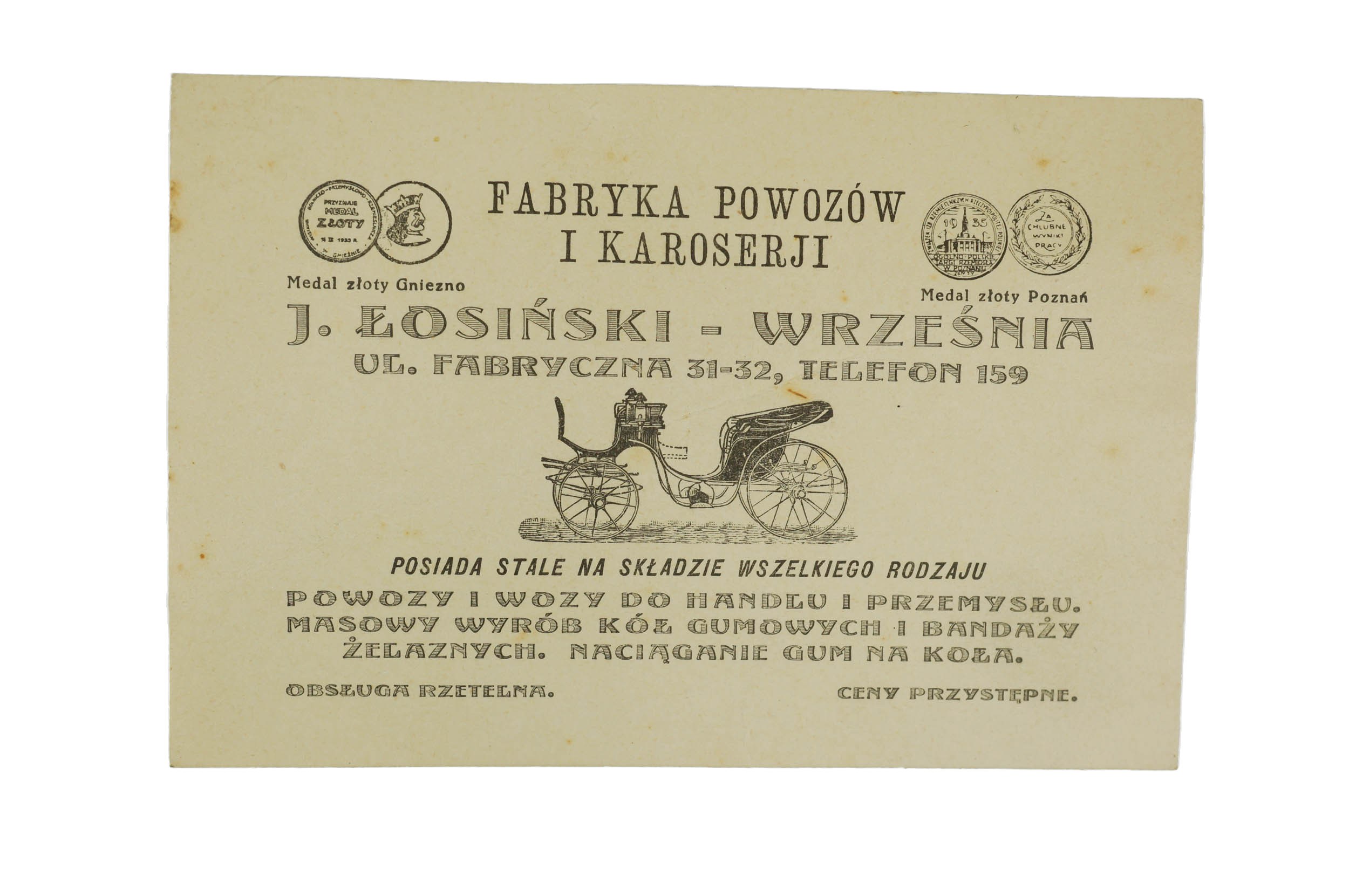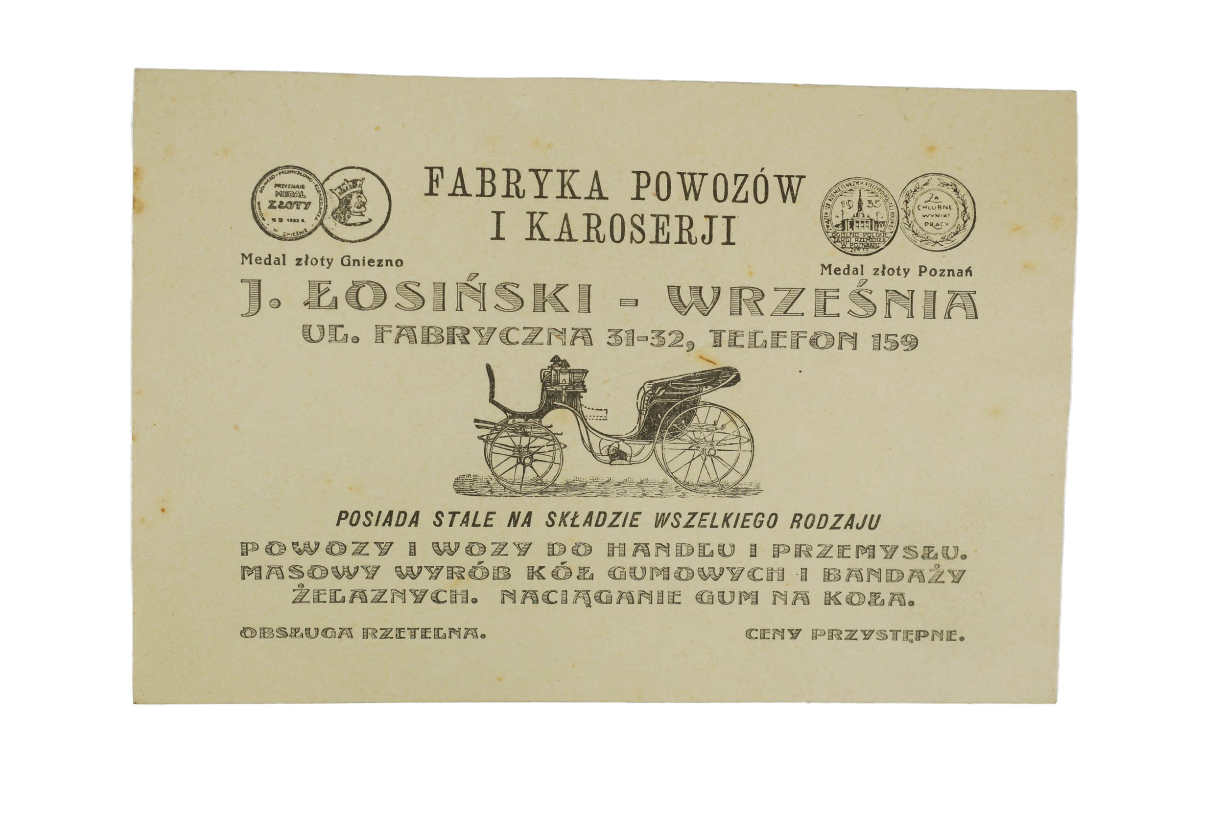 [WRZEŚNIA] Fabryka powozów i karoserii J. Łosiński ul. Fabryczna 31-32, Września, f. 14x9,5cm, RZADKIE