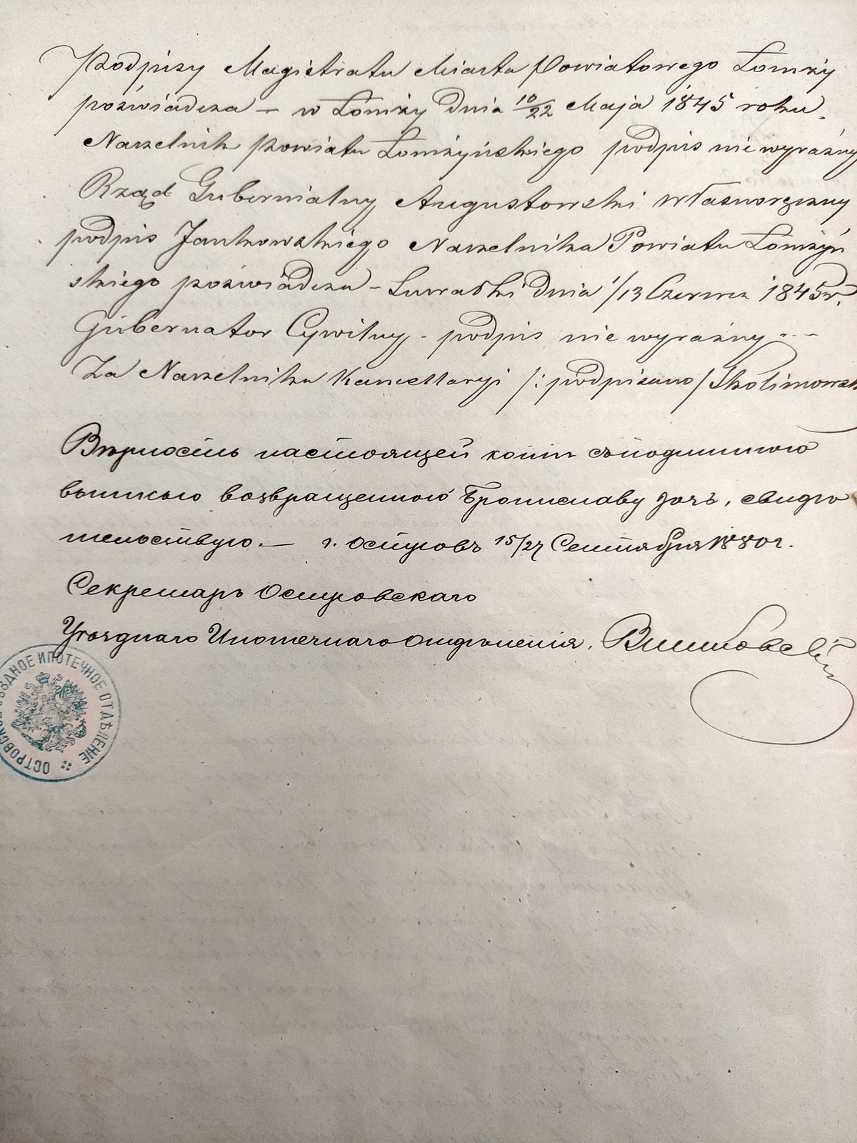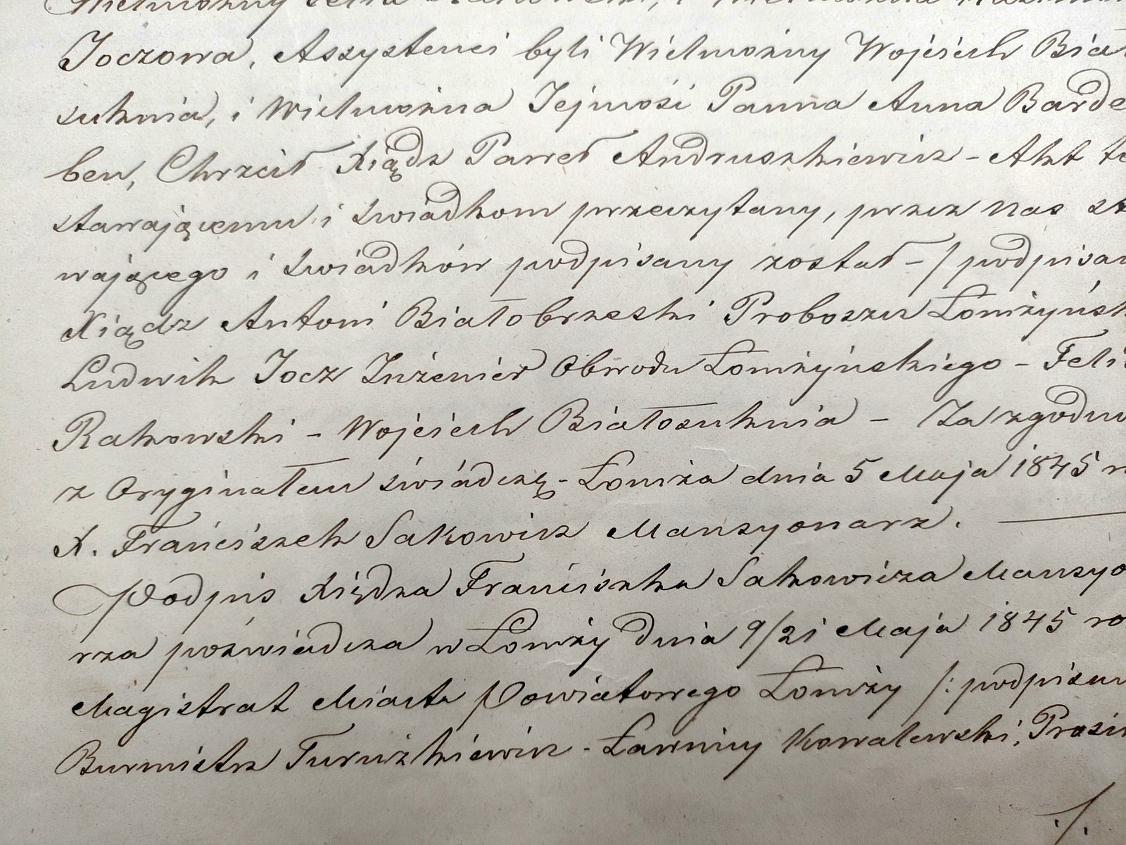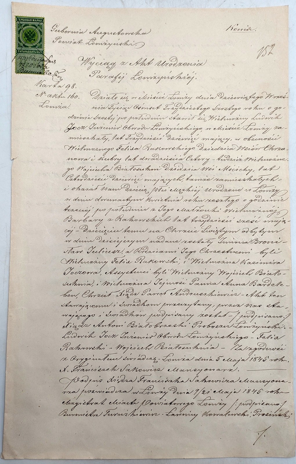 Odpis z aktu urodzenia sporządzonego w Łomży w 1845 roku.
