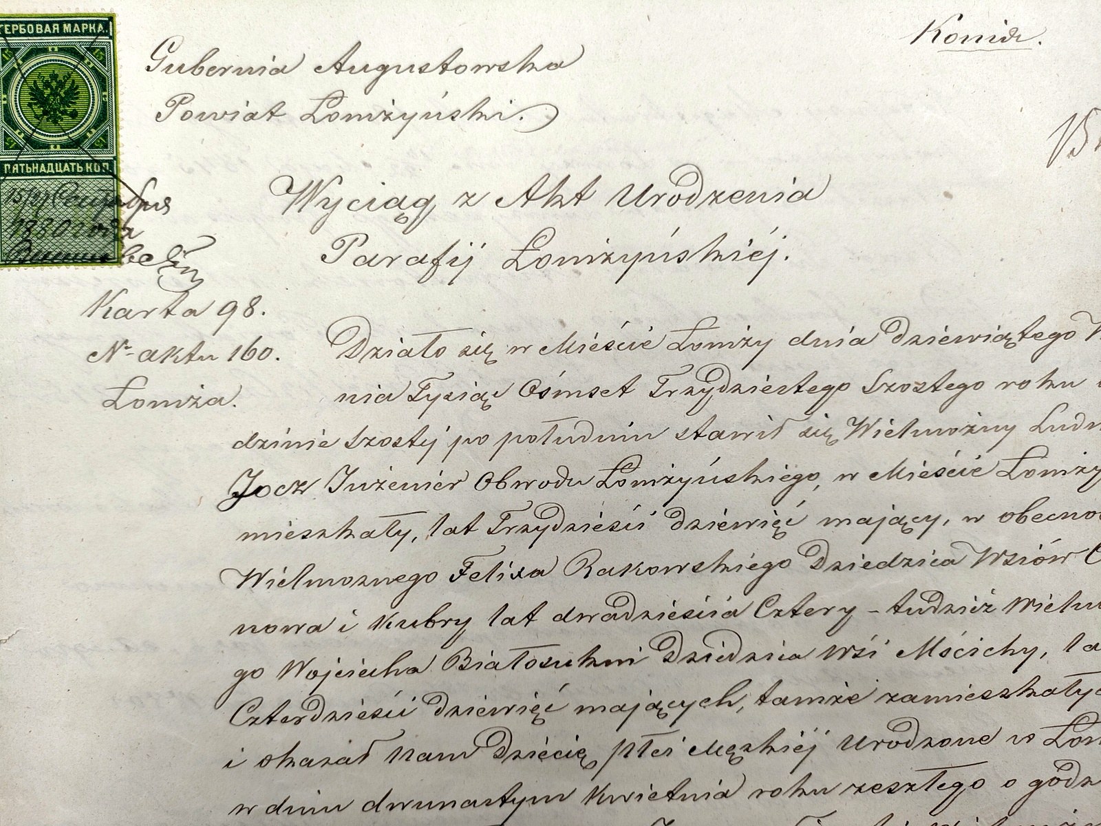 Wyciąg z akt urodzenia - Gubernia Augustowska, Powiat Łomżyński, - Łomża 1882