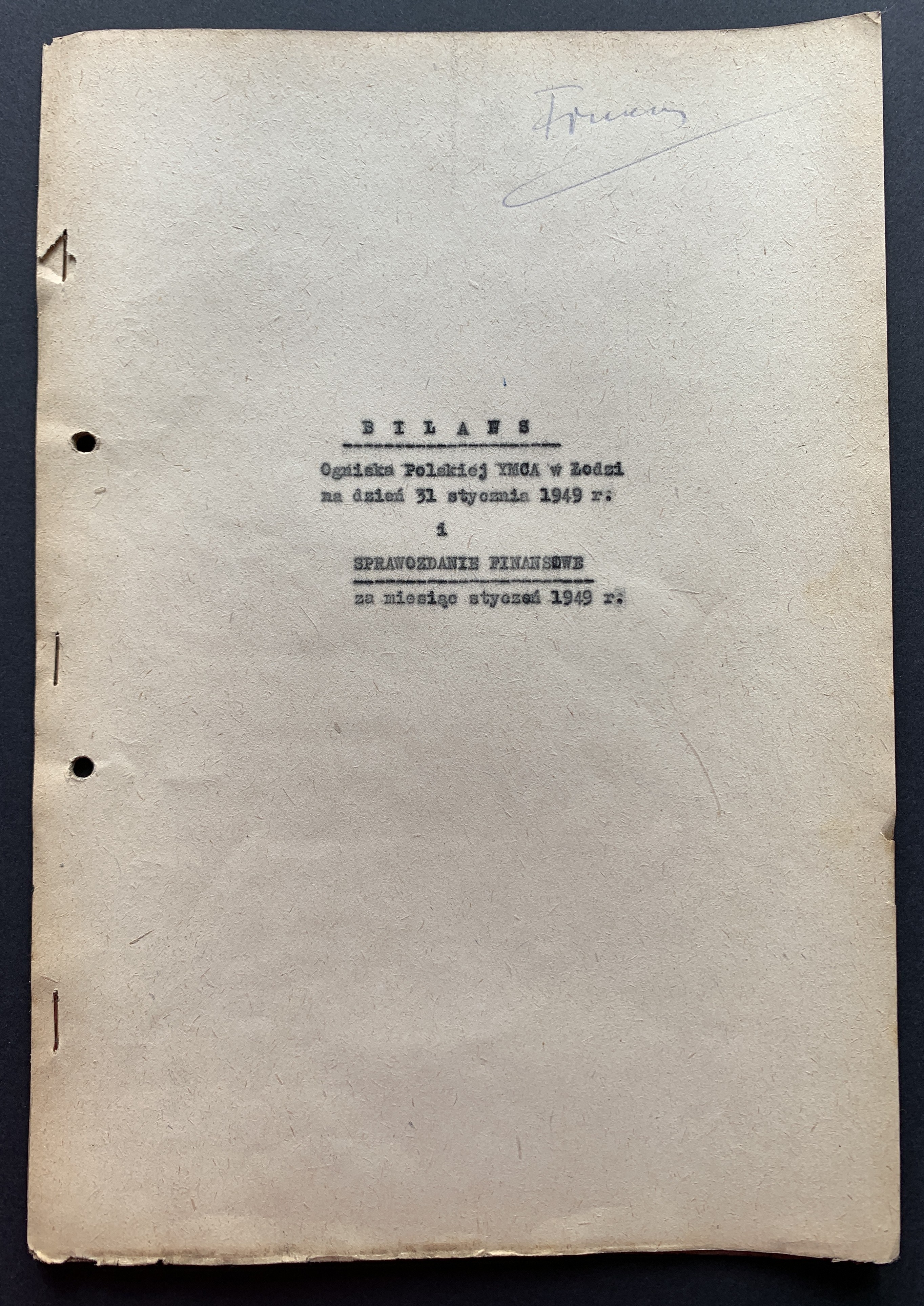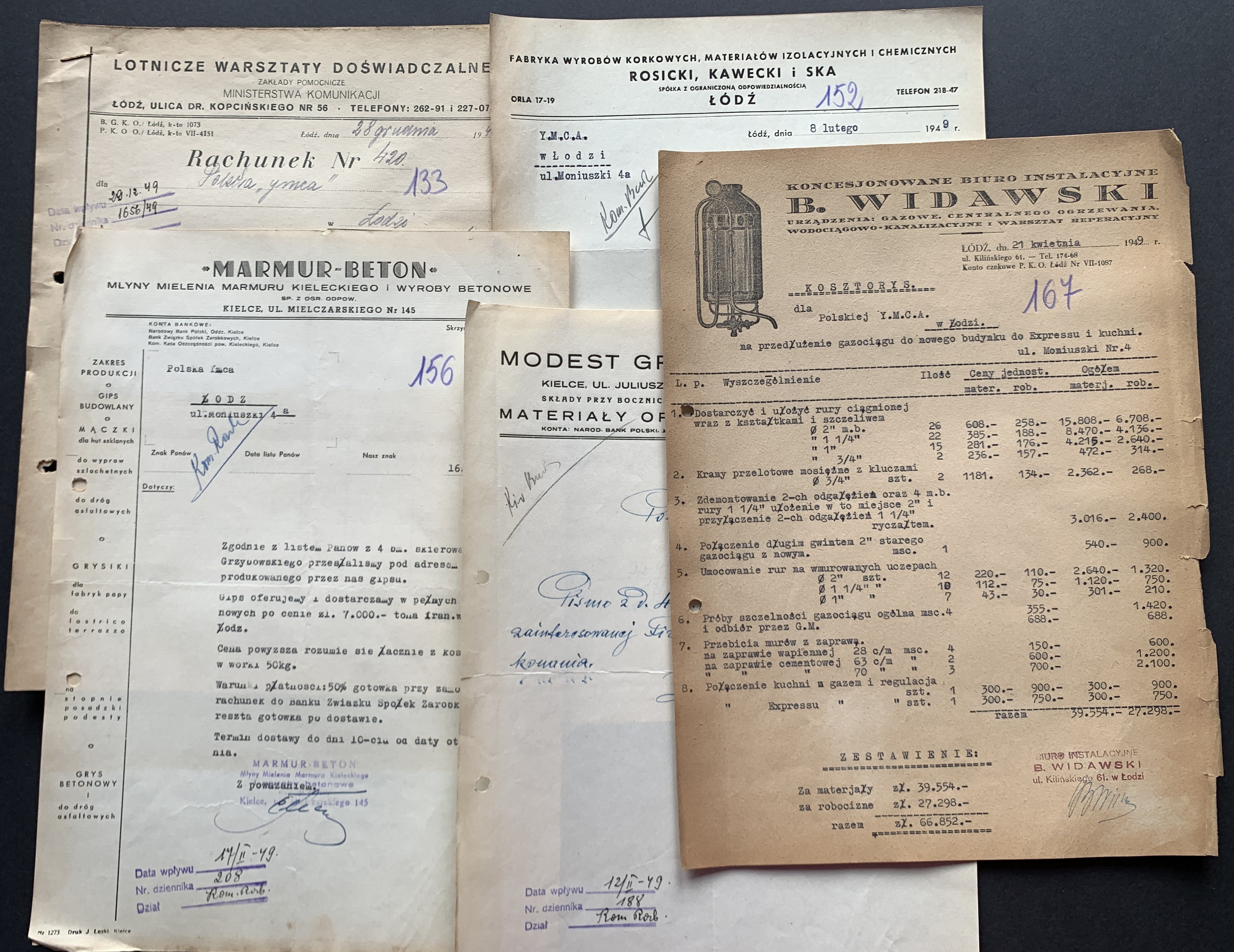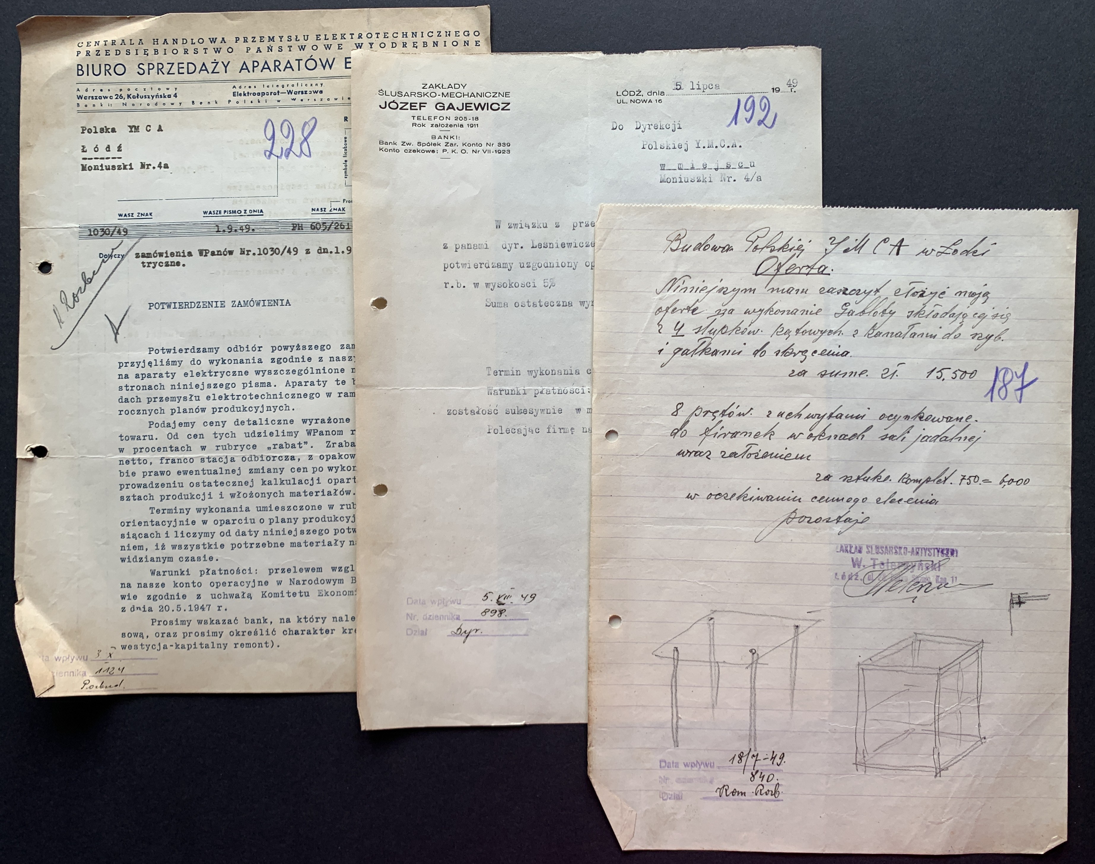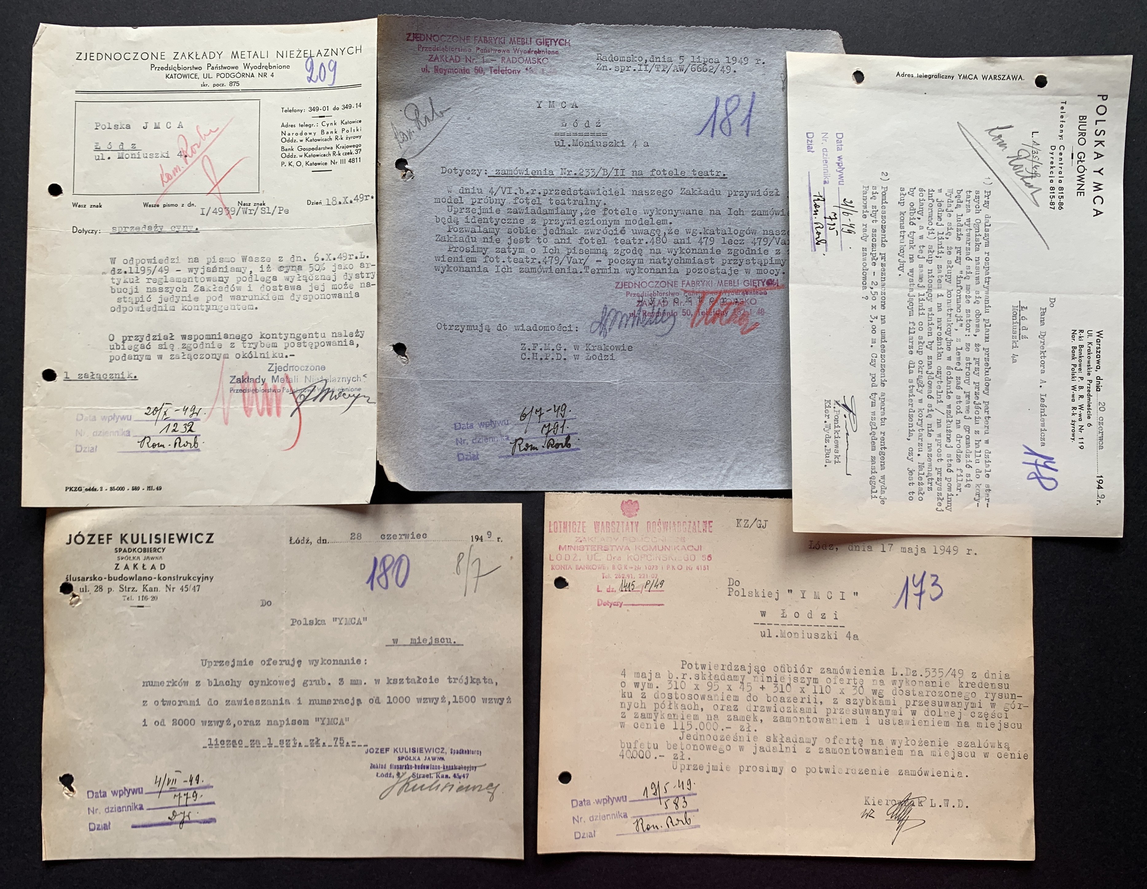 Zestaw 40 dokumentów dotyczących działalności Polskiego Oddziału Y.M.C.A. w Łodzi: korespondencja handlowa, umowa najmu Łódzkiego Stowarzyszenia Śpiewaczego „Mannergesangferein", Bilans finansowy Ogniska Polskiego YMCA w Łodzi za miesiąc styczeń 1949, dwa Świadectwa Kursów Doszkalających dla Dorosłych z 1947 roku, Telegram z 1947 roku,