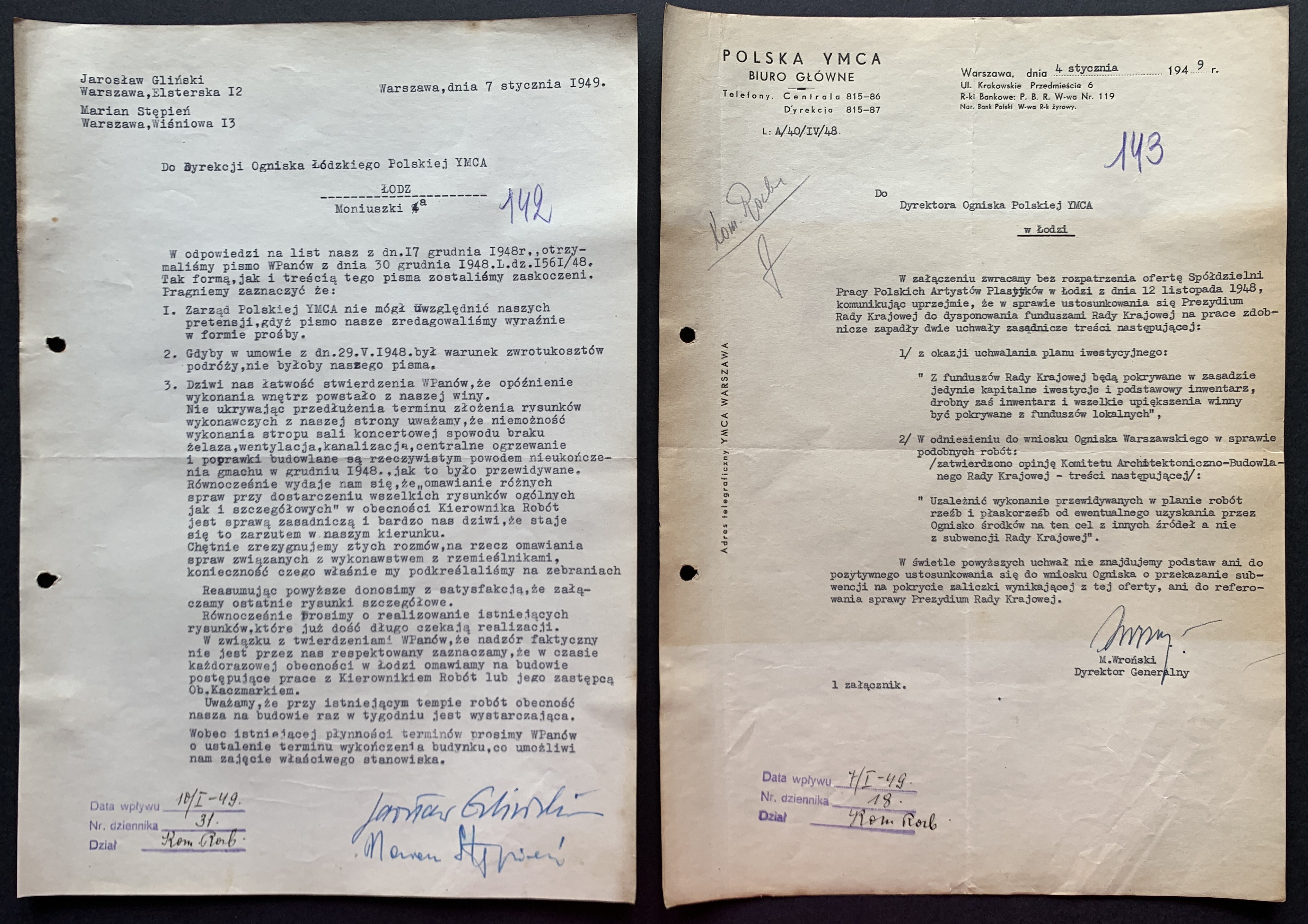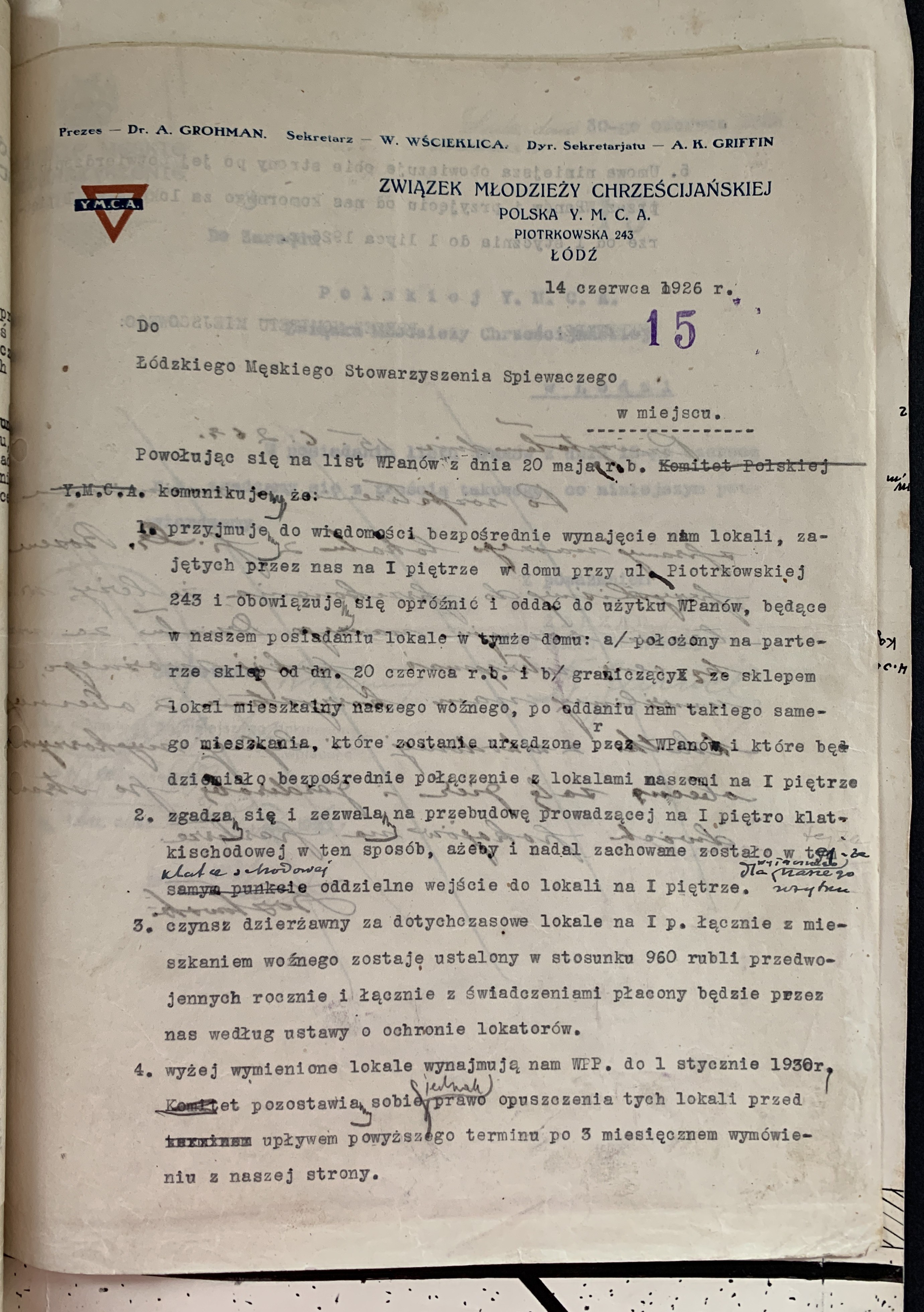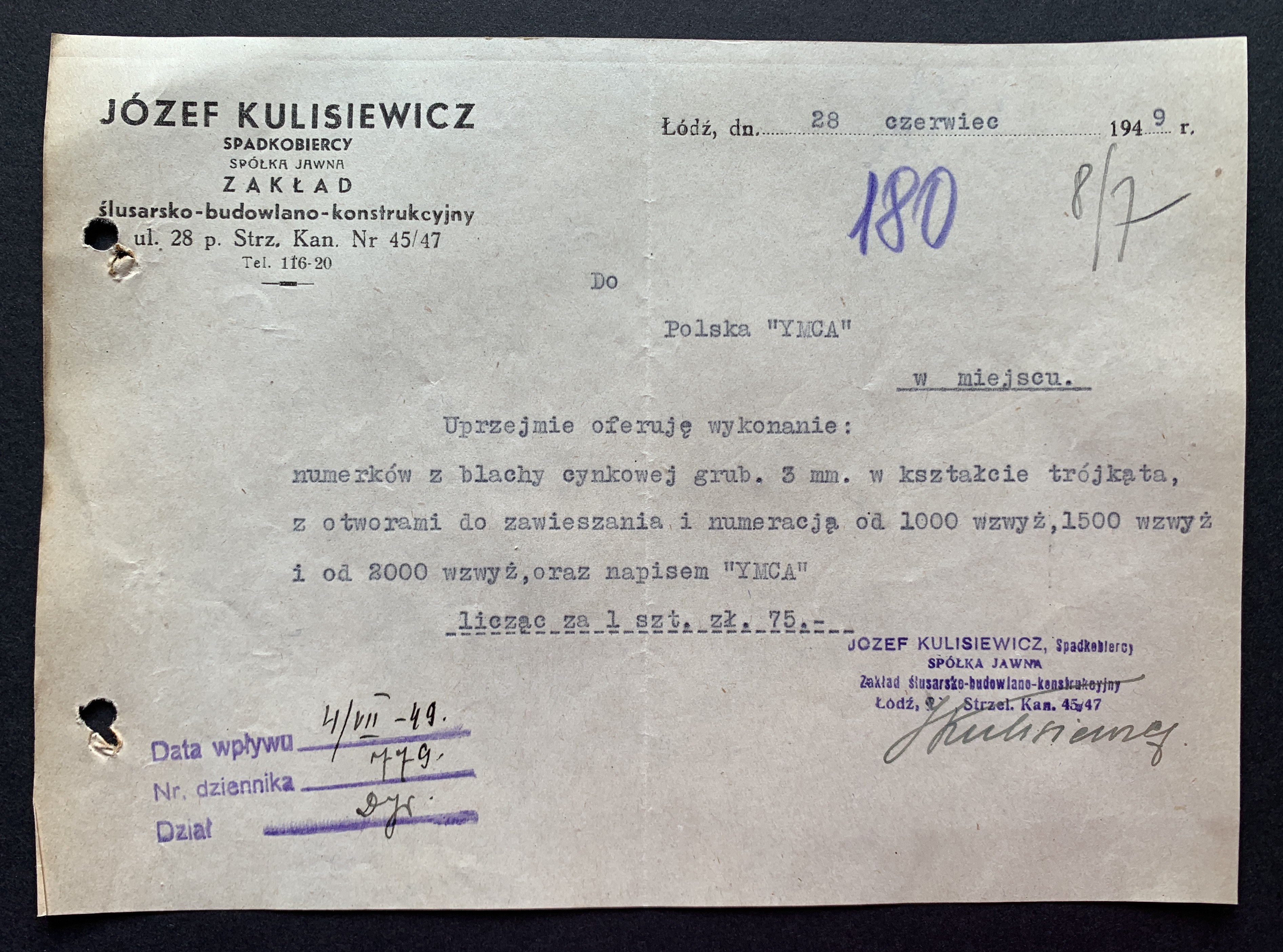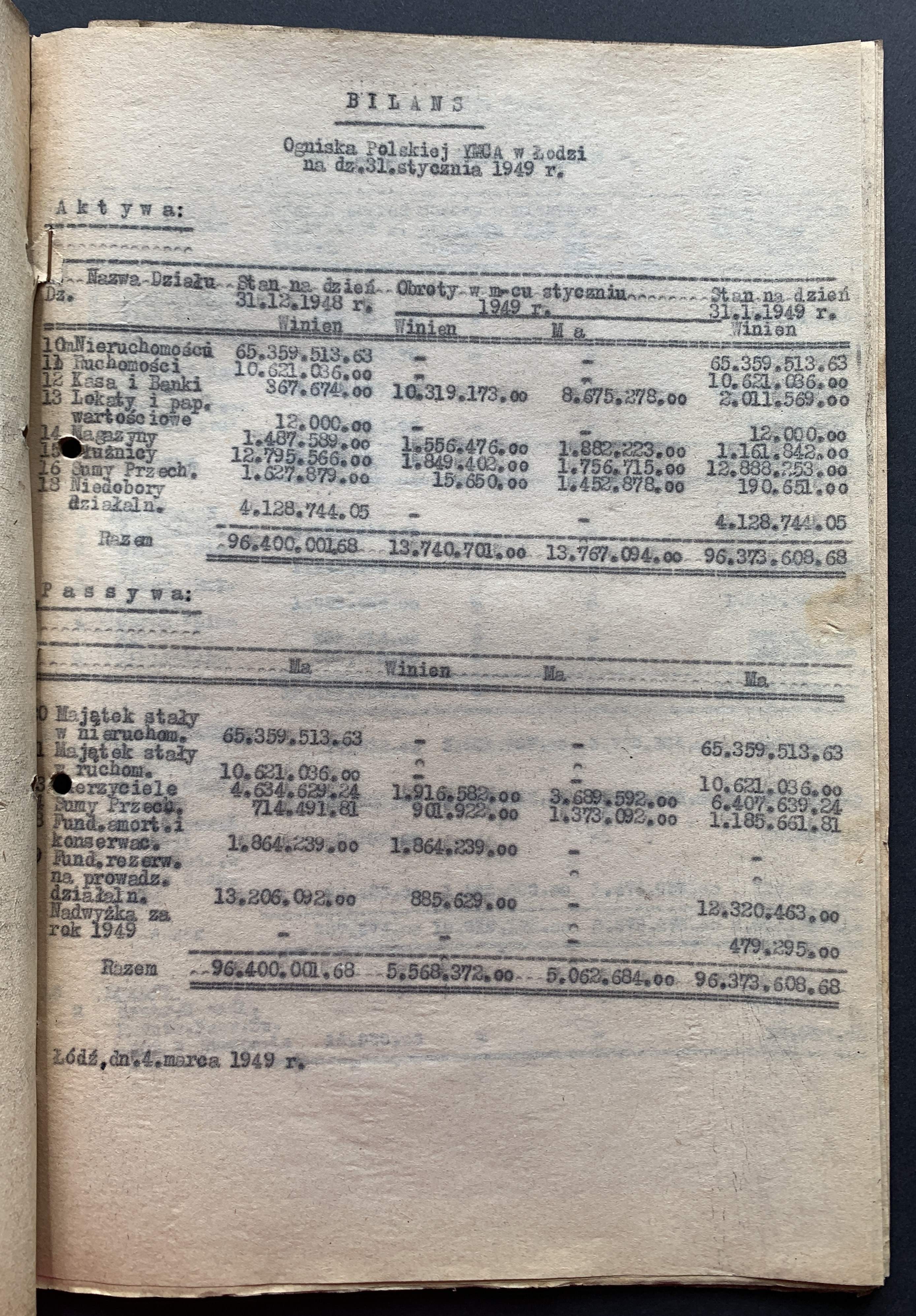 Zestaw 40 dokumentów dotyczących działalności Polskiego Oddziału Y.M.C.A. w Łodzi: korespondencja handlowa, umowa najmu Łódzkiego Stowarzyszenia Śpiewaczego „Mannergesangferein", Bilans finansowy Ogniska Polskiego YMCA w Łodzi za miesiąc styczeń 1949, dwa Świadectwa Kursów Doszkalających dla Dorosłych z 1947 roku, Telegram z 1947 roku,